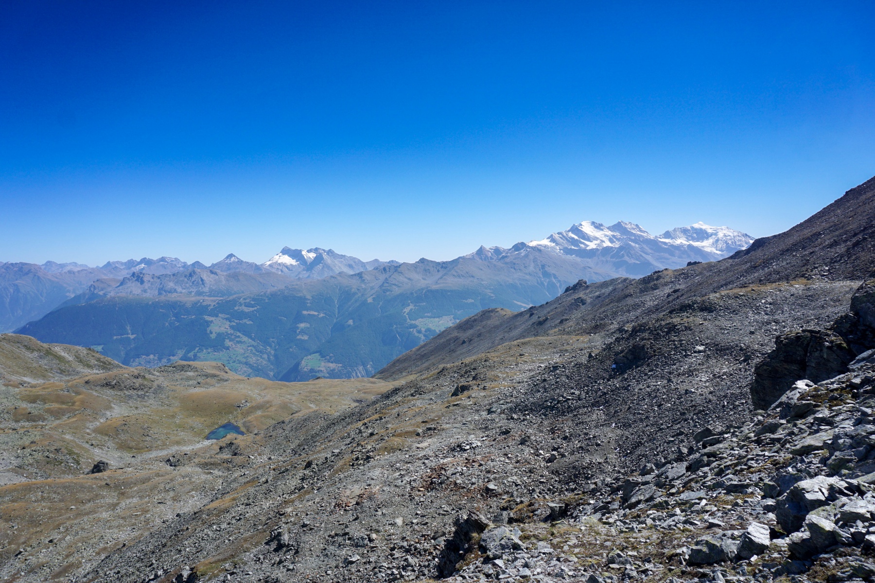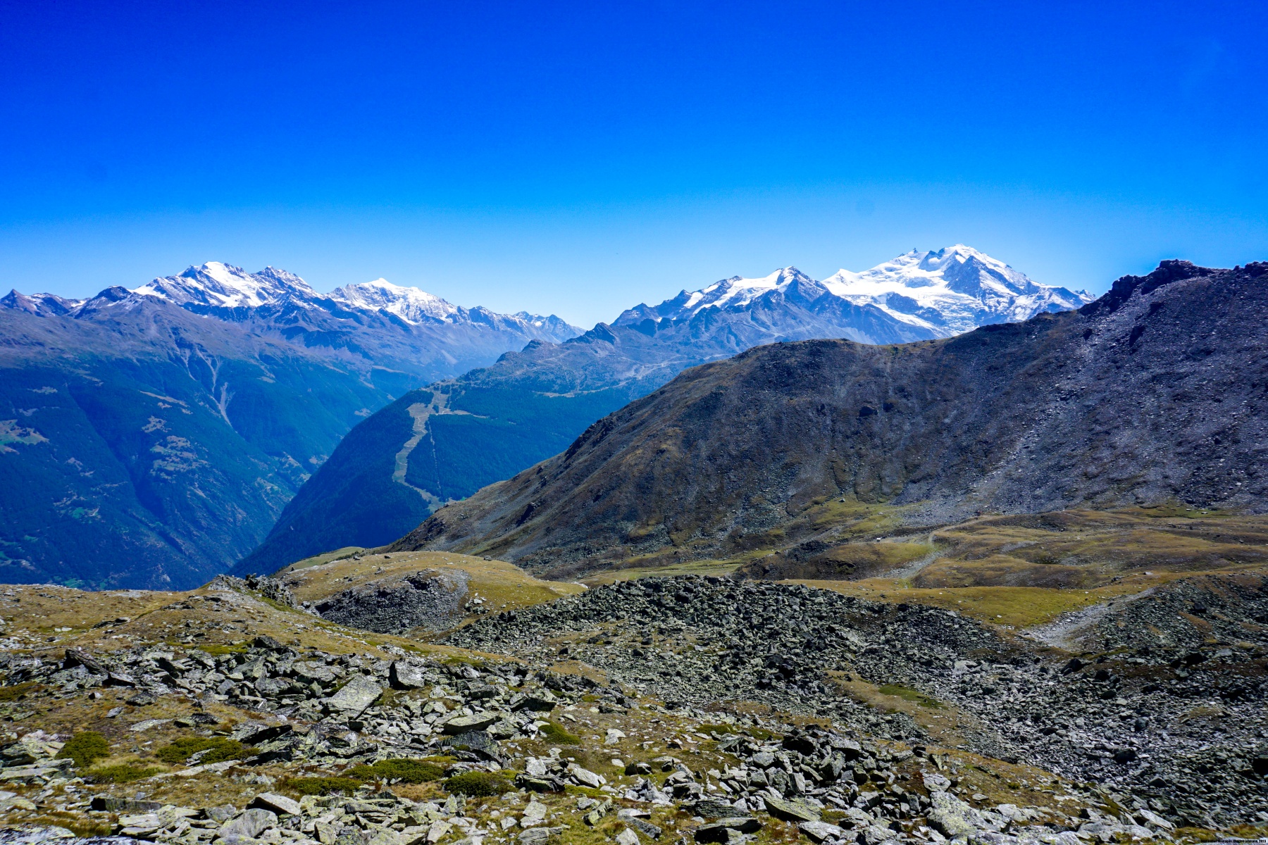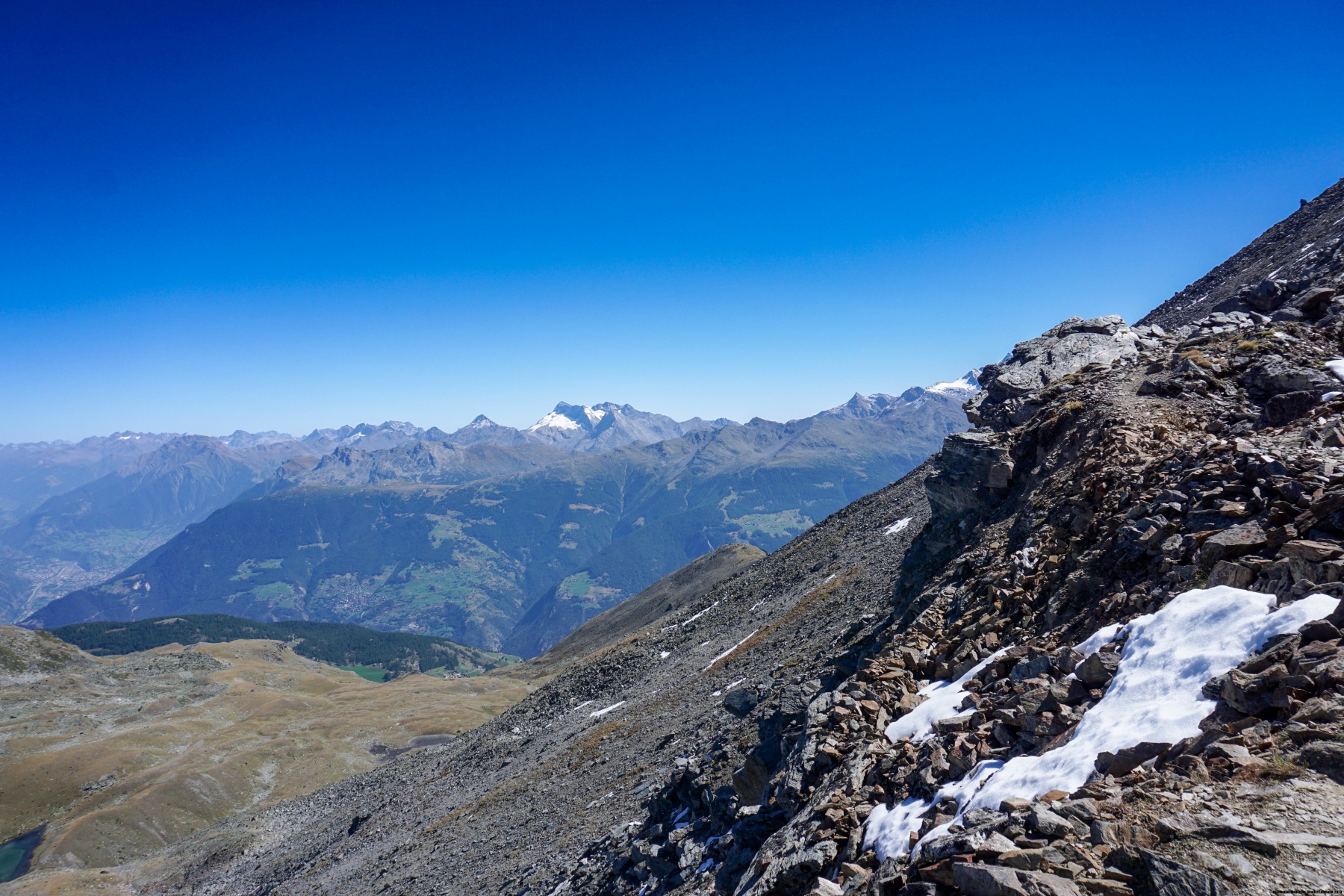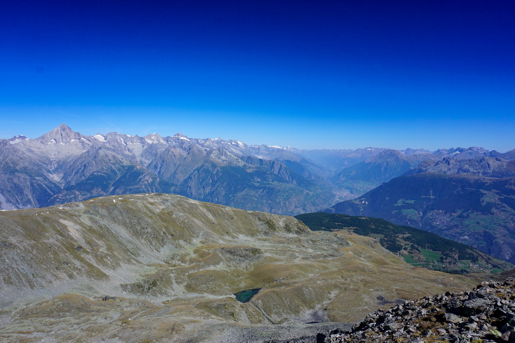 This is a beautiful destination in the Alps of Valais. Indeed, this almost 3000m high top offers a breathtaking view of most of the surrounding mountains, be it those of the Bernese Alps with the Bietschhorn, the Gotthard Massif with the Galenstock or the 4000 of the Valais Alps. The Lagginhorn and the Weissmies, as well as the Mischabel mountains, can be seen across the valley. At the end of the valley, you can see the Klein Matterhorn and the Breithorn, and further south-west you can also see the summit of the Weisshorn.
