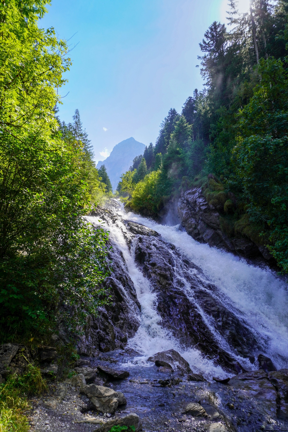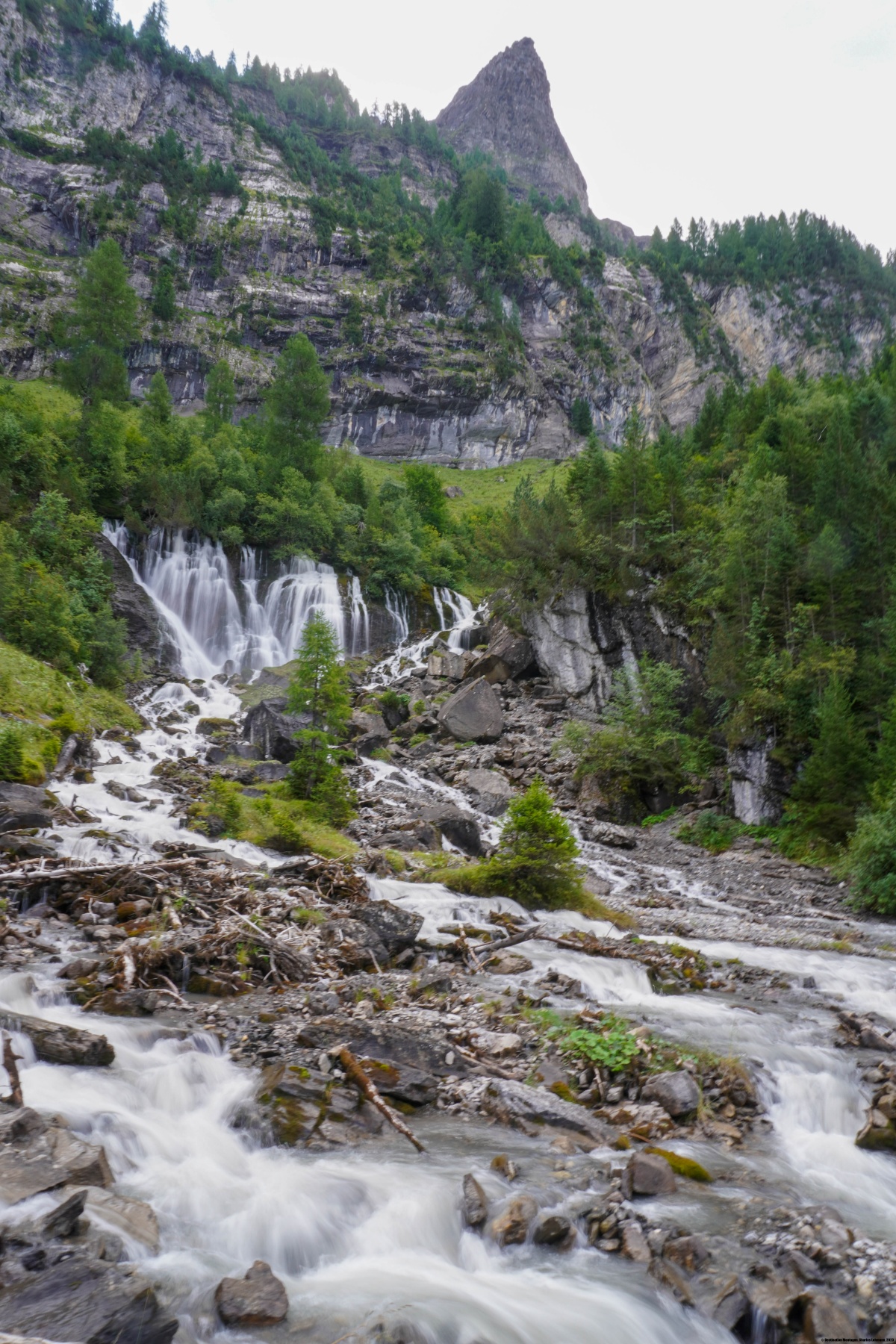 Depuis le bout de la vallée, deux sentiers sont possibles. Mais il est avantageux de suivre celui qui longe la cascade au plus près. On subit alors des embruns assez forts par endroits. Plus haut, à la Barbarabrücke, on se fait copieusement asperger. Après le pont, on retrouve l’autre cheminement, qui suit alors un chemin carrossable assez raide par endroits. Après avoir rejoint une zone bien plus plate, on ne tarde pas d’atteindre la buvette d’alpage du Rezlisbärgli. Il vaut alors la peine d’aller voir les Sibe Brünne (les sept fontaines), où l’eau ressort directement de la paroi de rochers.