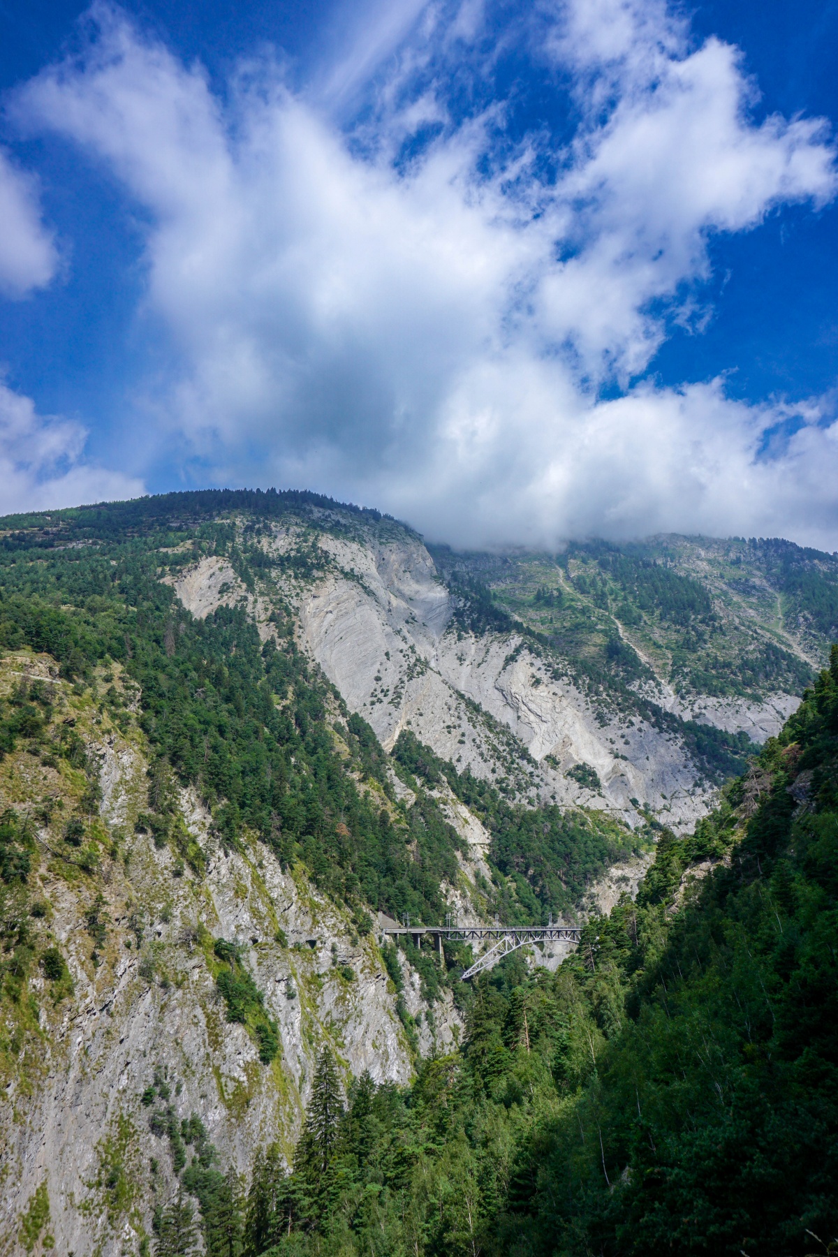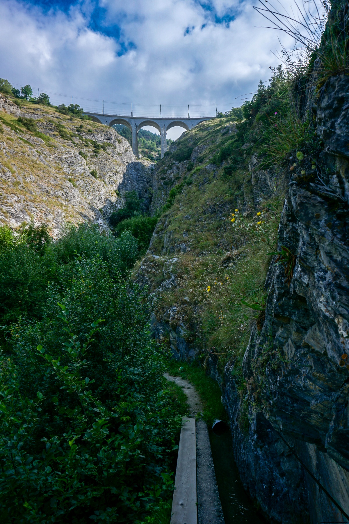 From the Hohntenn station, you can follow the railway line directly. This way, you pass by the impressive Lüegilchiviadukt. However, you are not on the Sun Trail. To get to the Sun Trail, you must go back a little and then go down to the top of the village of Hohntenn. From there, you follow the Stägeru Süe up to the intake of the Jolibach. A cleverly arranged series of stairs and bridges allows you to gain altitude and cross over to the other side. The noise in this gorge is deafening.