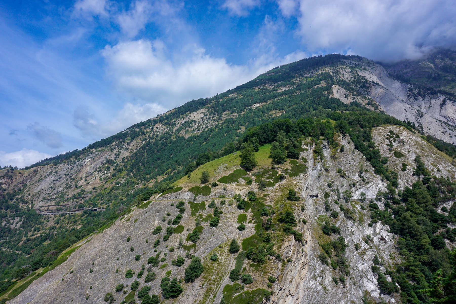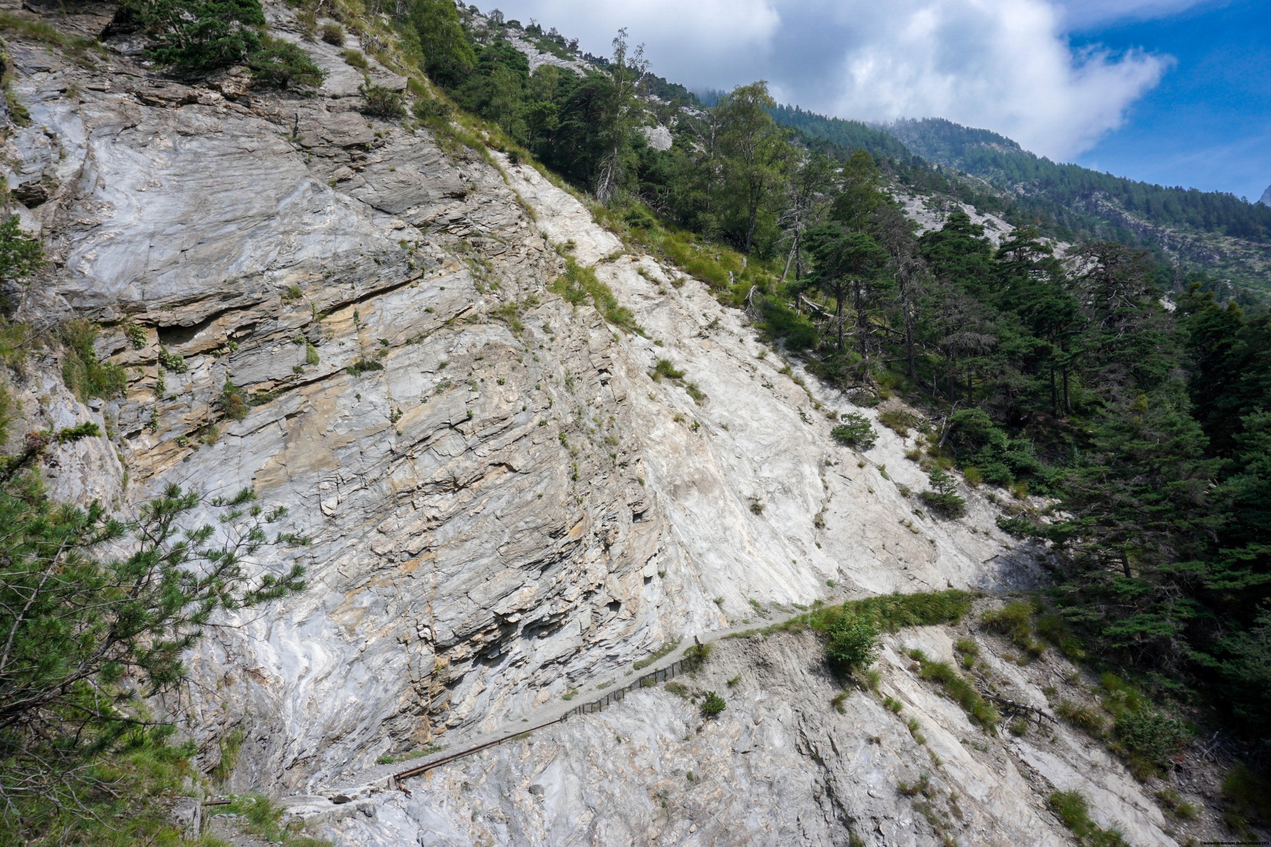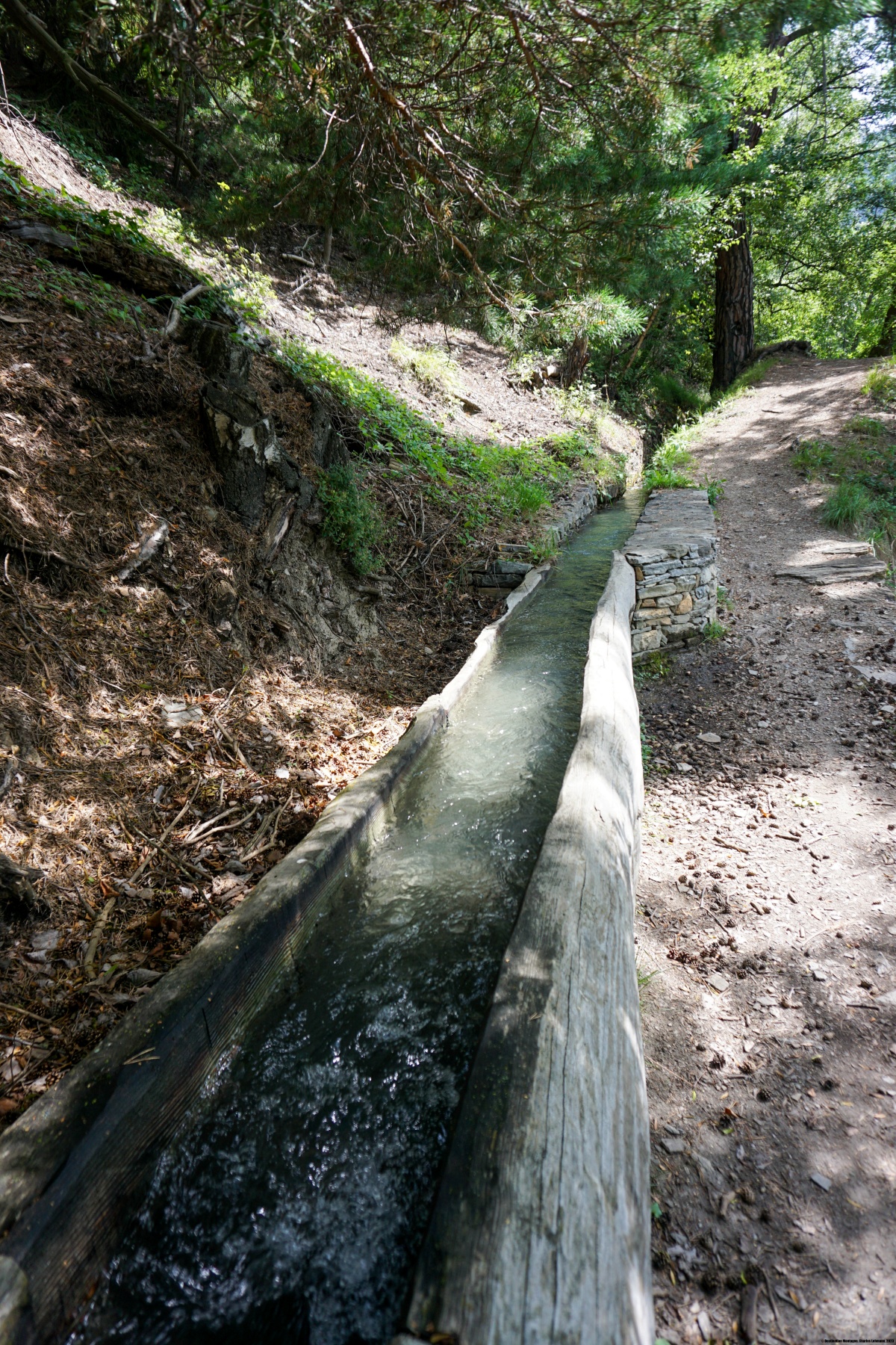 After this section and a slight climb, you cross the hillside in a rather barren environment until you reach a flat area where the small Chrüterbeizli restaurant is located. The official trail then follows a mud road to the Bietschbach Viaduct. However, for the sake of the landscape, it is worth going up a little to Ritzibodo and following a bit of the Kummera. The name Kummera means something like „the bisse of the Rarnerchumma“. On the way back up the valley, you pass under the impressive Bietschbach Viaduct.