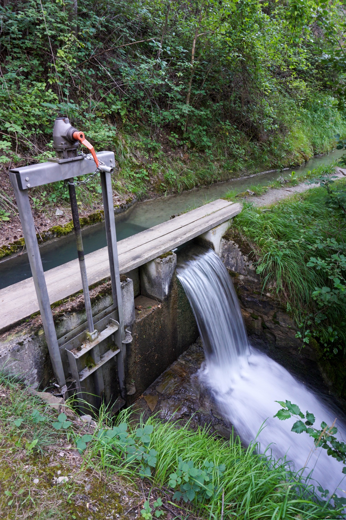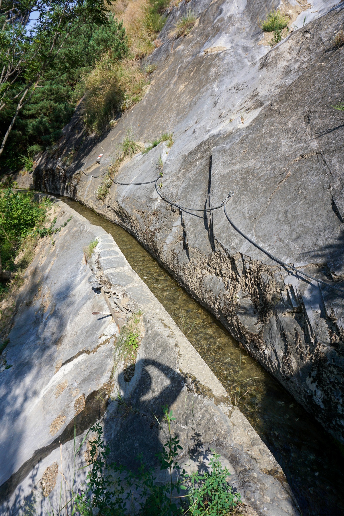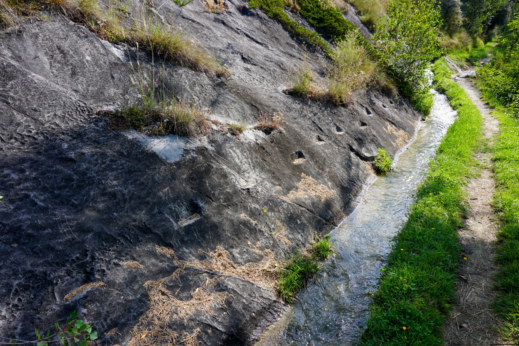 After this section and a slight climb, you cross the hillside in a rather barren environment until you reach a flat area where the small Chrüterbeizli restaurant is located. The official trail then follows a mud road to the Bietschbach Viaduct. However, for the sake of the landscape, it is worth going up a little to Ritzibodo and following a bit of the Kummera. The name Kummera means something like „the bisse of the Rarnerchumma“. On the way back up the valley, you pass under the impressive Bietschbach Viaduct.