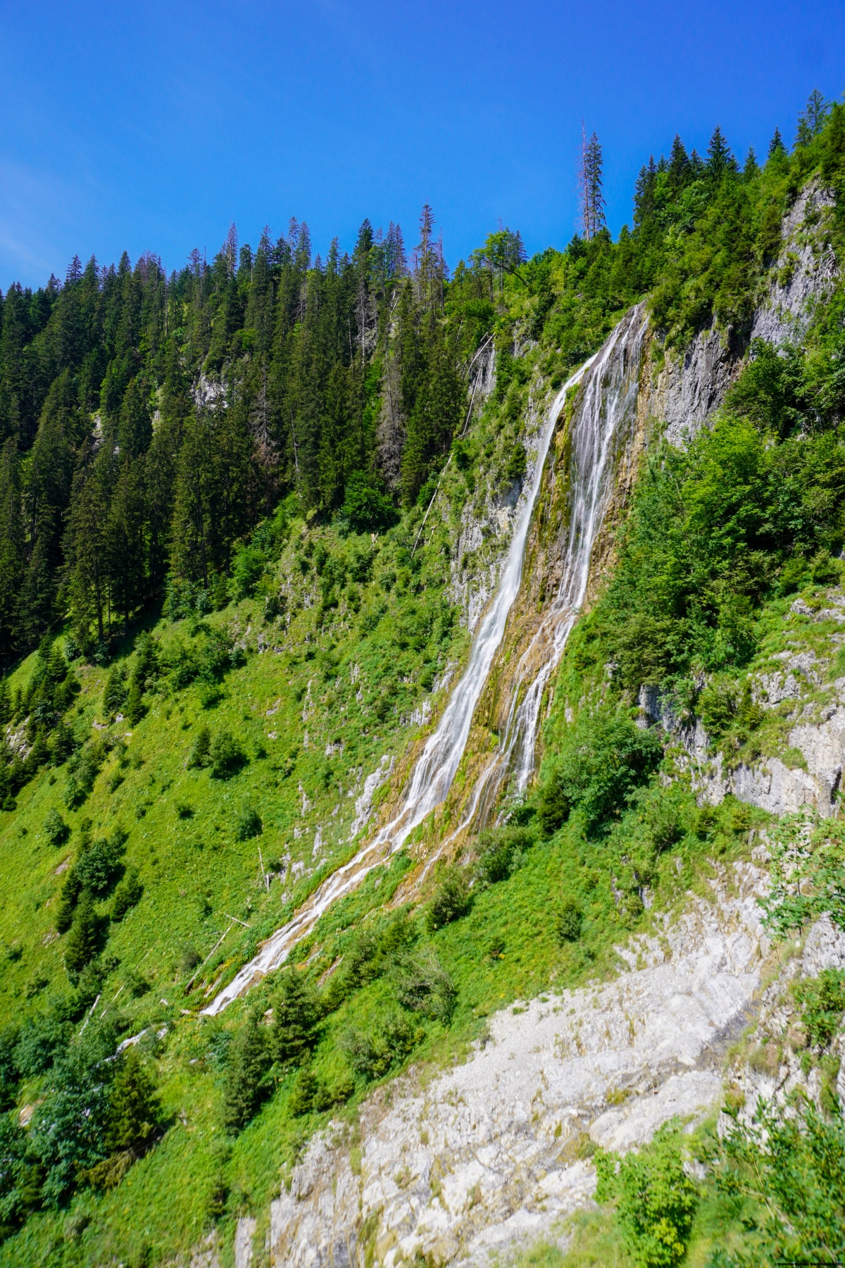 Nous avons entrepris la descente en passant par le Morgetepass et l’alpage de Morgete avant de suivre la route en terre battue et poussiéreuse. Un endroit vaut particulièrement une visite : le virage depuis lequel on voit la cascade du Faal. Heureusement, on peut éviter un tronçon de route en suivant le sentier balisé passant par Schönebode, car en suivant la route, on absorbe passablement de poussière à chaque passage de véhicule.