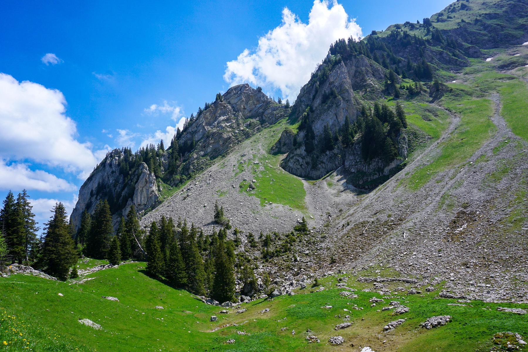 After passing near a stable, you climb again to reach the foot of the Türmli. We then cross the steep slopes dominated by high walls. The impact marks around the trail suggest that rockfall must happen here quite regularly. So, it’s a matter of not lingering too long. At the end of the crossing, we still must cross an inconvenient area of scree. Fortunately, this end is very short.