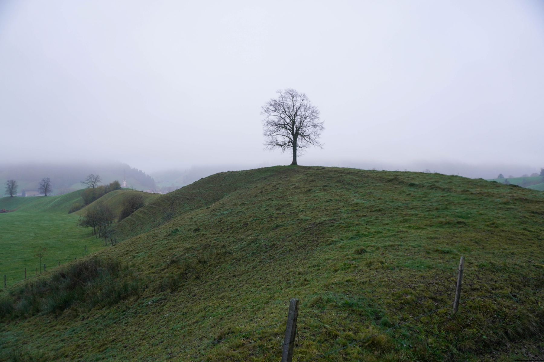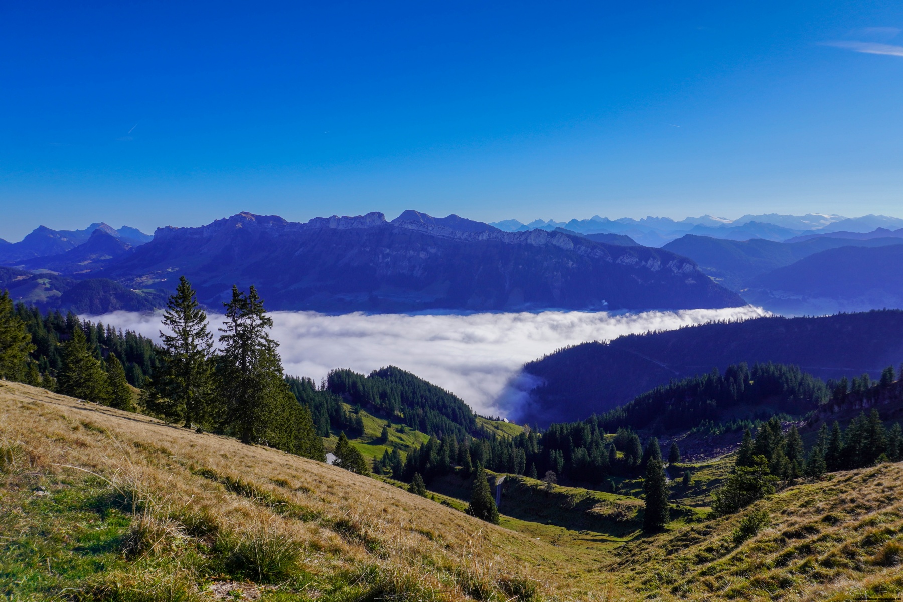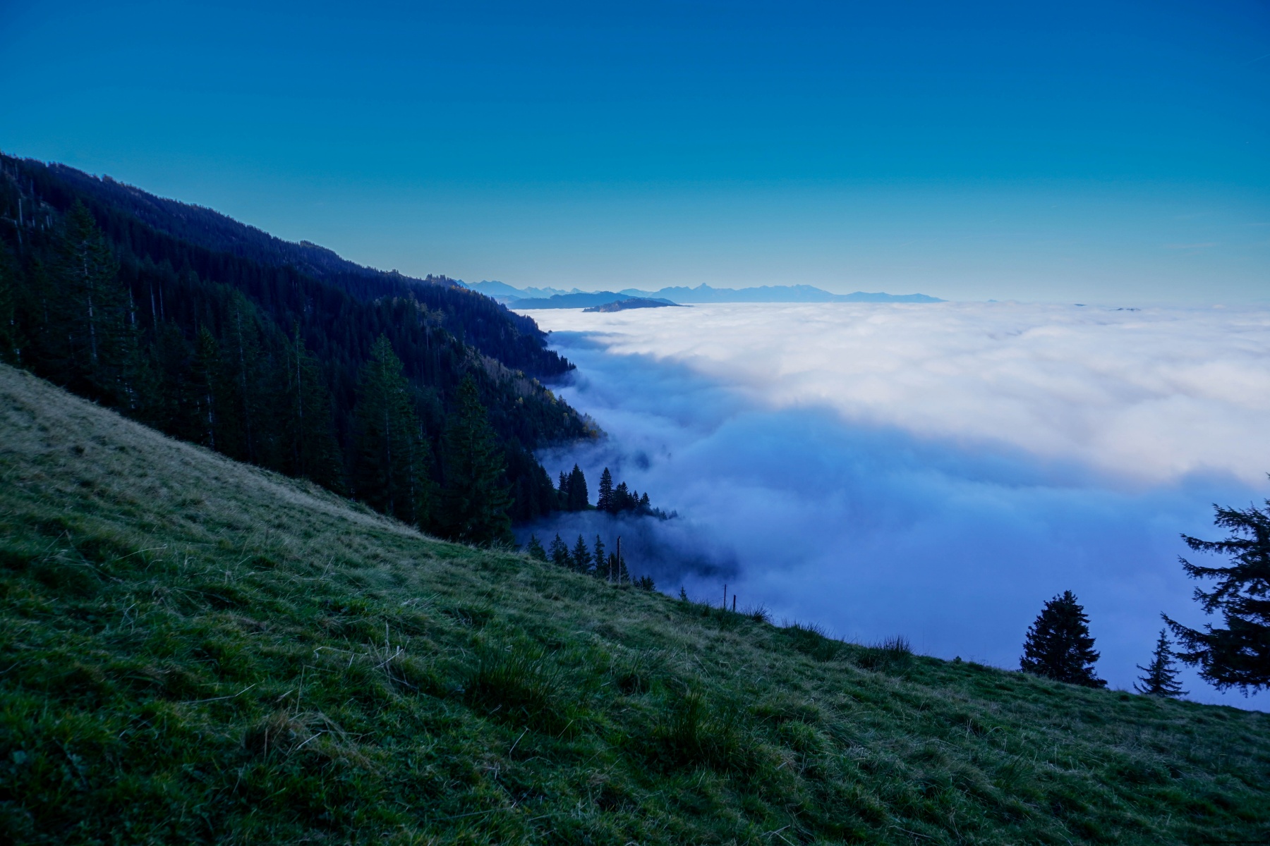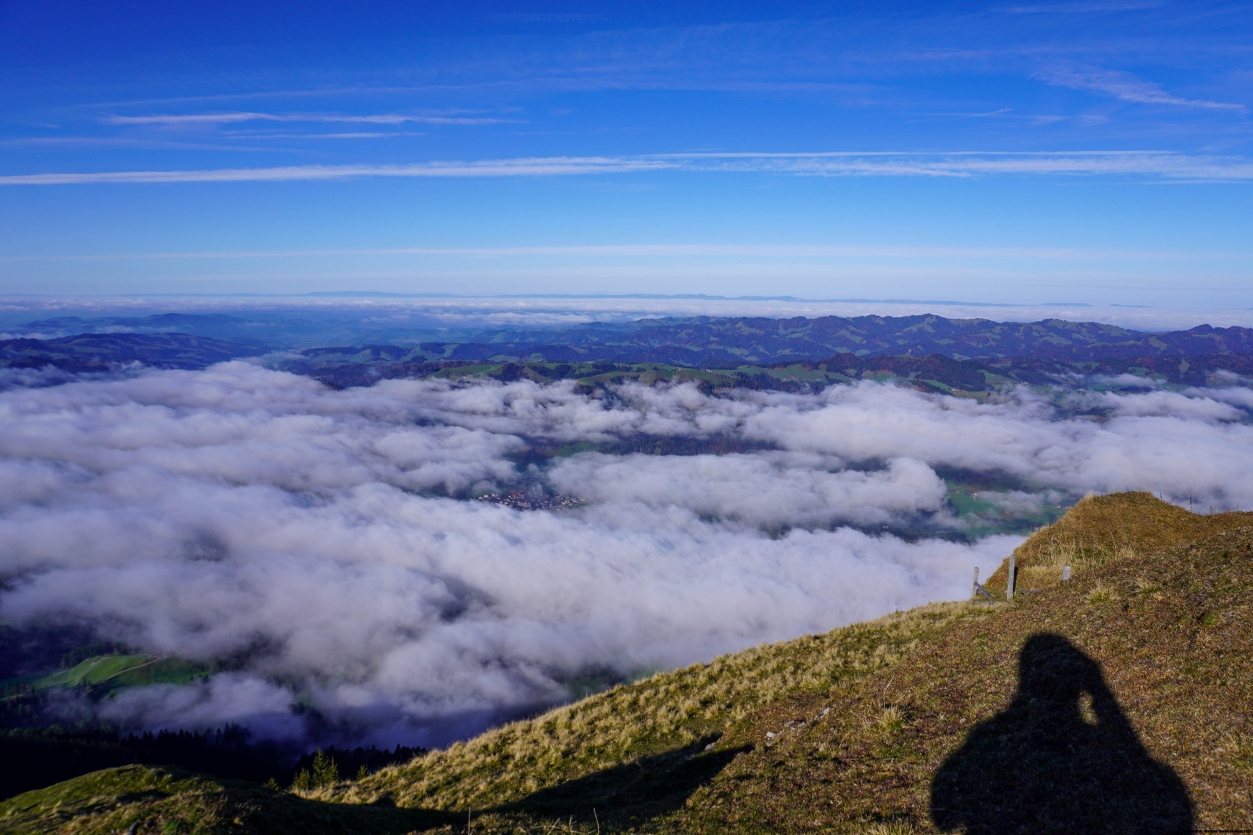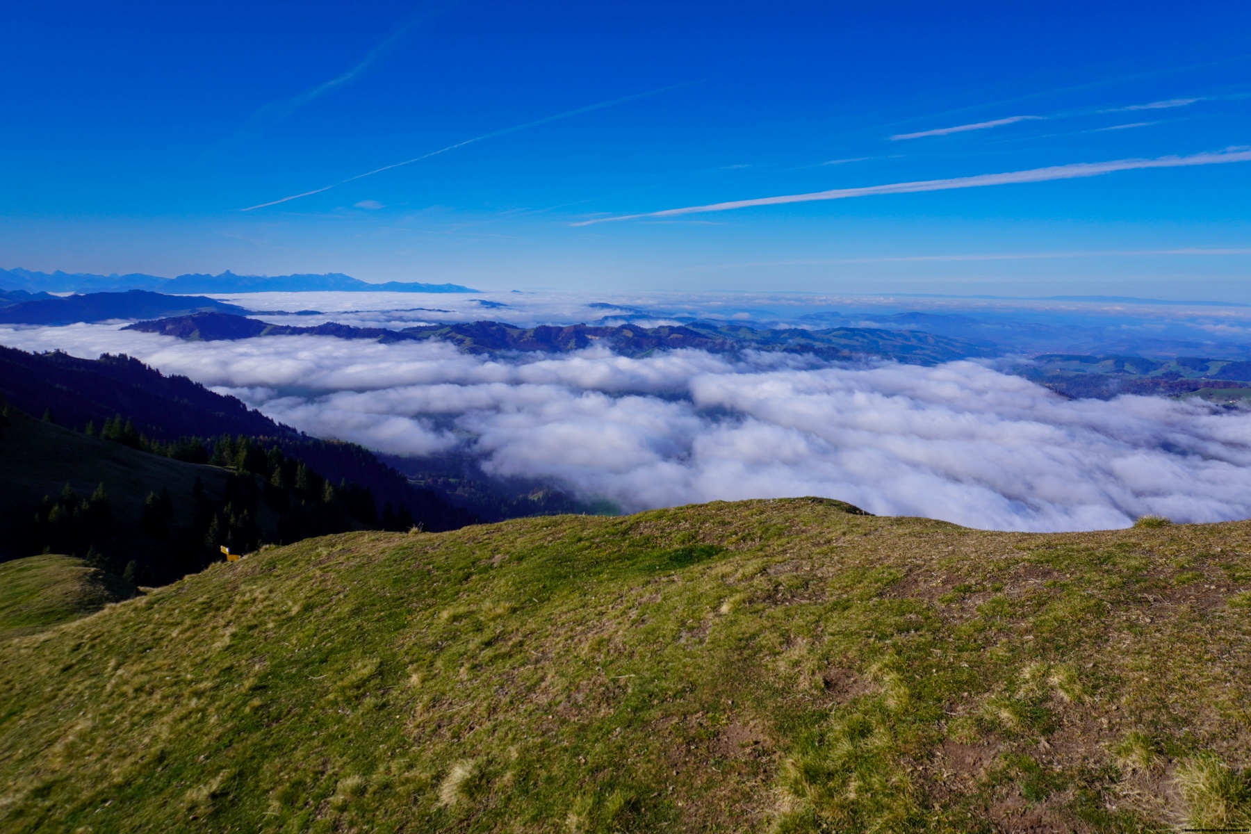 From Escholzmatt station, you first must walk a short stretch of paved road for less than a kilometre. It is not very pleasant, but there is no other option. The path branches off when you reach the Hünigerhof farm, and it climbs up, first through meadows and then through the forest. At one point, after following a ridge, the path drops down to a small pass before climbing up again towards Schwand. After this point, you follow a small ridge to the left. From here, it gets steeper and steeper. The weather forecast was wrong, and instead of the stratus clouds clearing at 900-1000 metres, they cleared at this point, about 200 metres higher. After crossing a small alp, you reach another ridge, where you must climb over a small rocky outcrop. A little higher up, you reach a small clearing where the ground is surprisingly flat: this is the last place to catch your breath before the final climb. You must climb over a few rocky sections, where cables help you along.