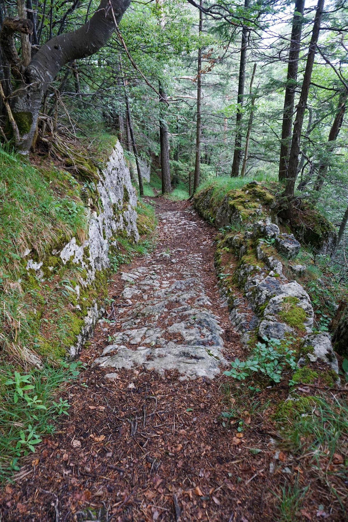 After passing by the Raimeux de Grandval (there is a refreshment place), we started the long descent towards Grandval. At the beginning, along the rocky ridge, you can admire a stretch of ruts road. This road had, because of the ruts, been considered a Roman road, because anyone who said „ruts“ meant „Roman road“ (until the 1980s). This was before it had been proved that ruts were created naturally when loaded carts with their hemmed wheels were lowered, and for a relatively short period of time (a few decades). Thus, this stretch of road is not Roman, but probably dates from the 18th century. In addition, the gauge and gradient of the road would not have allowed large chariots to pass. This is probably a road that had been used for farming.