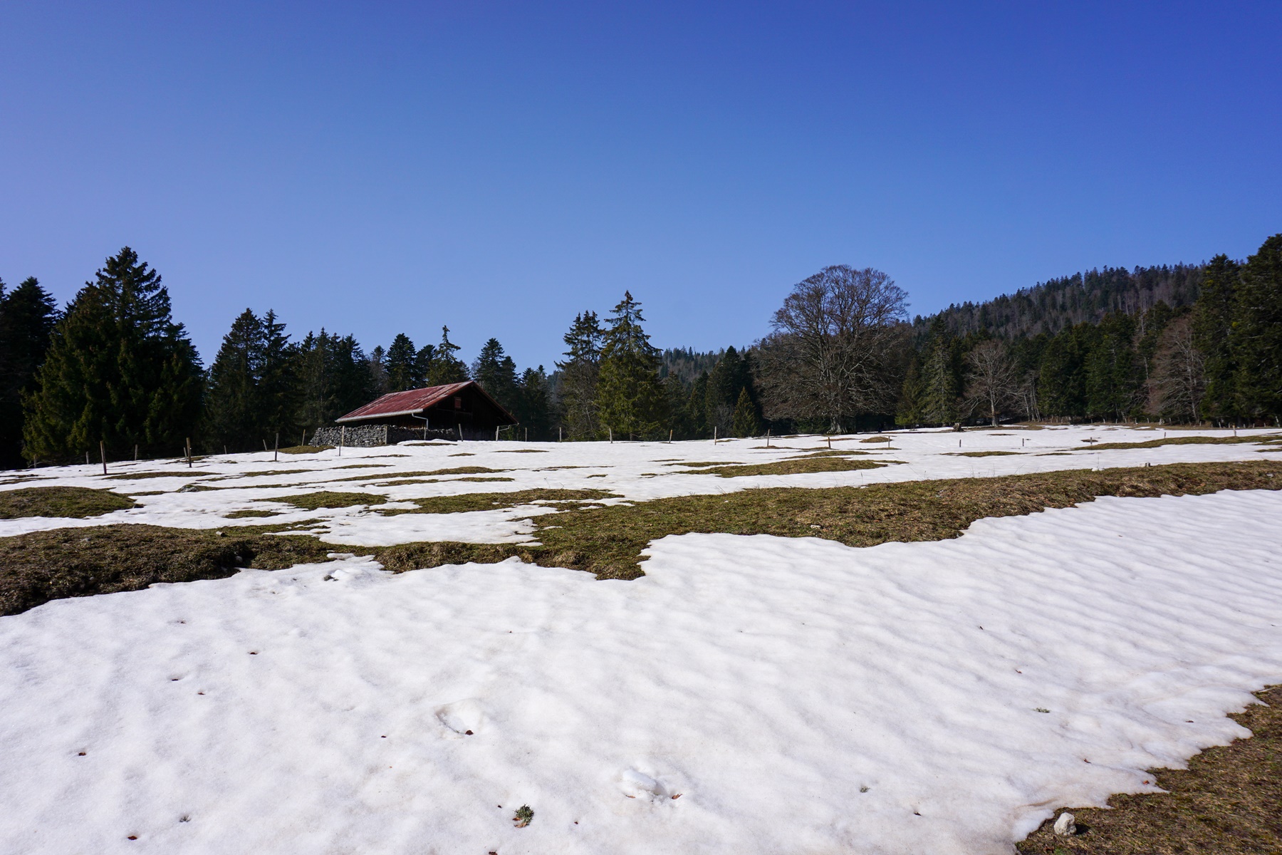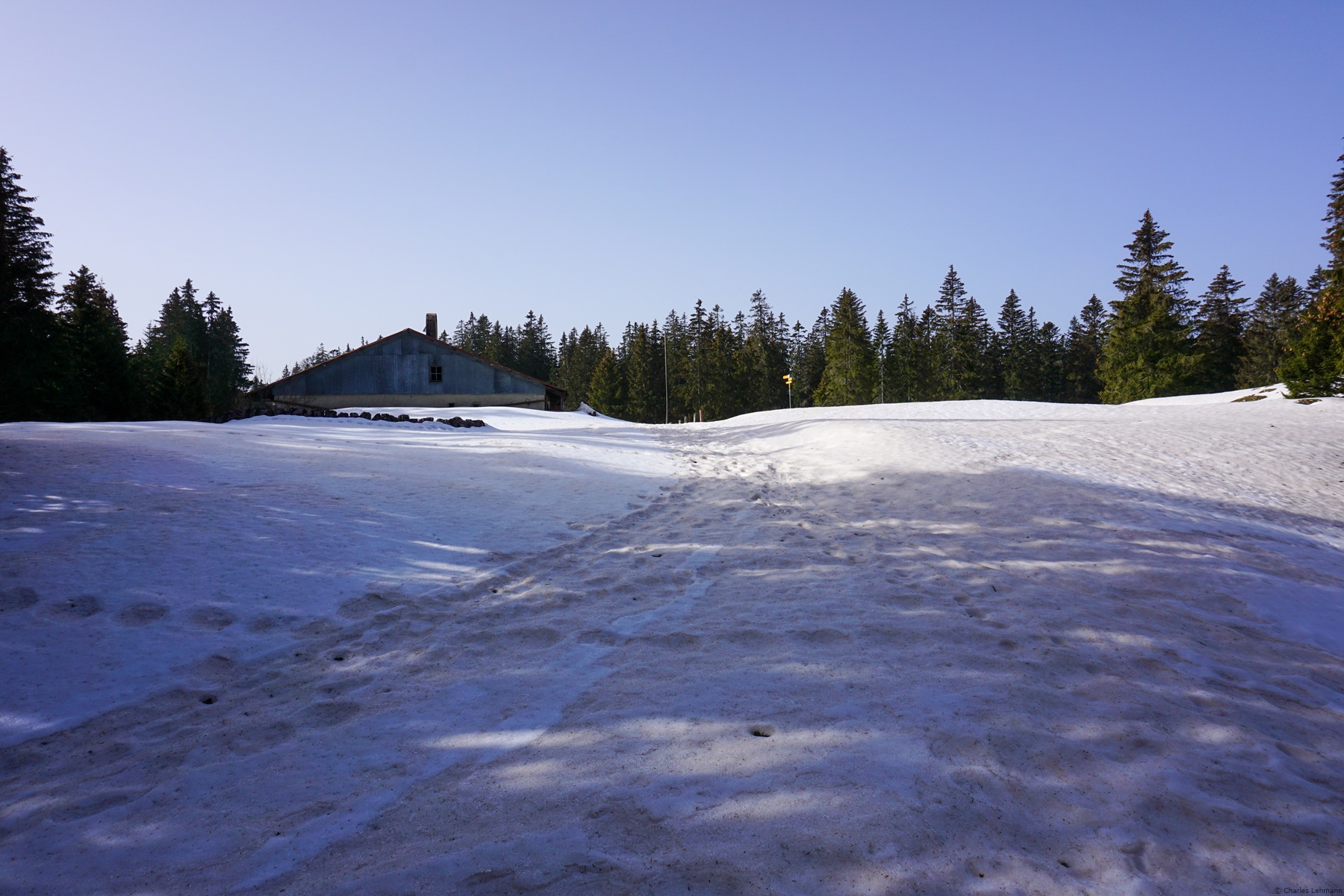 Von Marchissy aus folgte ich der gleichen Route bis zum Echadex und nahm dabei insbesondere die Abkürzungen der Route des Montagnes. Nachdem ich an der Echadex-Hütte vorbeigekommen war, folgte ich der Strasse, um sie etwas höher zu verlassen und dem Waldweg zu folgen, der ganz in der Nähe der Perroude de Marchissy führt. Bei dieser Hütte (die im Sommer als Ausschank dient) gelangt man auf die Crêtes du Jura-Route. Folgt man ihm einfach, um den Crêt de la Neuve zu erklimmen.