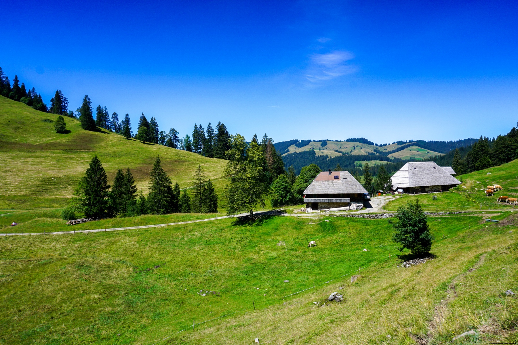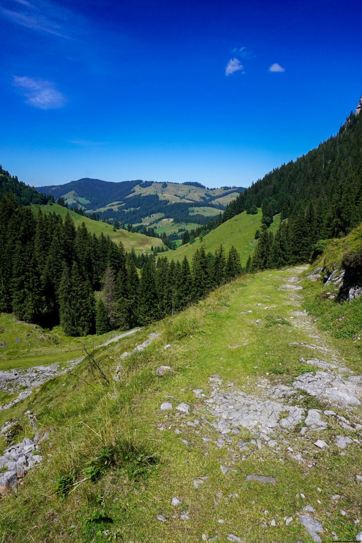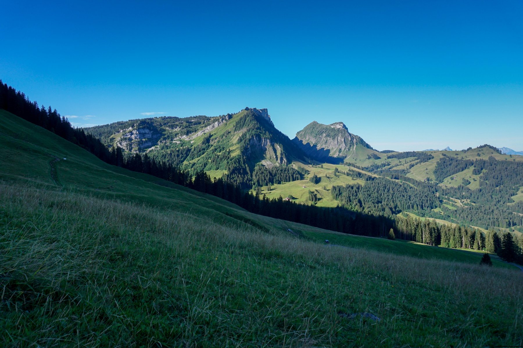 Von Eriz aus führt ein guter Weg über den Höhenrücken zwischen Chaltbach und Fallbach hinauf zur Fahrbahn, die zum Unteren und Oberen Breitwang führt. Von dieser letzten Hütte aus beginnt es ernst zu werden. Der Hang wird immer steiler, um die Weide zu erklimmen, bevor er fast flach nach links geht. Einige Stellen bieten keine Probleme, erfordern jedoch Wachsamkeit und sollten bei Unwettern vermieden werden. Nach der Querung steigt der Weg weiter steil an und erklimmt einige Felsen, auf denen man mit den Händen Gleichgewicht suchen muss. Wir empfehlen ihnen, die steilen Grashänge der Bänder genau zu beobachten: Dort können sie oft Tiere beobachten.