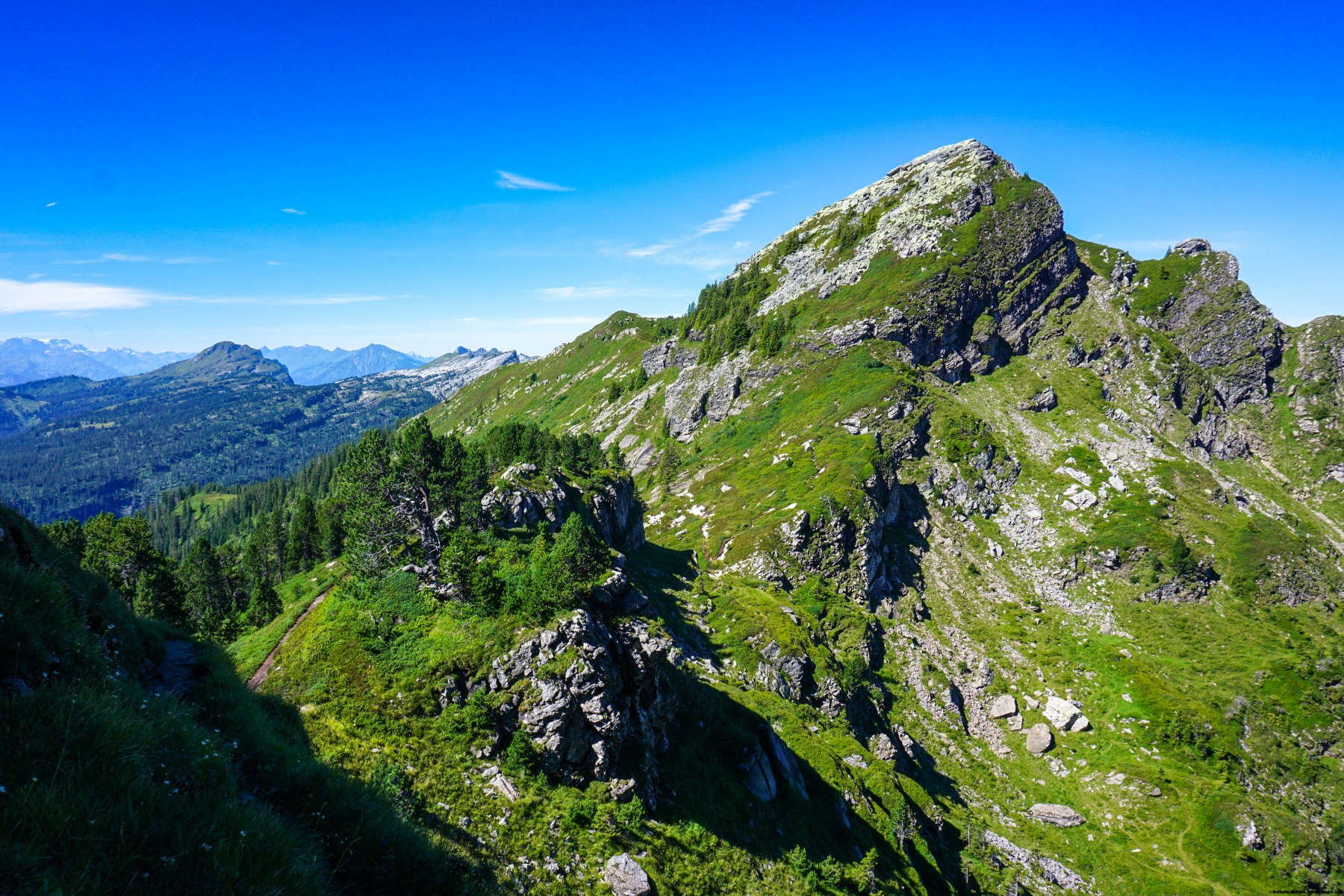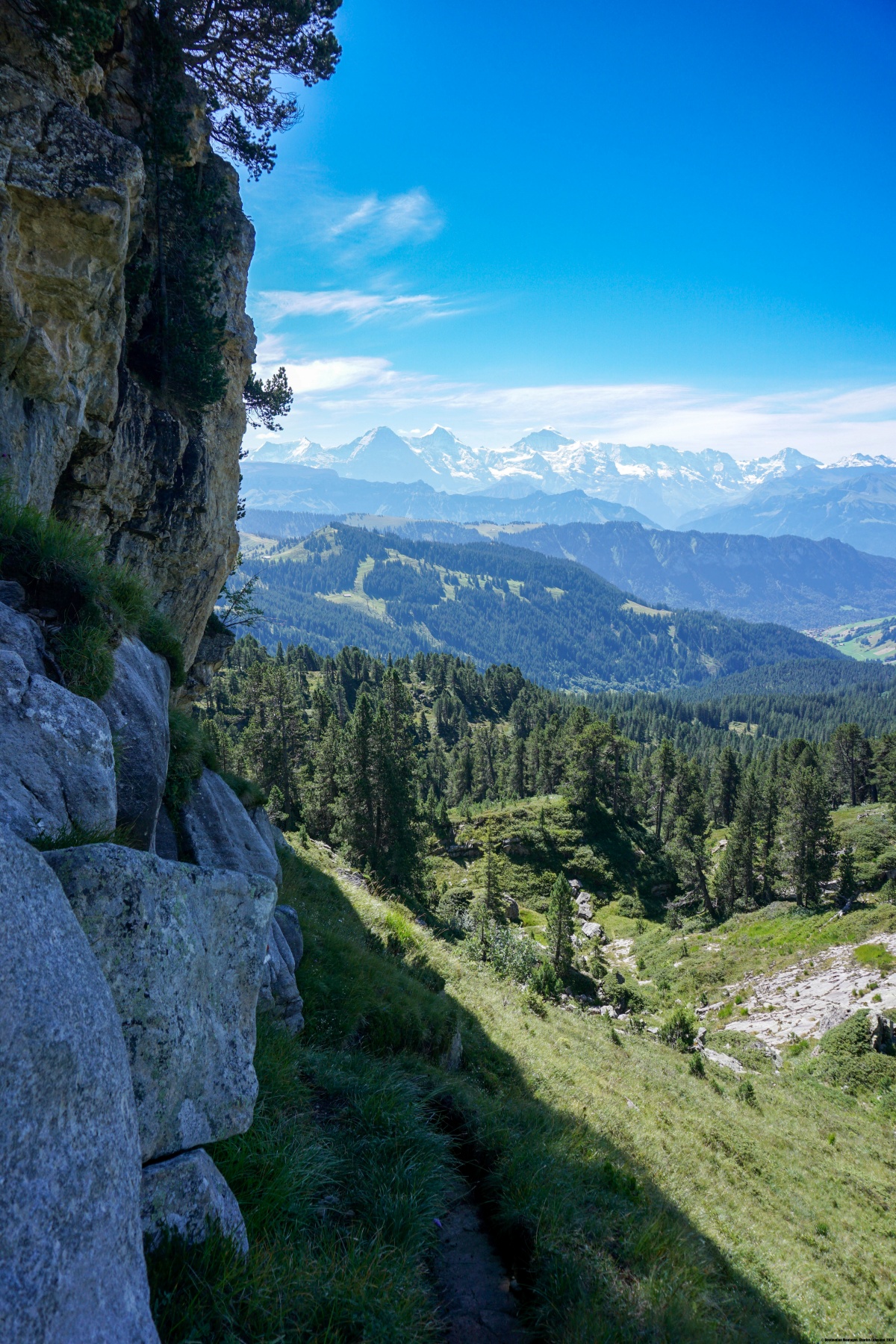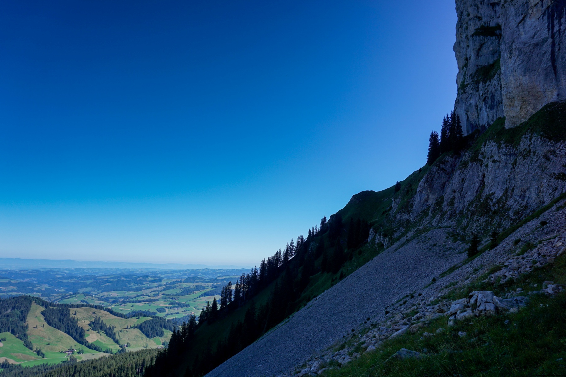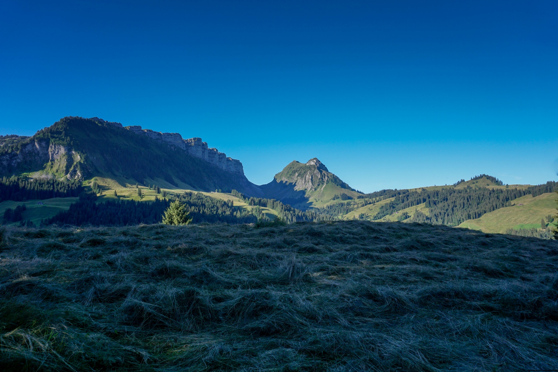 Von Eriz aus führt ein guter Weg über den Höhenrücken zwischen Chaltbach und Fallbach hinauf zur Fahrbahn, die zum Unteren und Oberen Breitwang führt. Von dieser letzten Hütte aus beginnt es ernst zu werden. Der Hang wird immer steiler, um die Weide zu erklimmen, bevor er fast flach nach links geht. Einige Stellen bieten keine Probleme, erfordern jedoch Wachsamkeit und sollten bei Unwettern vermieden werden. Nach der Querung steigt der Weg weiter steil an und erklimmt einige Felsen, auf denen man mit den Händen Gleichgewicht suchen muss. Wir empfehlen ihnen, die steilen Grashänge der Bänder genau zu beobachten: Dort können sie oft Tiere beobachten.