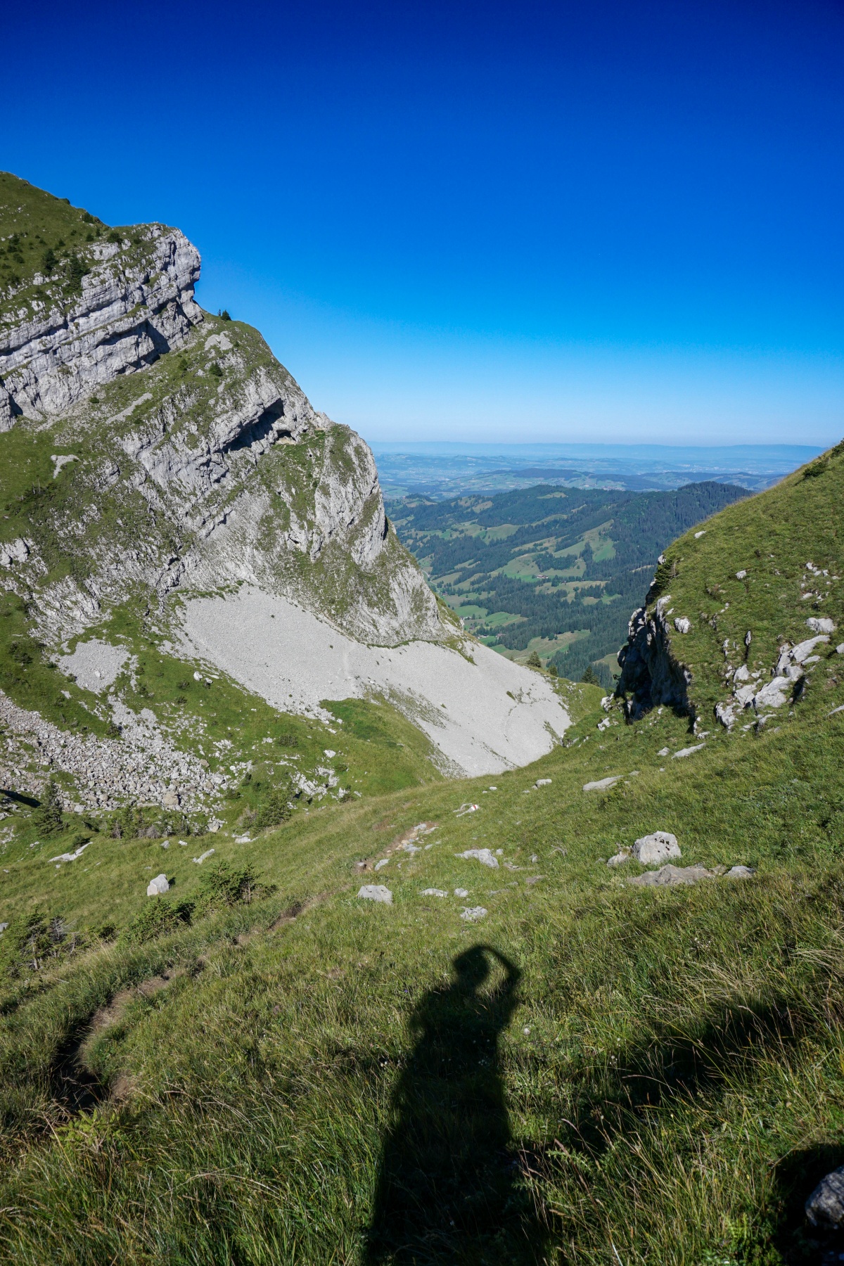 Dann beschlossen wir, die Chrinde, einen Trichter oberhalb der Oberen Breitwang, hinaufzusteigen, um den Westgipfel des Hohgant zu besteigen. Zudem hatten wir damit gerechnet, dass die Aussicht vom Westgipfel aus nicht ganz breit sein würde und wir den weiter östlich gelegenen Nachbargipfel mit 2070 m Höhe erklimmen müssten.