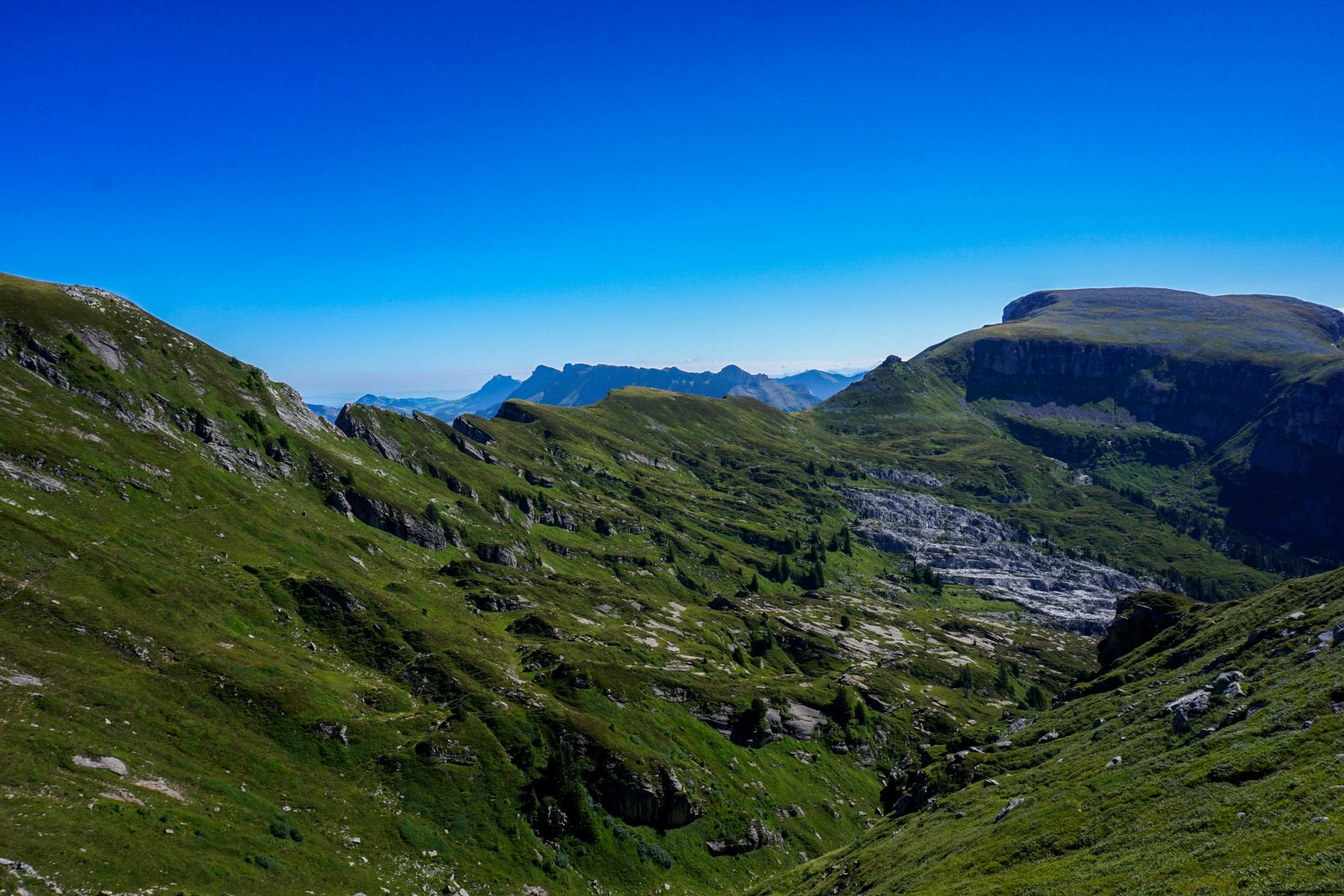 Nach dem kurzen Abstieg vom Trogenhorn folgten wir dem Weg entlang des Arnigrats hinunter. Flache Passagen wechseln sich mit recht steilen Hängen ab, bei denen es nicht immer leicht ist, die beste Route zu finden. Glücklicherweise ist dieser Abschnitt kurz und es dauert nicht lange, bis man die Arni-Alp erreicht, wo man einen guten Weg findet.