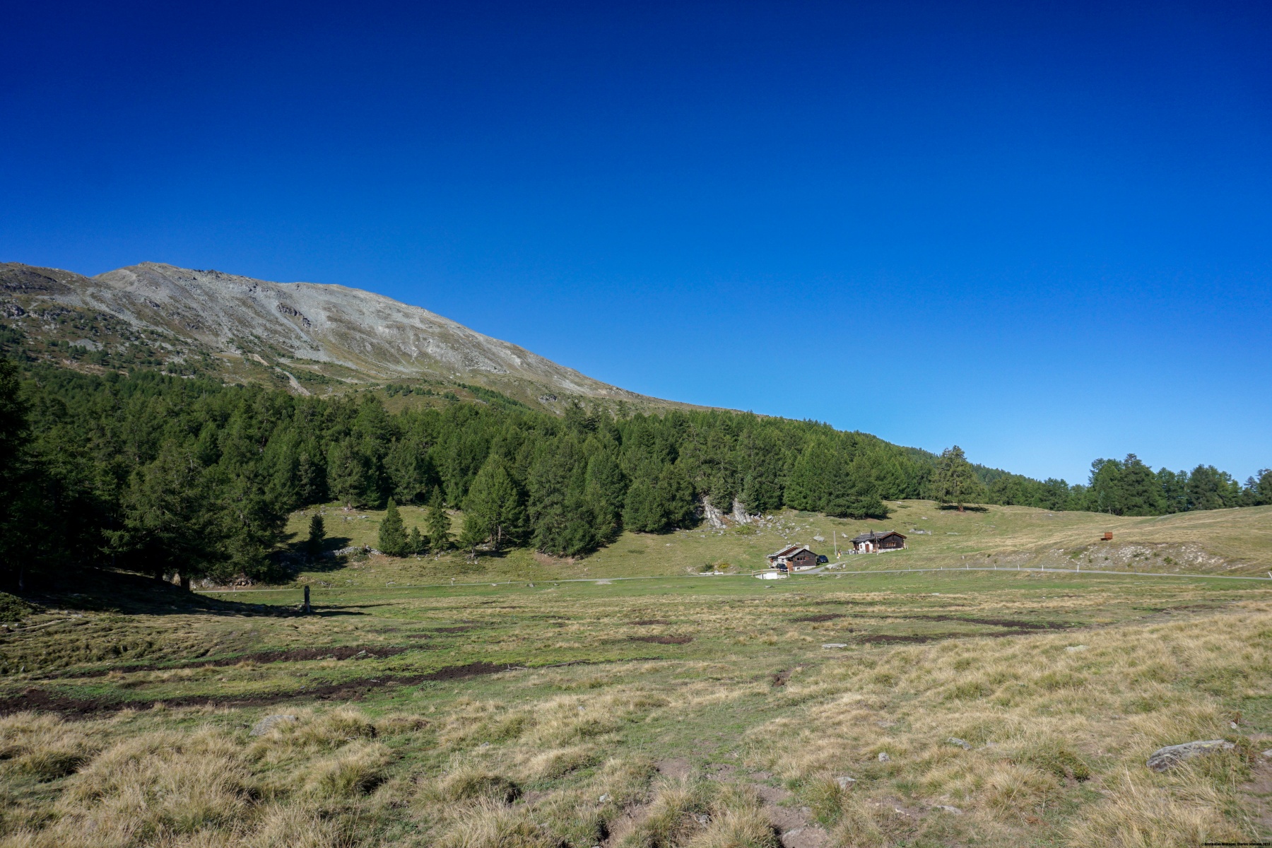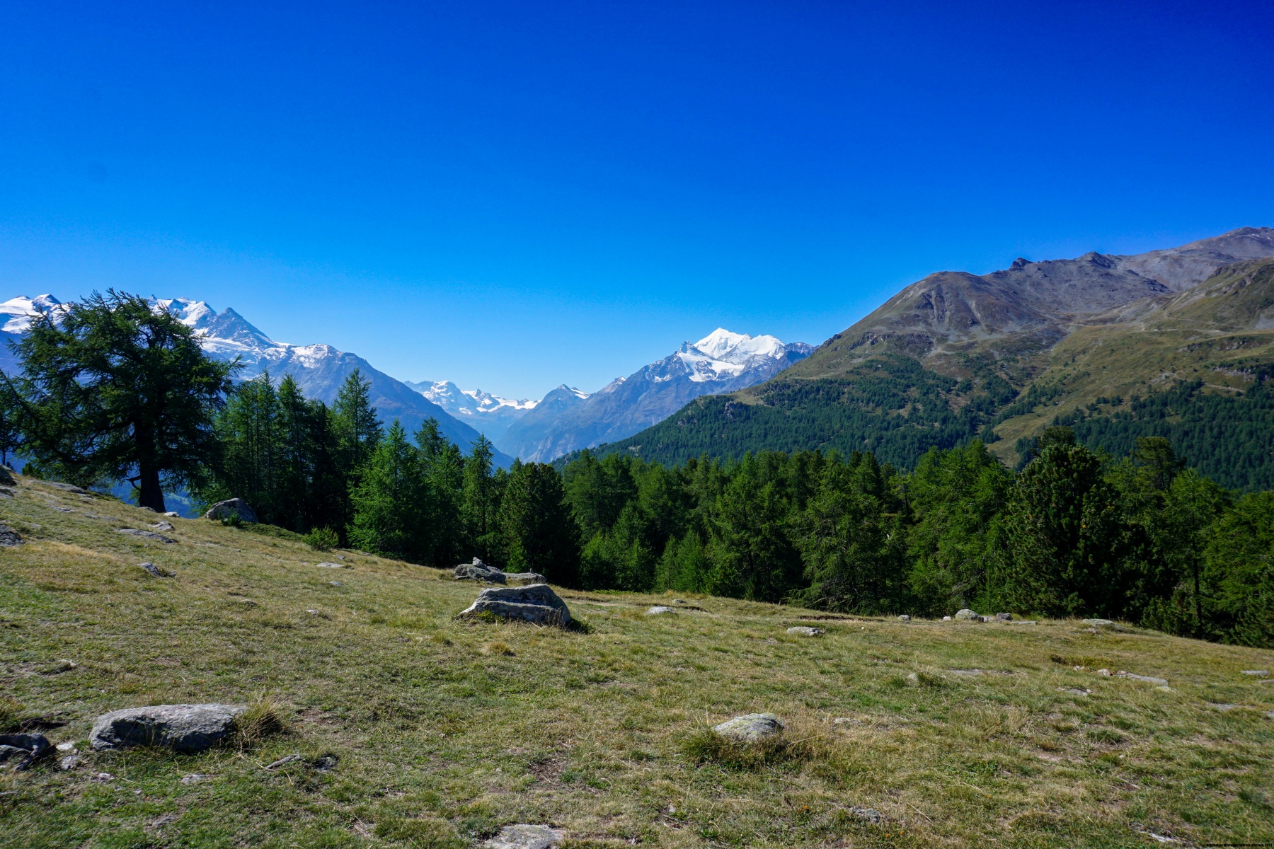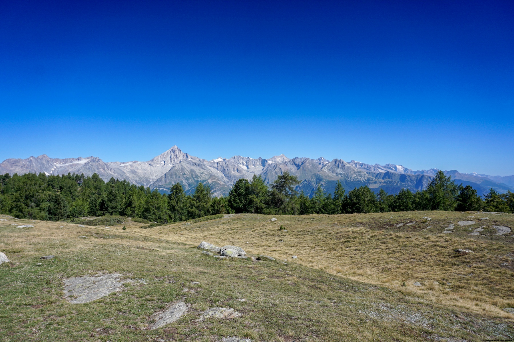 Auf der Bürchner Alp angekommen, sind wir endgültig von der Strasse abgekommen und folgten zunächst einem guten Weg bergab, bevor wir den Hang querten. Der ganze Hügel ist mit Arven Wald bedeckt. Kein Wunder, dass der Tannenhäher sich dort sehr wohl fühlt. Das sieht man daran, dass man entlang des Weges viele zerklüftete Arven Zäpfen findet. Der Weg hat keinen nennenswerten Anstieg bis Ledi. Hier beginnt der Weg hinauf zu Breitmatt. Von dort aus hat man einen Blick auf die Mischabel.