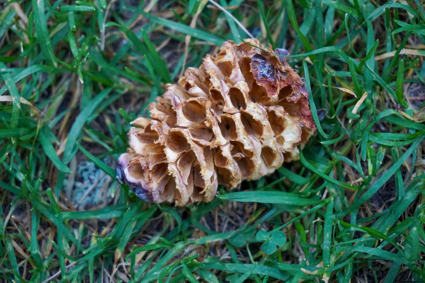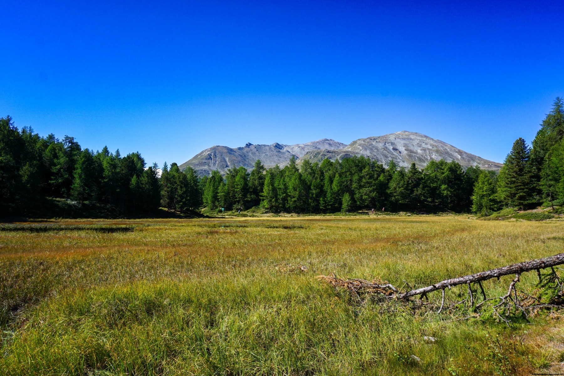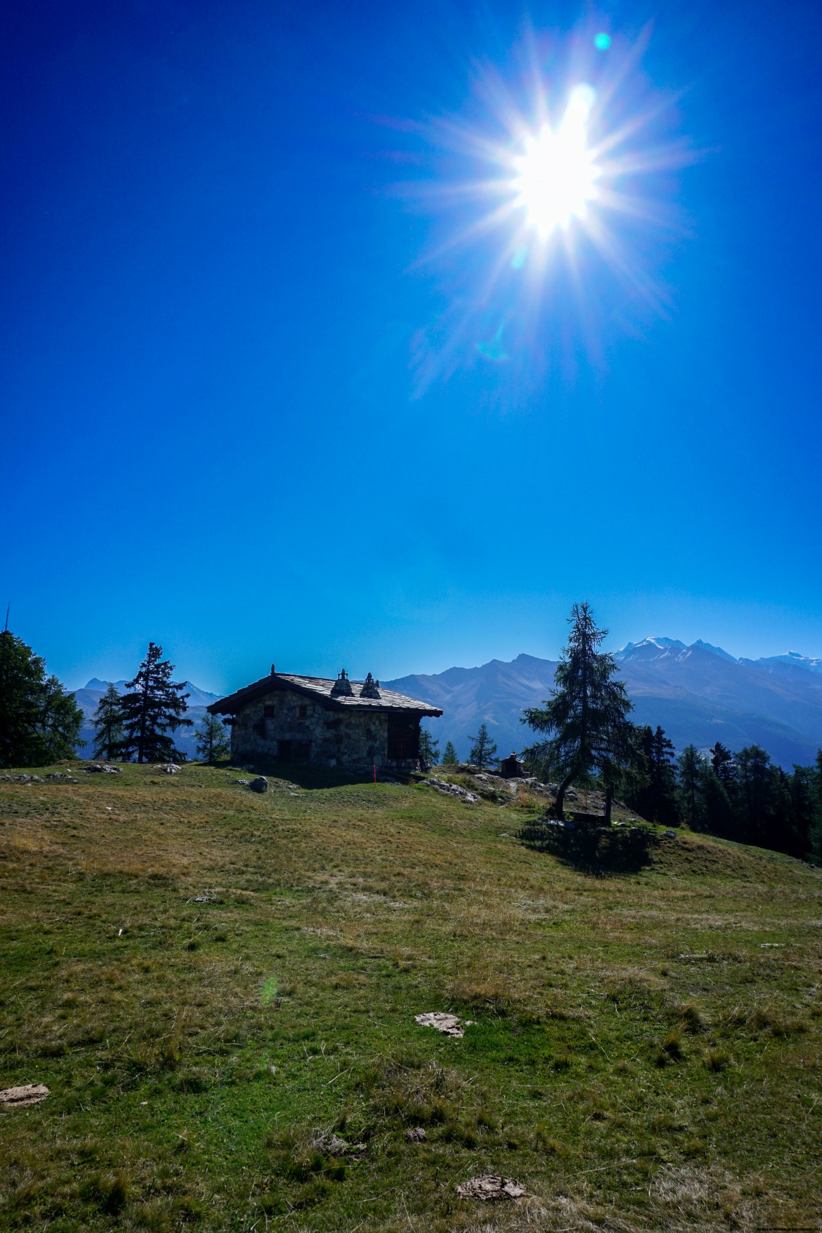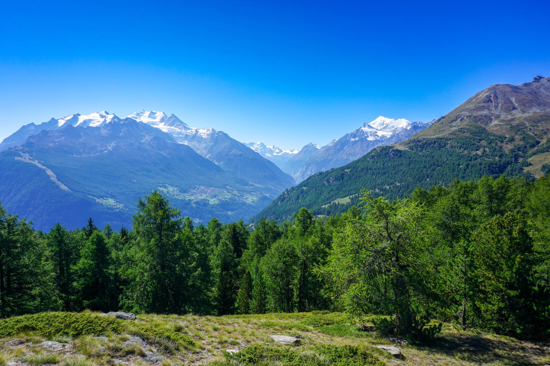 Auf der Bürchner Alp angekommen, sind wir endgültig von der Strasse abgekommen und folgten zunächst einem guten Weg bergab, bevor wir den Hang querten. Der ganze Hügel ist mit Arven Wald bedeckt. Kein Wunder, dass der Tannenhäher sich dort sehr wohl fühlt. Das sieht man daran, dass man entlang des Weges viele zerklüftete Arven Zäpfen findet. Der Weg hat keinen nennenswerten Anstieg bis Ledi. Hier beginnt der Weg hinauf zu Breitmatt. Von dort aus hat man einen Blick auf die Mischabel.