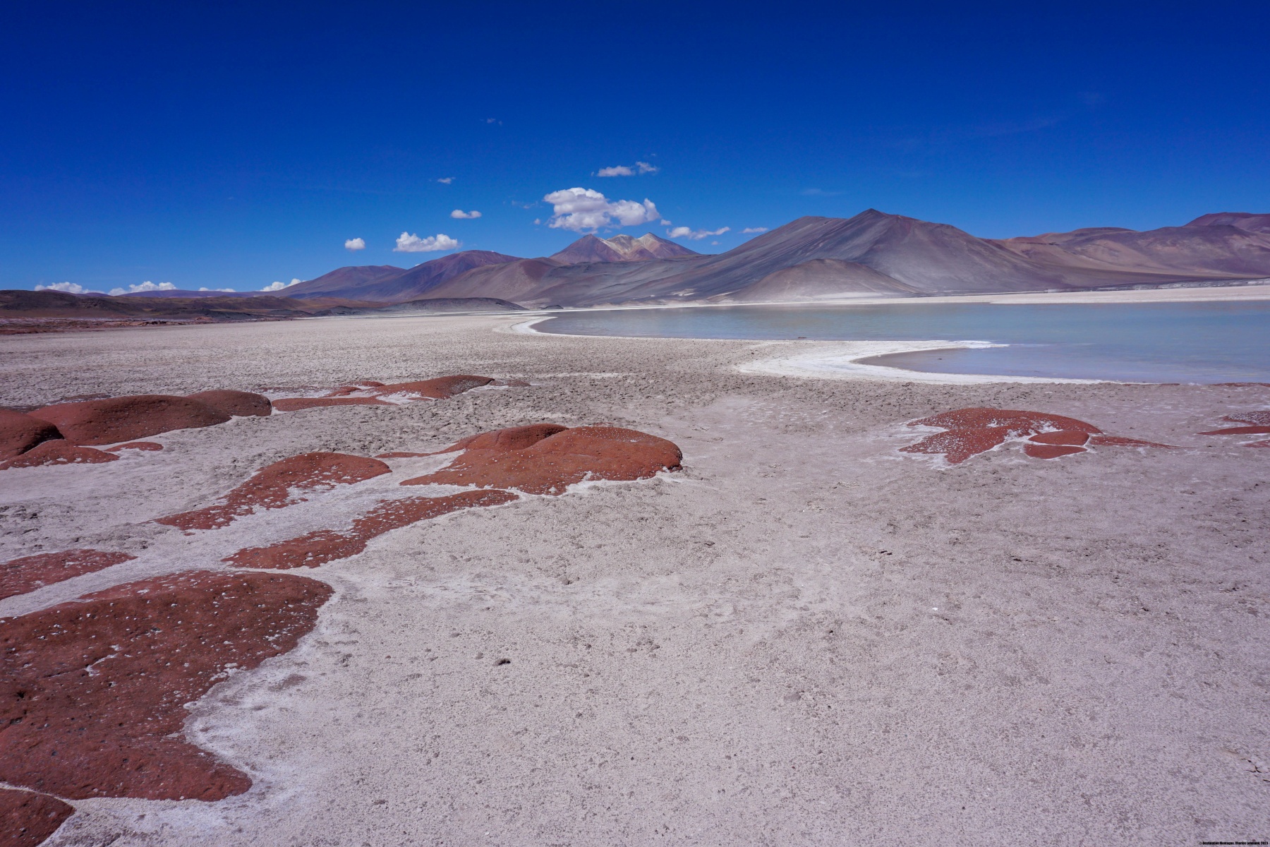 En ce premier jour complet au Chili, nous sommes partis au sud en longeant le Désert d’Atacama pour monter aux différentes lagunes se trouvant sur les hauts. Les contrastes de couleurs sont saisissants, en particulier aux Piedras Rojas. Celles-ci portent bien leur nom puisque l’on se trouve dans un environnement très minéral de roches rouges entrecoupées de lagunes de sel, donc blanches.