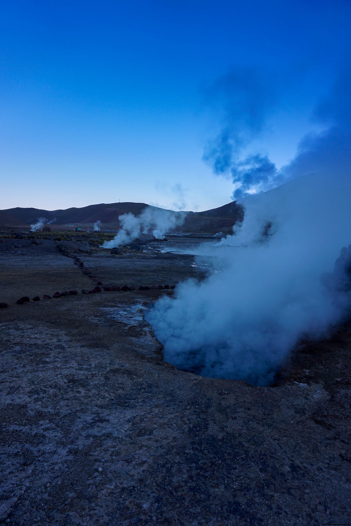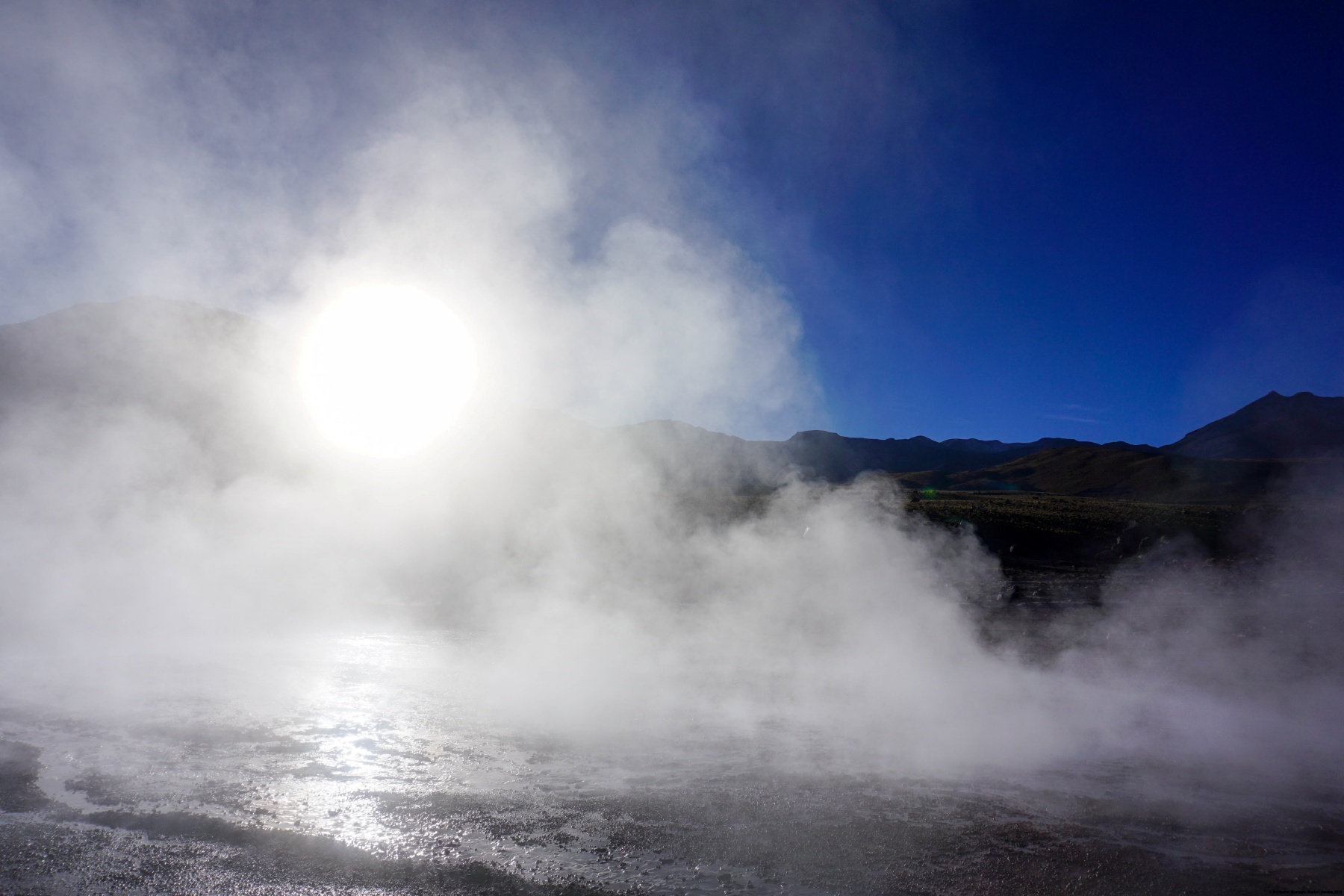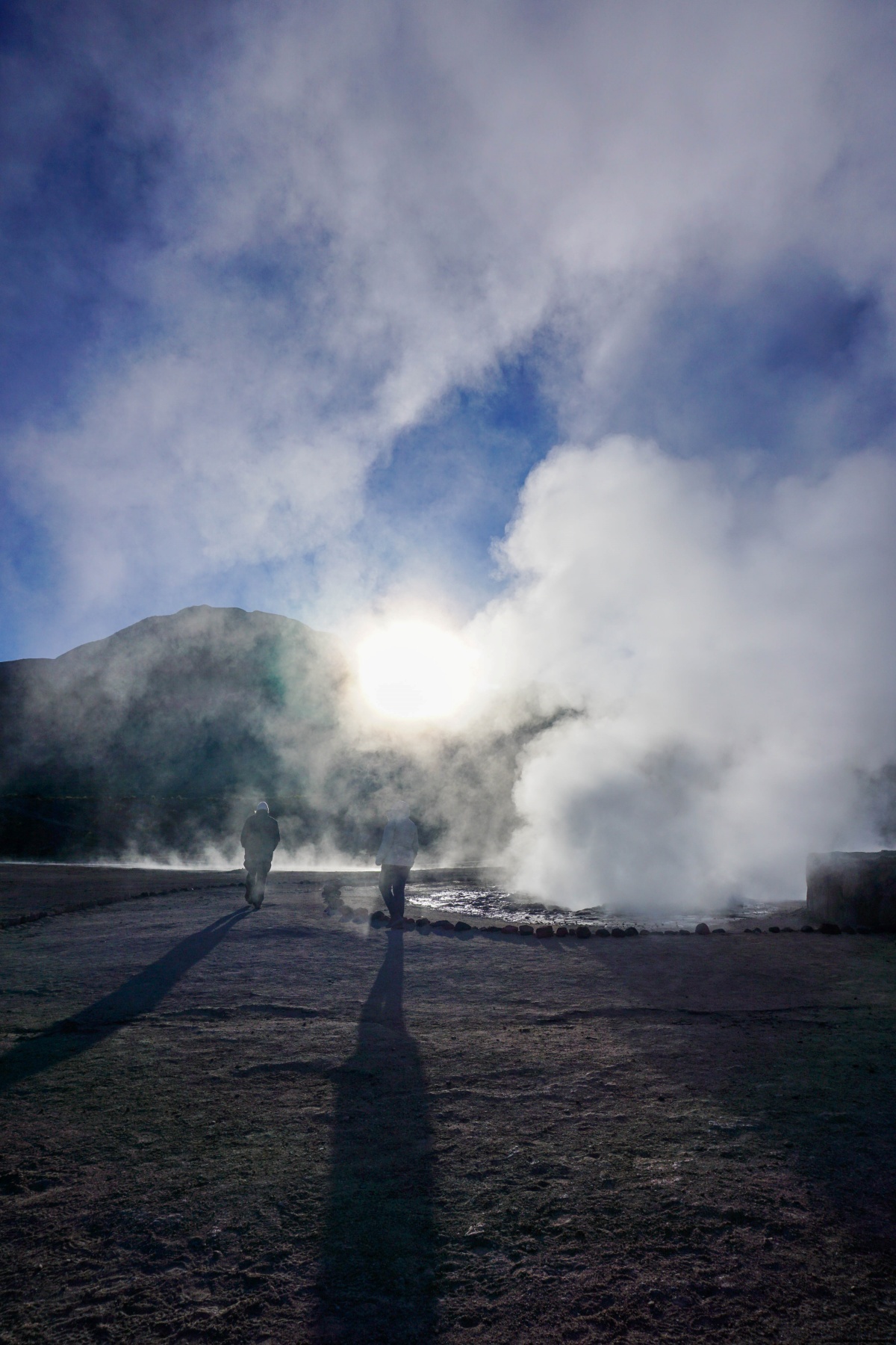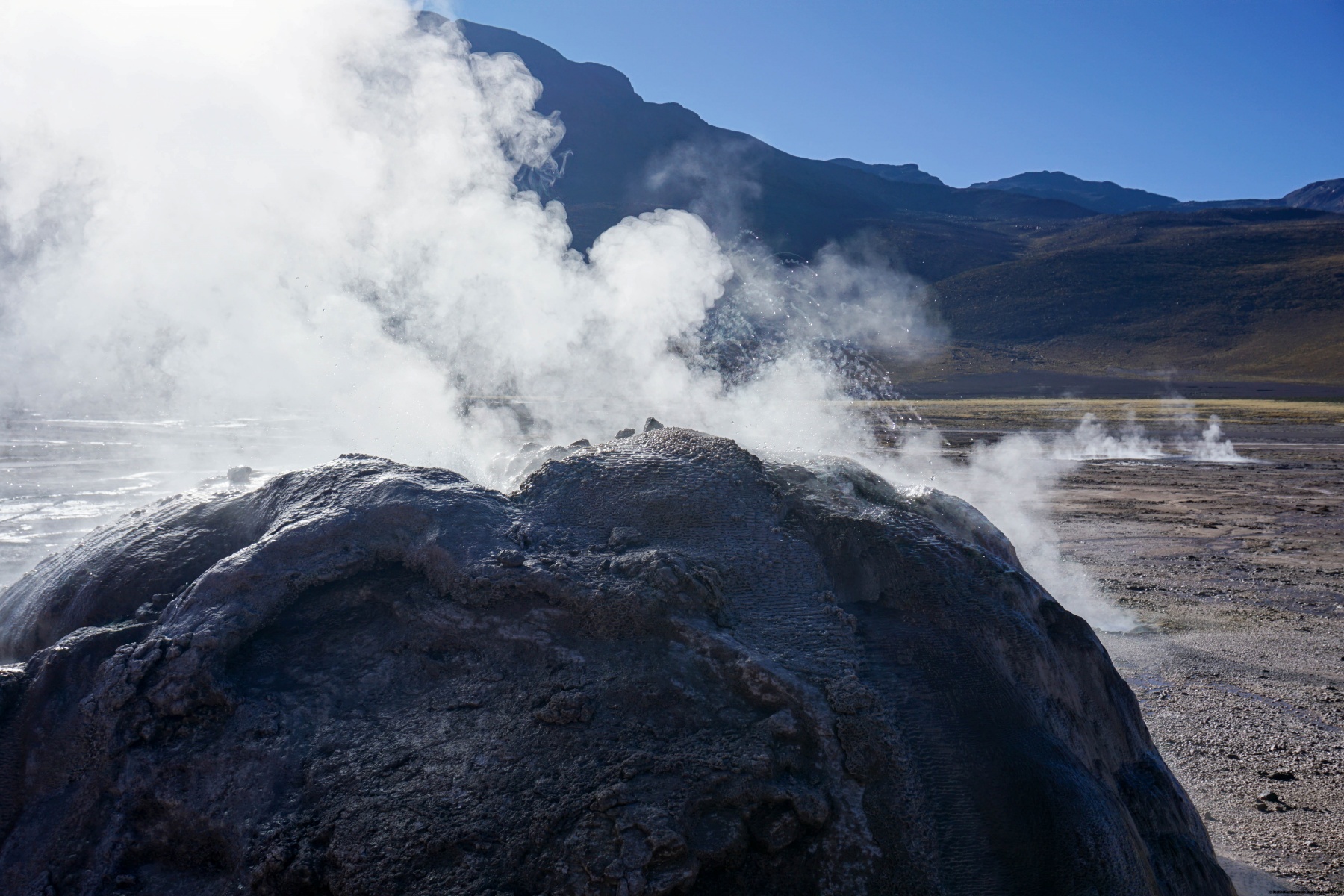 En ce jour, nous sommes partis tôt le matin en direction du nord, alors qu’il faisait encore nuit. Le but était d’arriver aux Geysers du Tatio avant que le soleil n’illumine le fond de la caldeira, car plus tard, avec l’augmentation de la température, la vapeur d’eau est nettement moins visible. Il est saisissant de mettre la main au sol à certains endroits et de sentir la chaleur, ainsi que le gargouillement de l’eau sous-jacente.