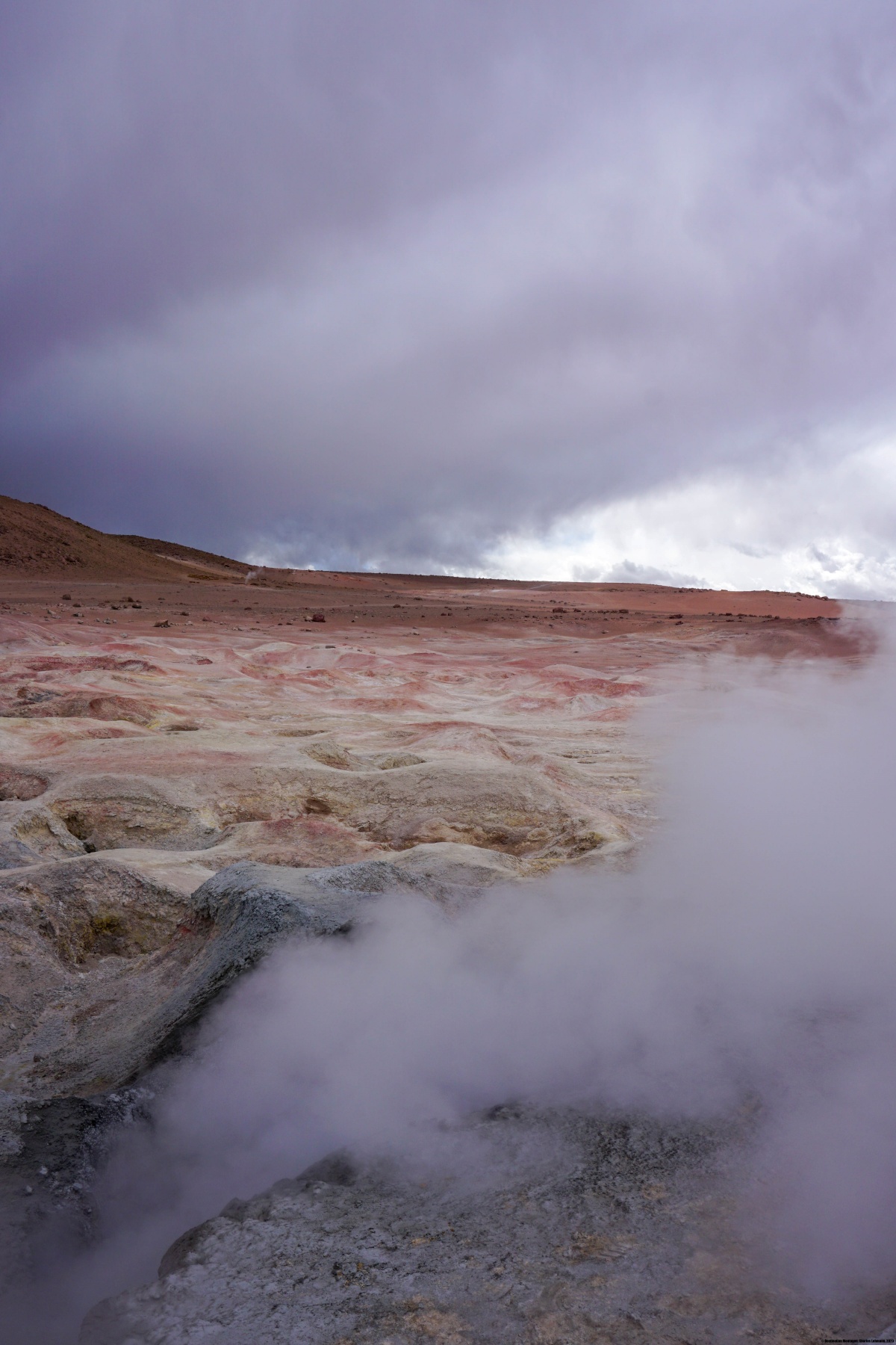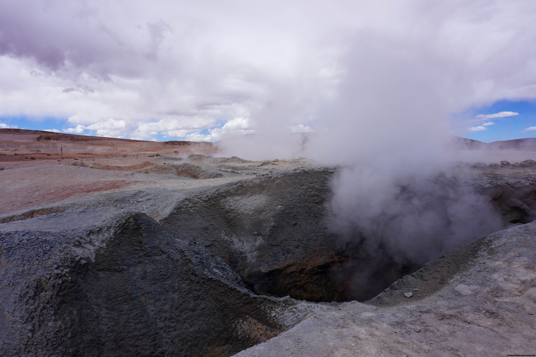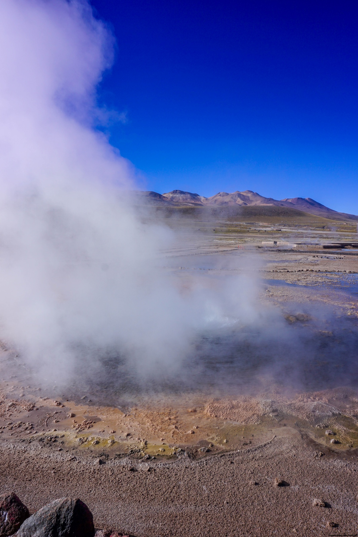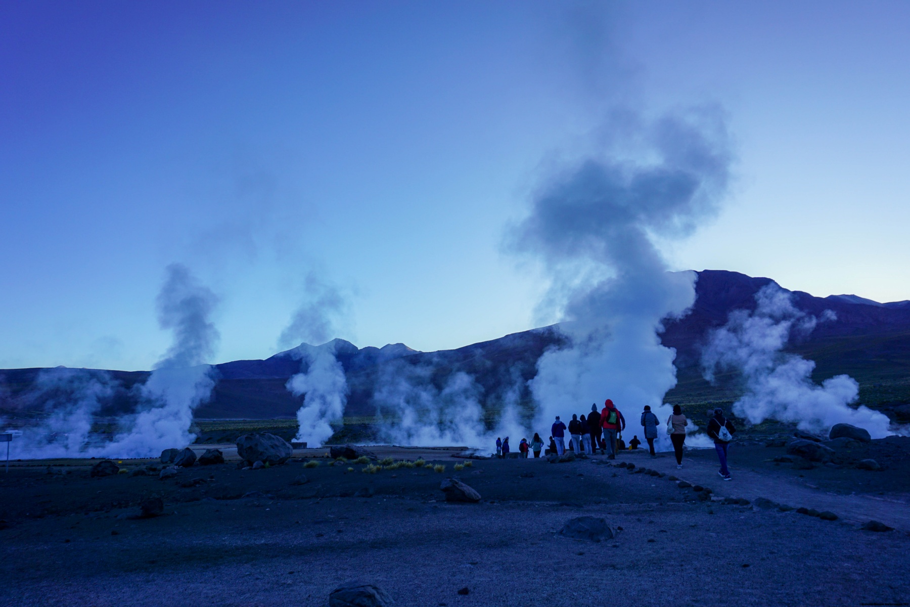 En ce jour, nous sommes partis tôt le matin en direction du nord, alors qu’il faisait encore nuit. Le but était d’arriver aux Geysers du Tatio avant que le soleil n’illumine le fond de la caldeira, car plus tard, avec l’augmentation de la température, la vapeur d’eau est nettement moins visible. Il est saisissant de mettre la main au sol à certains endroits et de sentir la chaleur, ainsi que le gargouillement de l’eau sous-jacente.