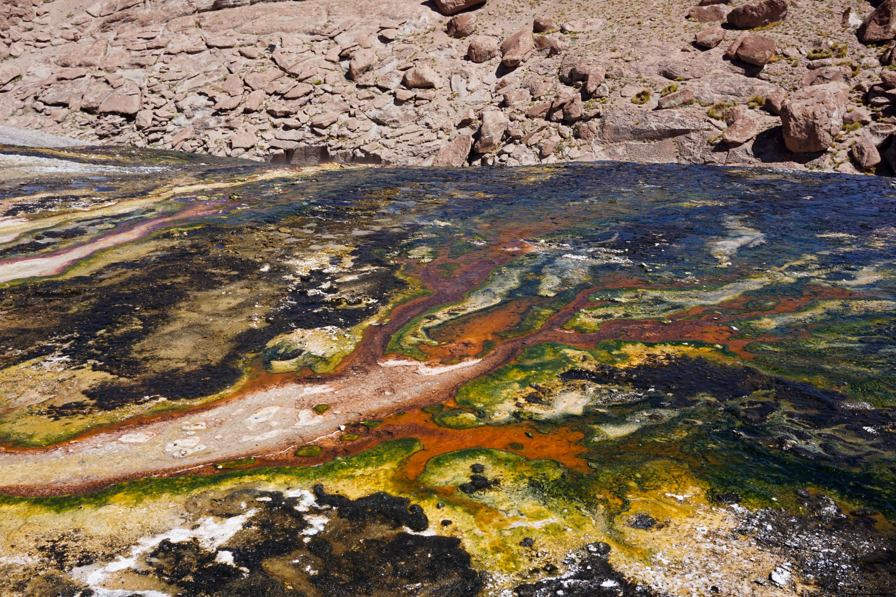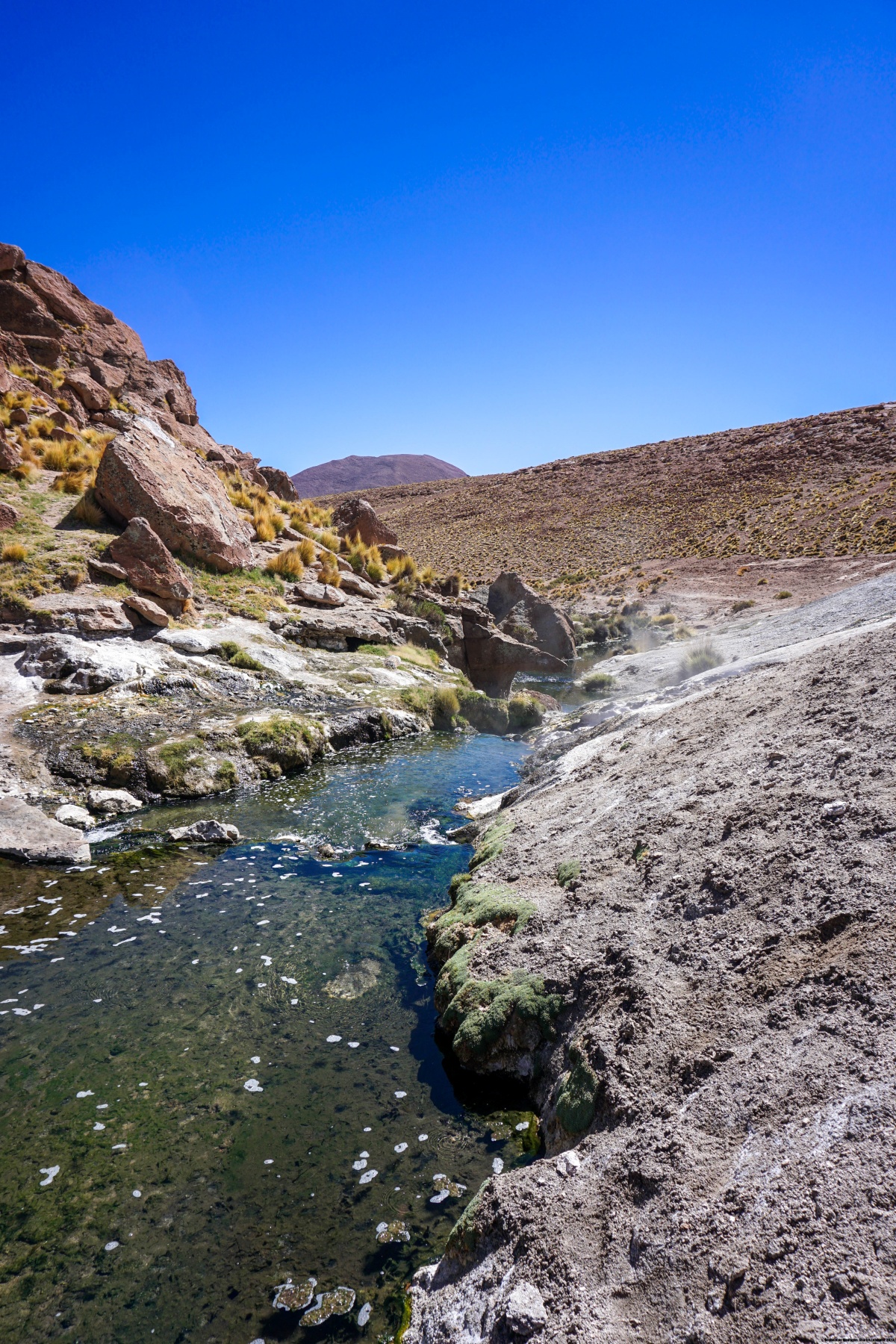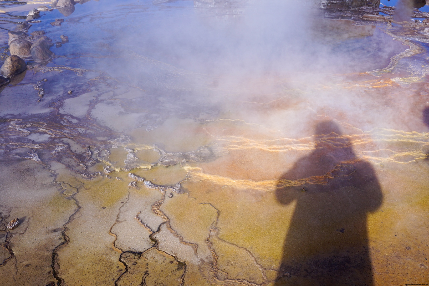 Pour le repas, nous nous étions arrêtés près du Geyser Blanco où l’eau sortant de la fissure confère à l’environnement une multitude de couleurs. Ces couleurs proviennent non seulement des différents minéraux présents dans l’eau, mais également aux micro-organismes arrivant à vivre dans ces lieux hostiles.