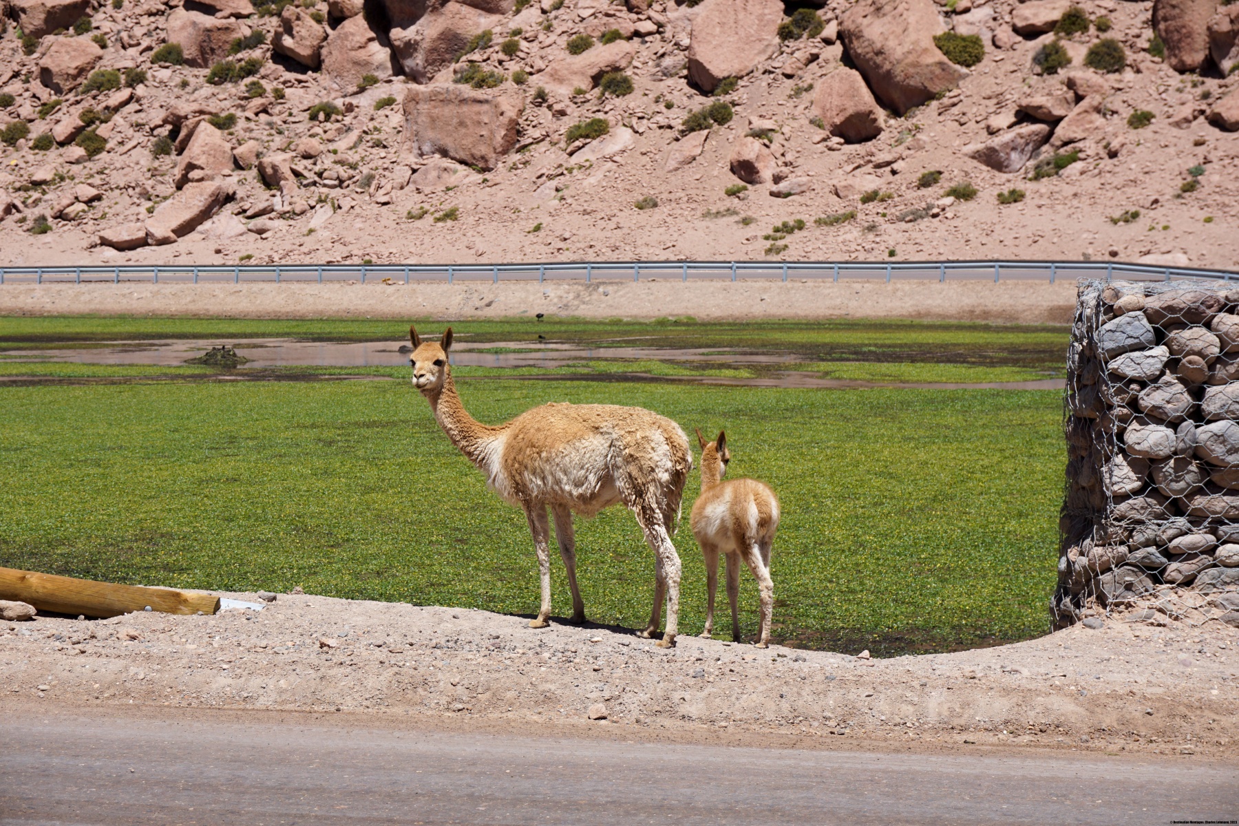 Un peu plus loin, nous sommes encore allés visiter un endroit assez étonnant : la Laguna Negra, plan d’eau se trouvant au milieu d’un champ de rochers. En plus de la beauté du paysage, on y rencontre beaucoup d’animaux, sauvages et domestiques. Parmi les espèces sauvages, on peut facilement y voir des Tagua (foulques colonisant les Andes). On peut également y voir des troupeaux de Lamas. Une tradition amusante est d’attacher des fils de couleur aux oreilles des Lamas. Le but est de « colorer » le désert, car il est assez fréquent que ces fils de couleurs restent crochés aux buissons.