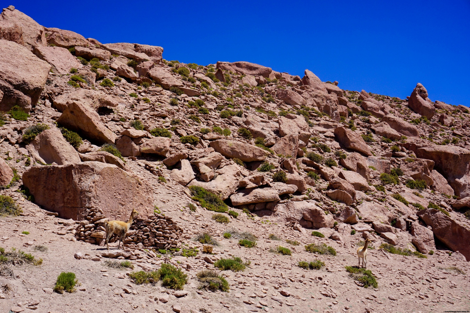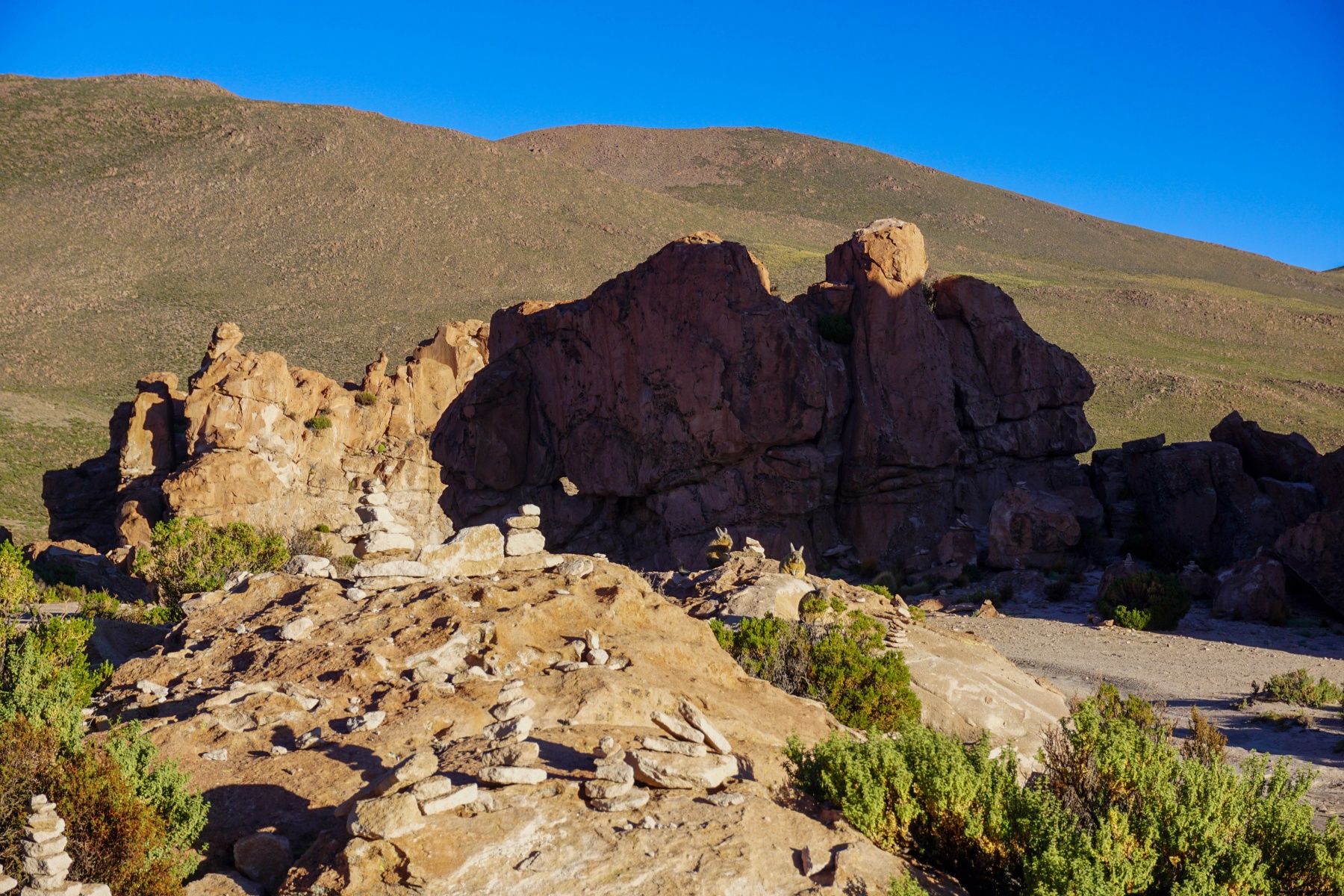 A cet endroit, nous avons également pu observer des Viscaches, qui sont des lièvres sauvages vivants dans ces contrées. Par certains aspects, ils ressemblent étonnamment au lièvre variable de chez nous. La grande différence sont les grandes moustaches des Viscaches qui font penser à un sage qui médite, car au matin, ils prennent le soleil en se mettant sur leurs pattes arrière, les pattes avant étant repliées vers le bas.
