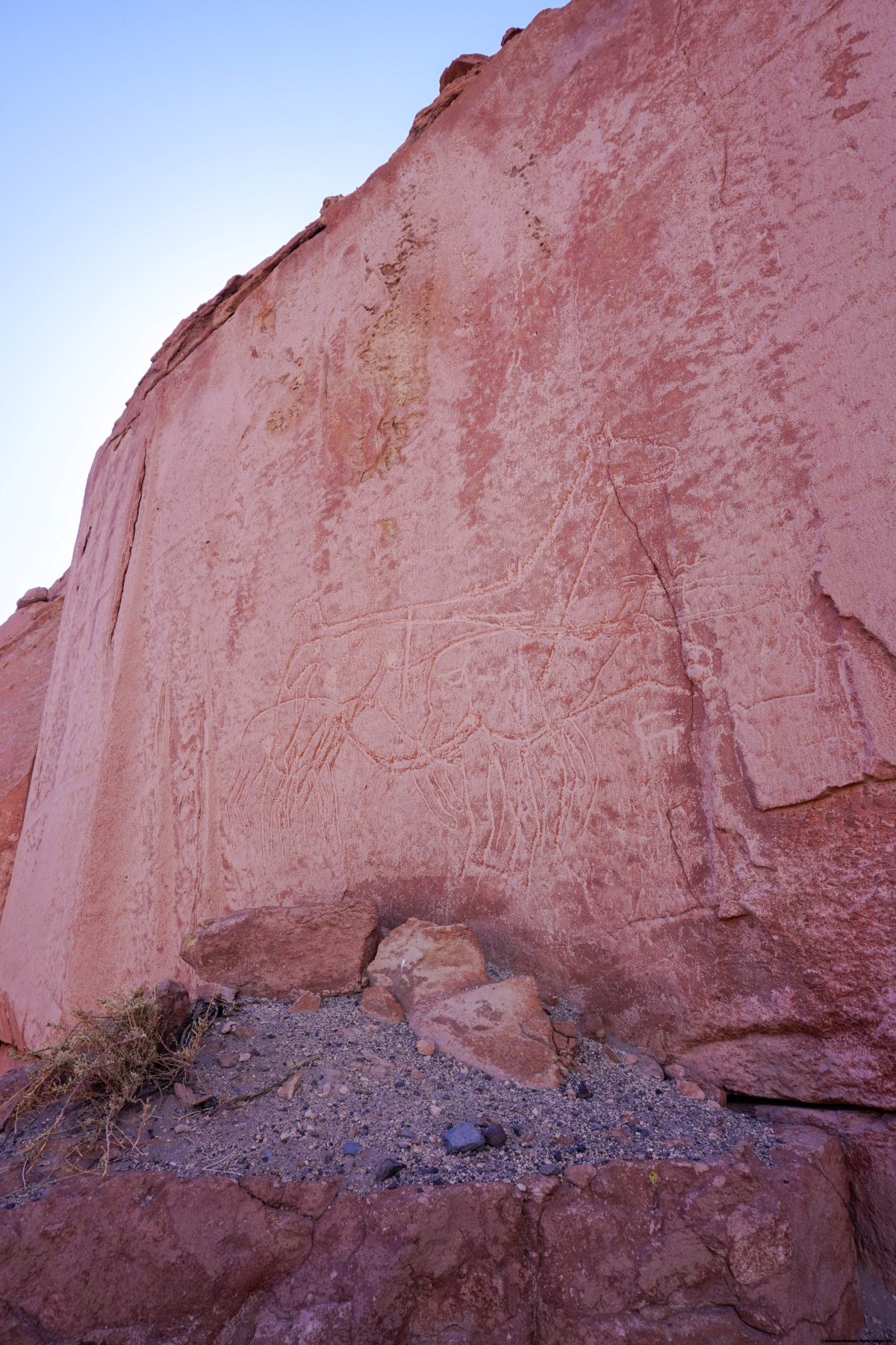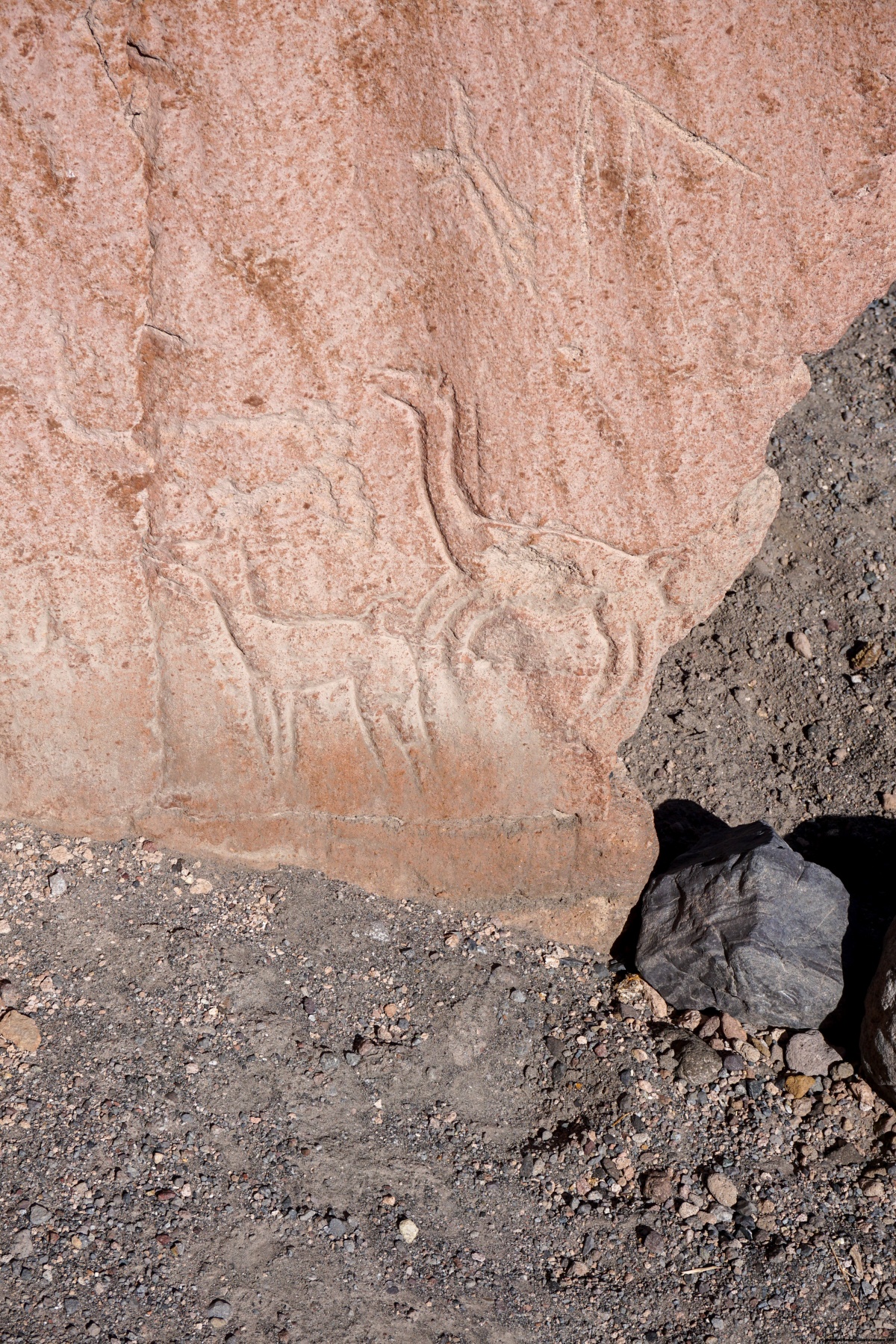 Au retour à Talabre, et avant le souper, nous sommes encore allés visiter les pétroglyphes de Talabre. L’âge de ces pétroglyphes n’est pas clairement établi, mais ils établissent une fréquentation régulière depuis des temps reculés. Les gravures représentent non seulement des animaux que l’on peut rencontrer localement, soit domestiques, soit sauvages. On peut mentionner les flamands, les lamas et le puma. On y trouve également des représentations schématiques de chamanes.