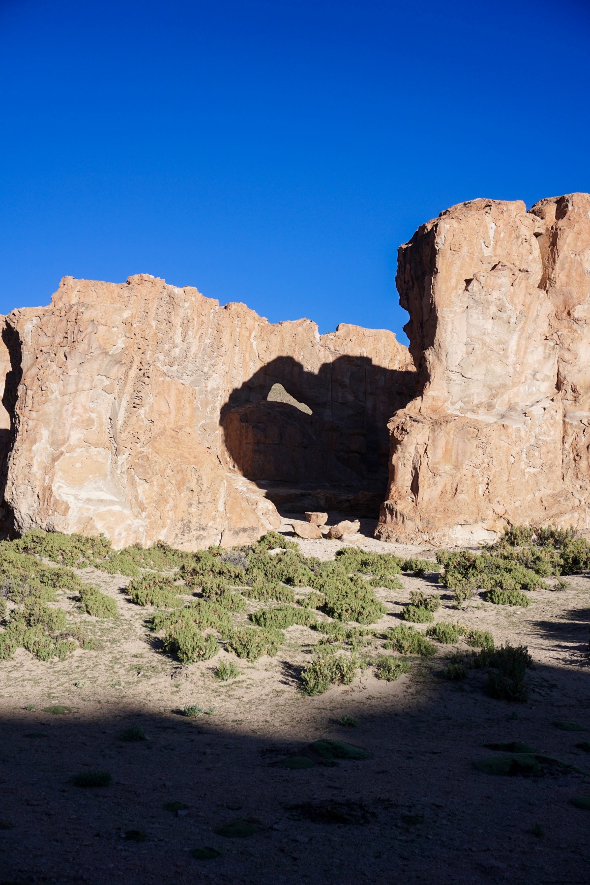 Après le réveil et le petit déjeuner, nous nous sommes mis en route pour rejoindre, non loin, de curieuses formations rocheuses. On a l’impression que des blocs de roche rouge ont été posés là, au milieu de nulle part. Certains de ces rochers ont des formes singulières, dont, en particulier, la Copa del Mundo, ressemblant étonnamment au trophée de la coupe du monde de football. Dans ce groupe de rochers se trouve également un lieu nommé Italia Perdida, en référence à un cyclotouriste italien qui s’y était installé quelques temps avant de repartir.
