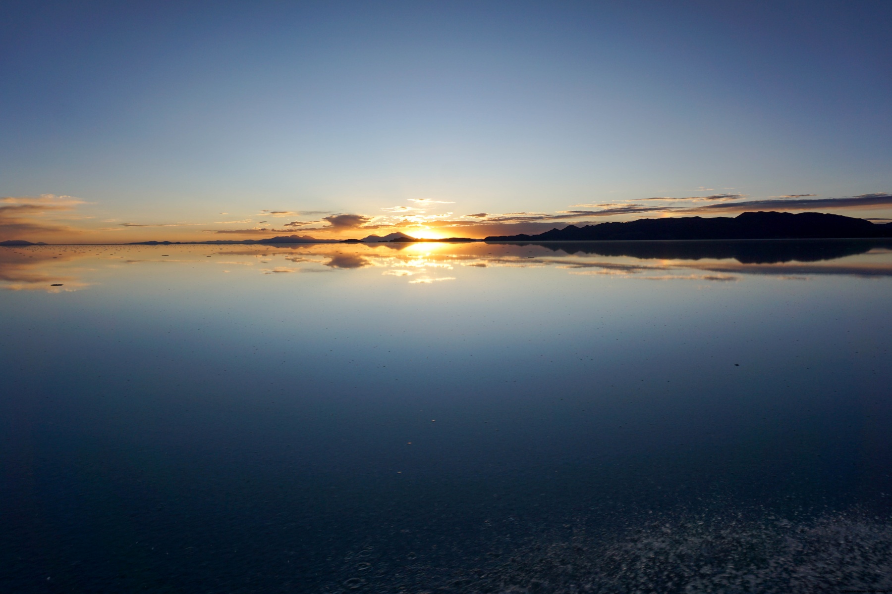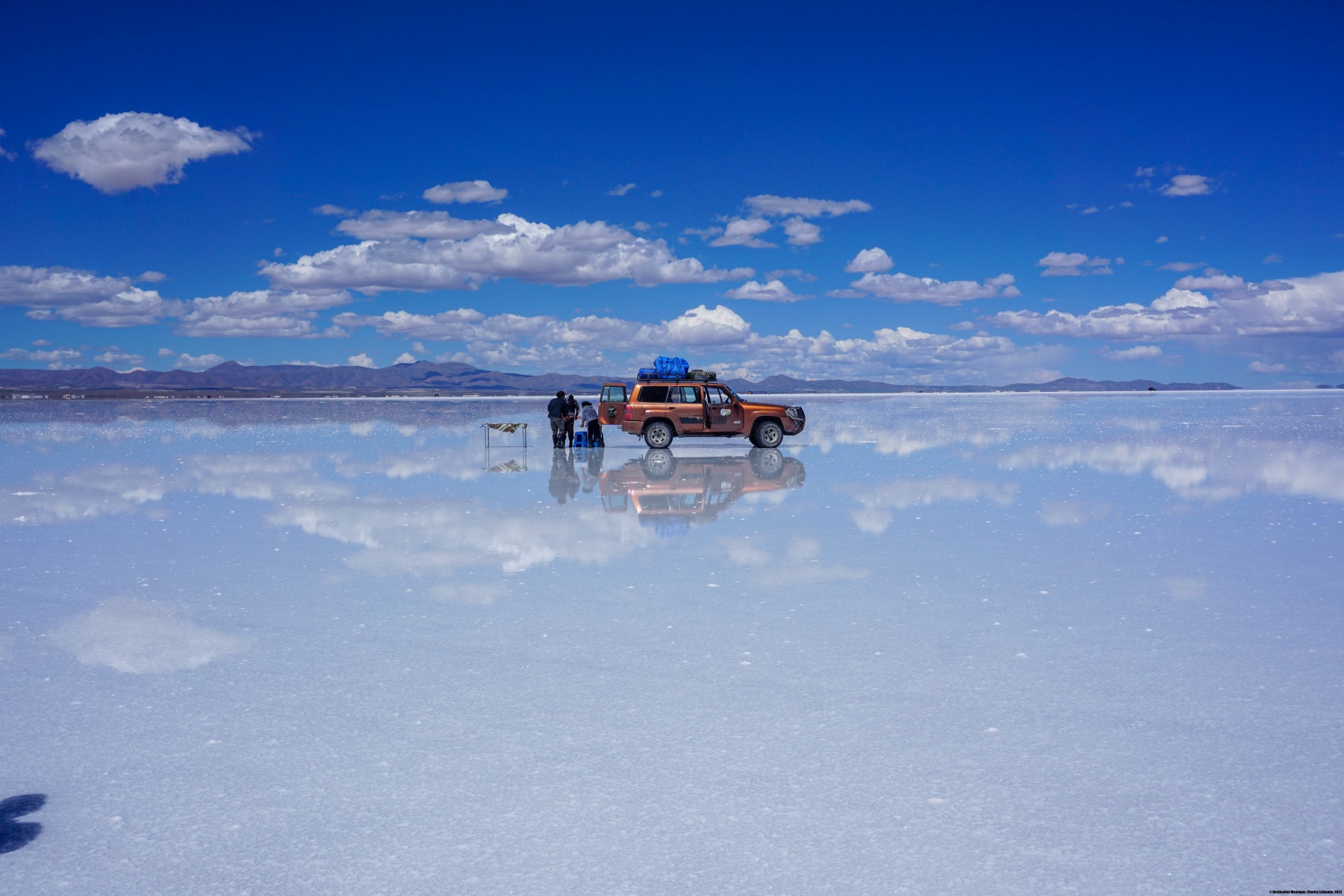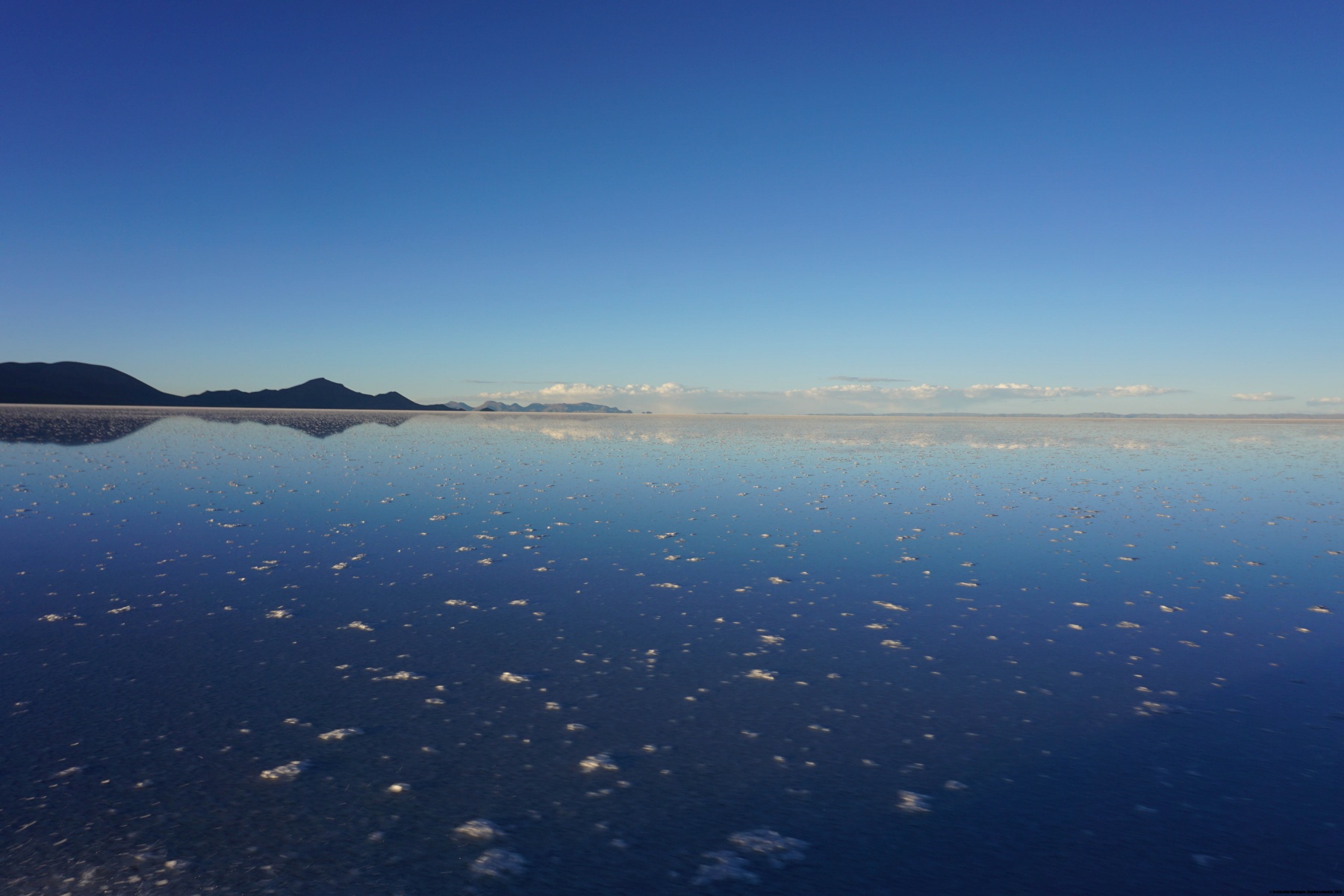 Le périple n’était pas terminé pour autant : il nous fallait traverser le Salar d’Uyuni. Ce « lac de sel » a des dimensions énormes : grosso-modo 80Km de large sur 100Km de long. Cette traversée a été une expérience totalement déroutante pour moi. D’abord parce qu’avec de telles dimensions, on commence à prendre conscience de l’effet de la courbure de la surface terrestre. En effet, ce qui apparaît au loin comme des îles sont en réalité les montagnes se trouvant sur l’autre rive. Il existe certes quelques îles (dont la fameuse Incahuasi) mais la plupart des « îles » que l’on voit sont des sommets. Ensuite, la traversée nous a pris plus de 4 heures. Cette durée est le résultat de la faible vitesse imposée par moment, car il se trouvait entre 10 à 20 centimètres de saumure par endroits. On a vraiment l’impression de ne pas avancer : on roule des heures et les montagnes à l’horizon ne semblent pas vouloir s’approcher. C’est pourquoi nous sommes arrivés à Tahua alors que la nuit était déjà tombée.