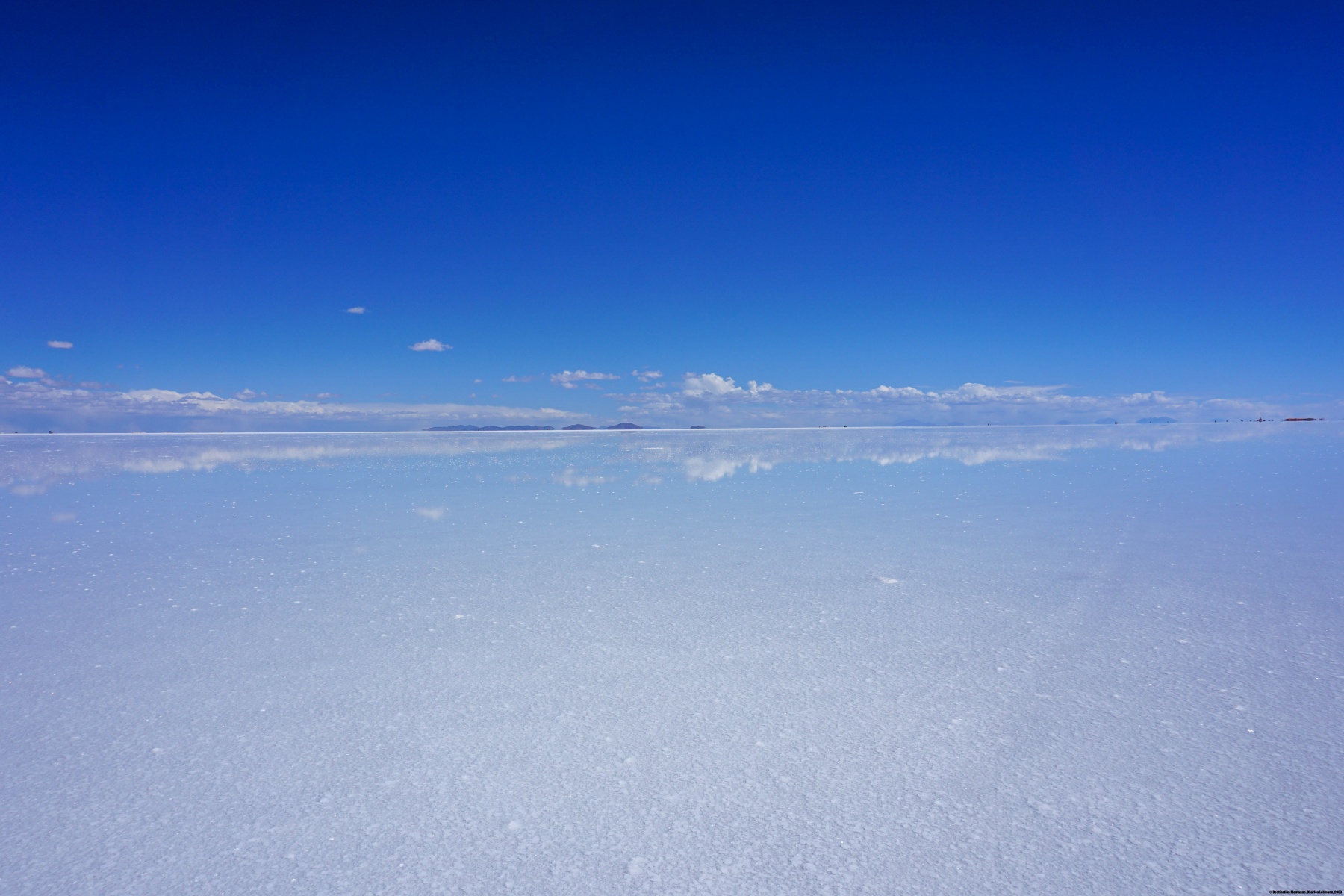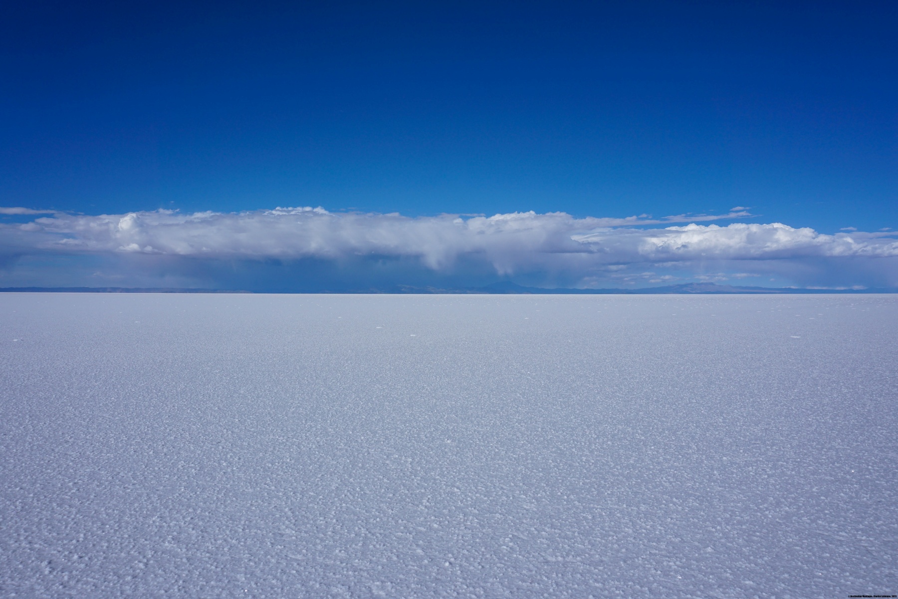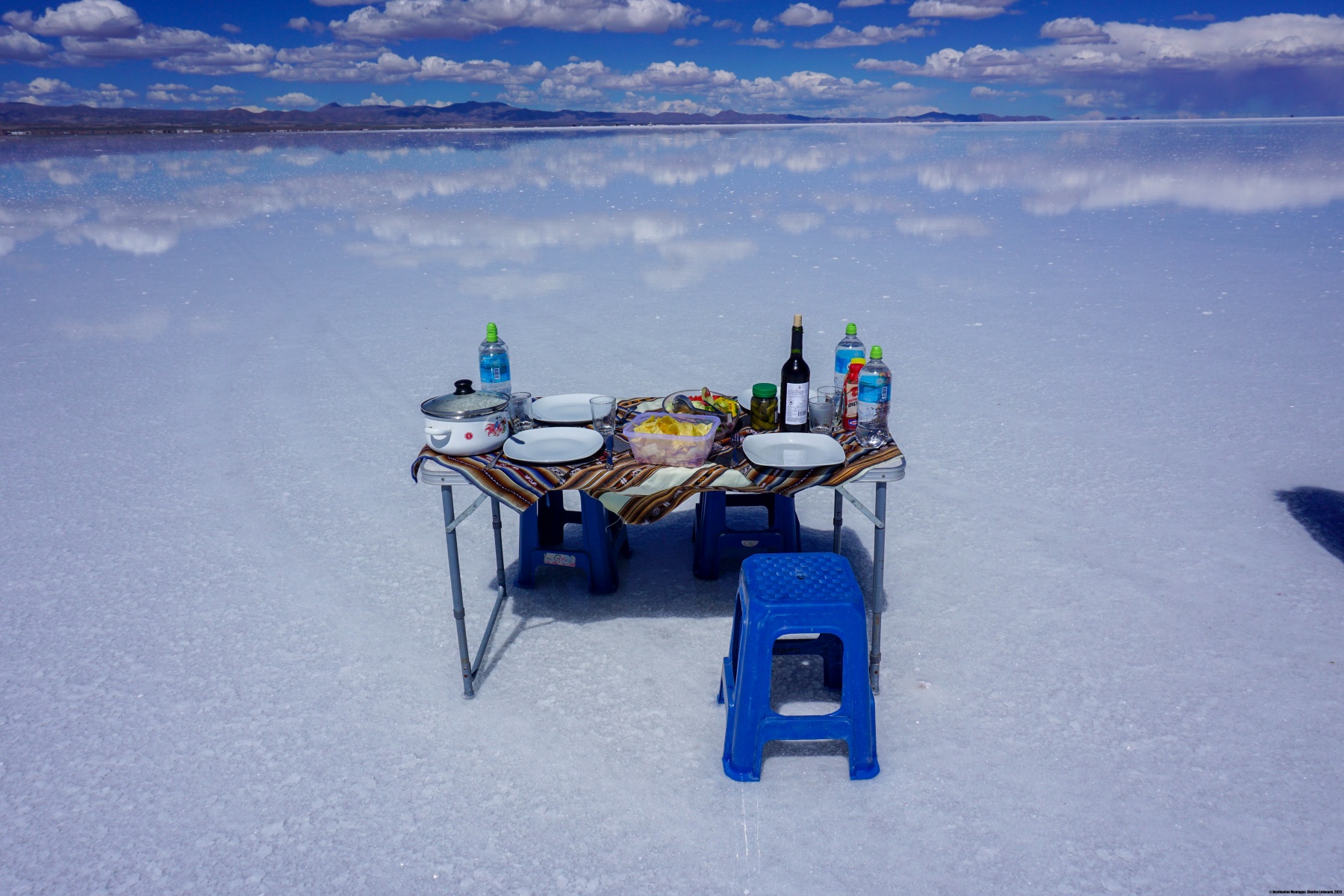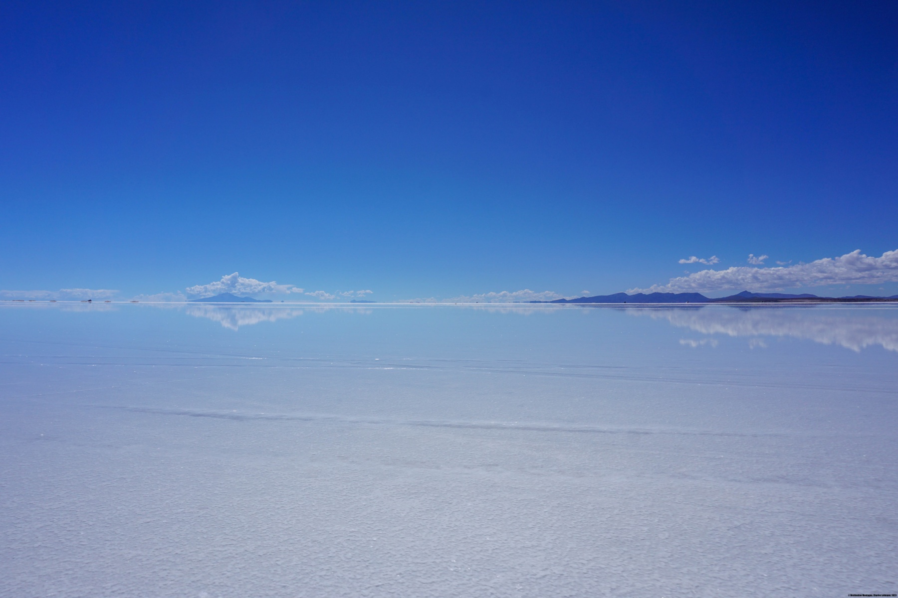 Le périple n’était pas terminé pour autant : il nous fallait traverser le Salar d’Uyuni. Ce « lac de sel » a des dimensions énormes : grosso-modo 80Km de large sur 100Km de long. Cette traversée a été une expérience totalement déroutante pour moi. D’abord parce qu’avec de telles dimensions, on commence à prendre conscience de l’effet de la courbure de la surface terrestre. En effet, ce qui apparaît au loin comme des îles sont en réalité les montagnes se trouvant sur l’autre rive. Il existe certes quelques îles (dont la fameuse Incahuasi) mais la plupart des « îles » que l’on voit sont des sommets. Ensuite, la traversée nous a pris plus de 4 heures. Cette durée est le résultat de la faible vitesse imposée par moment, car il se trouvait entre 10 à 20 centimètres de saumure par endroits. On a vraiment l’impression de ne pas avancer : on roule des heures et les montagnes à l’horizon ne semblent pas vouloir s’approcher. C’est pourquoi nous sommes arrivés à Tahua alors que la nuit était déjà tombée.