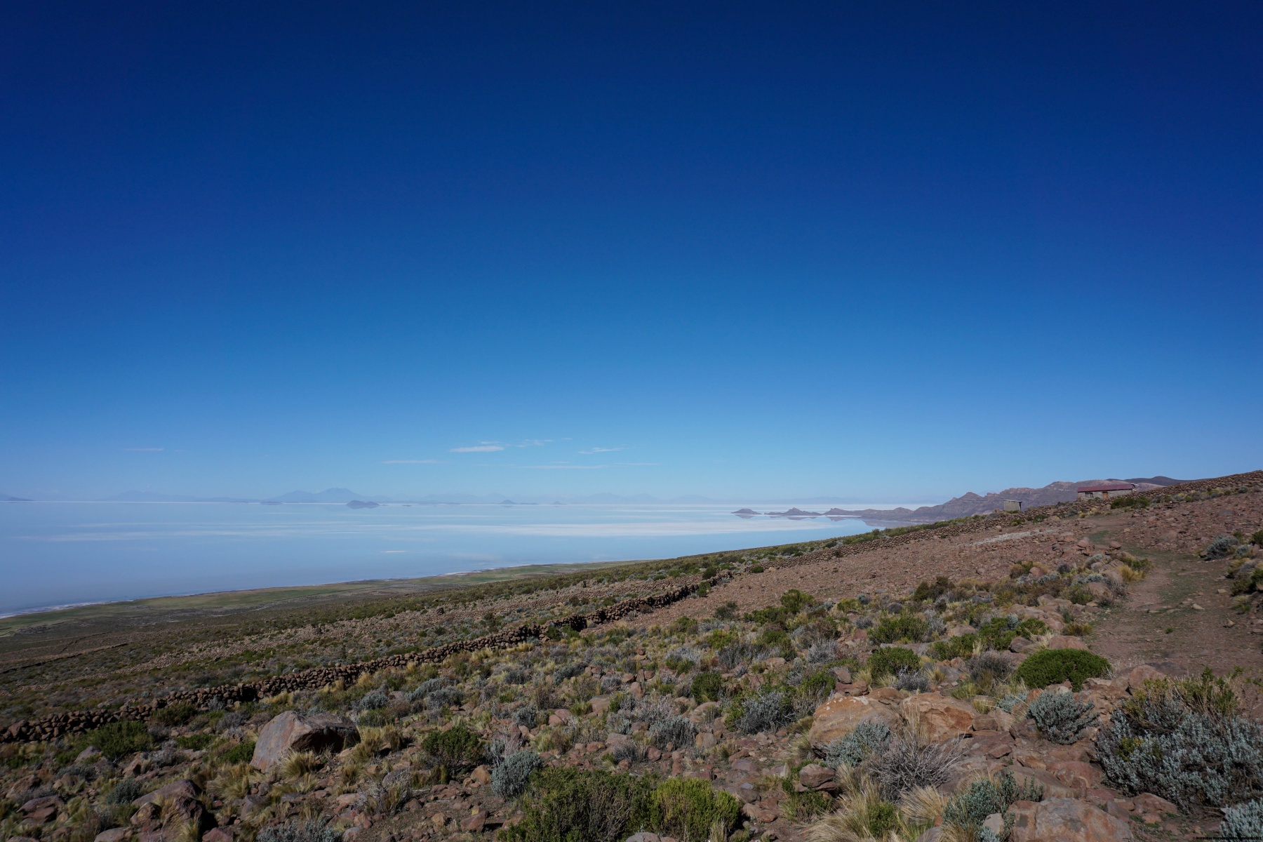 Après avoir préparé nos affaires de montagne, on nous a emmené à un gîte près de la Laguna Zongo. En passant, nous avons pu entr’apercevoir au loin le Lac Titicaca.