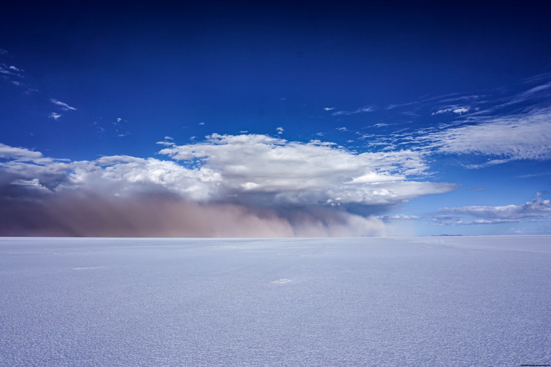 Au retour à Coqueza, nous avons retraversé le Salar dans l’autre sens. Nous avons pu assister à un spectacle saisissant : une tempête de sable passant par-dessus le Salar.