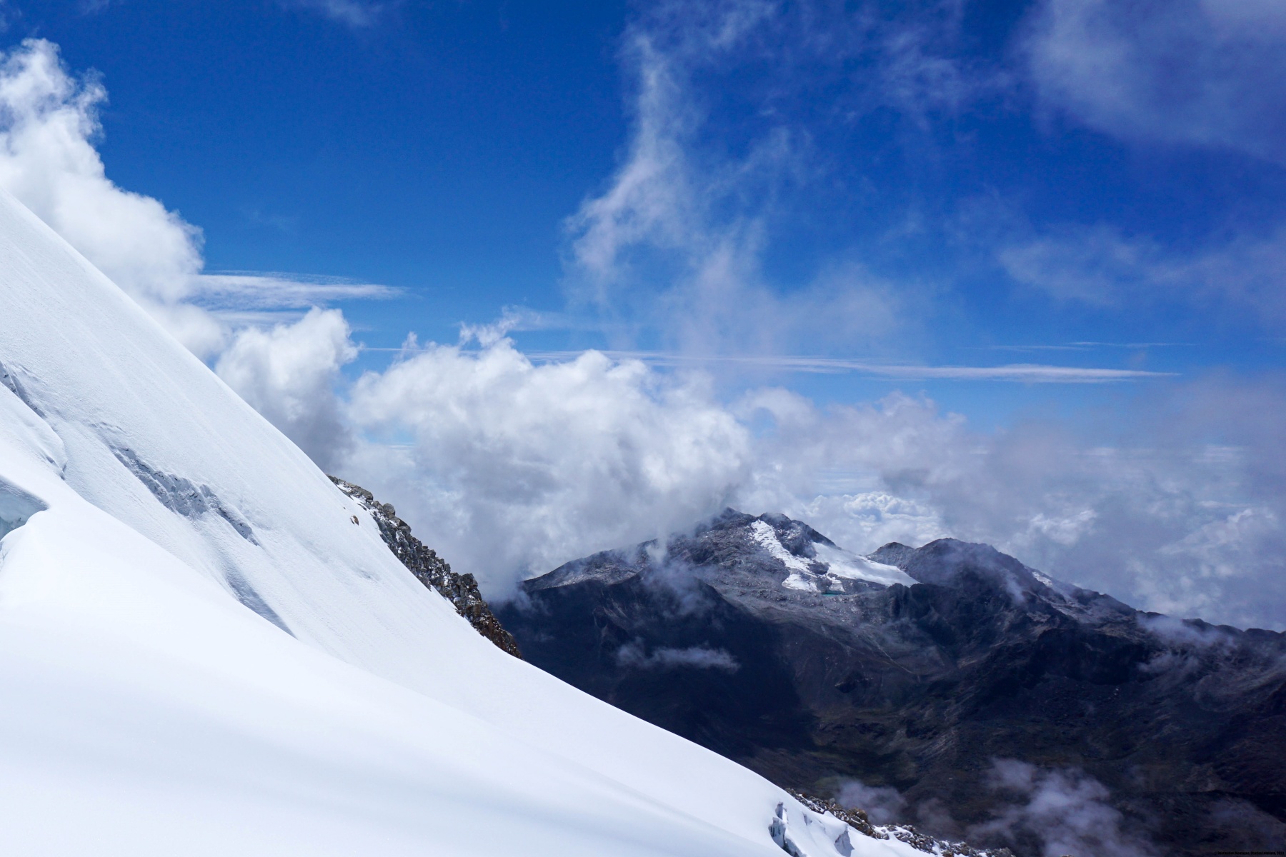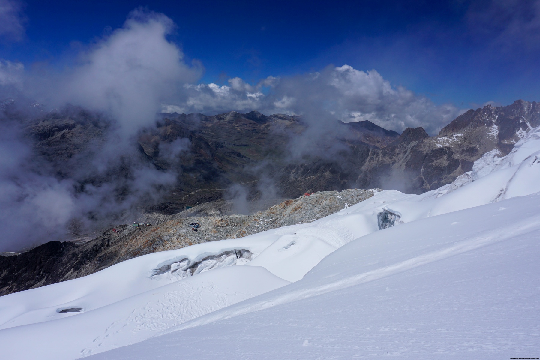 Ce dernier jour en altitude a consisté à monter au Campo Argentino. Le nom laisse indiquer la présence d’un refuge. Il n’en est rien : il s’agit d’une zone relativement plate et peu crevassée du glacier du Huayna Potosi. Depuis ce plateau, la voie normale gravit une pente permettant d’atteindre une arête et finalement, le sommet du Huayna Potosi.