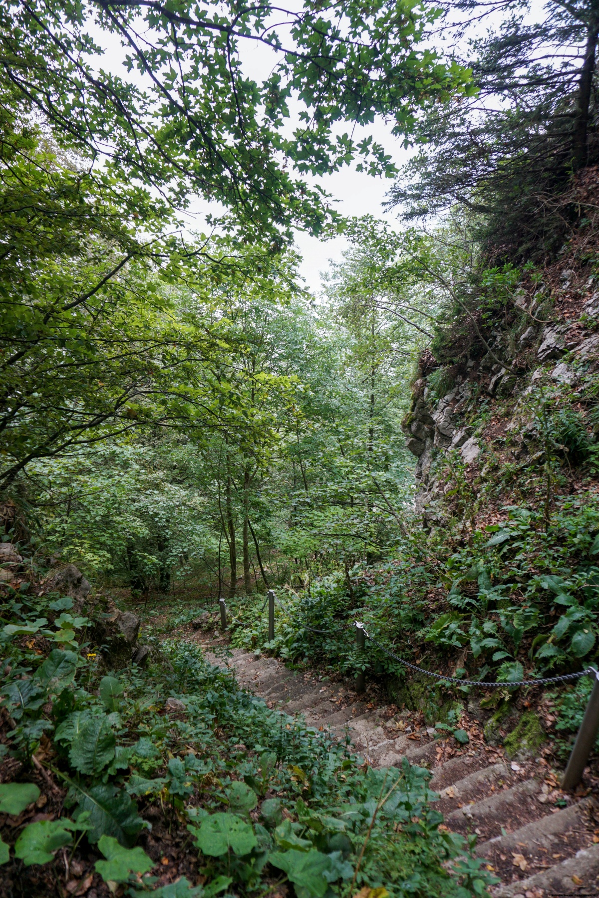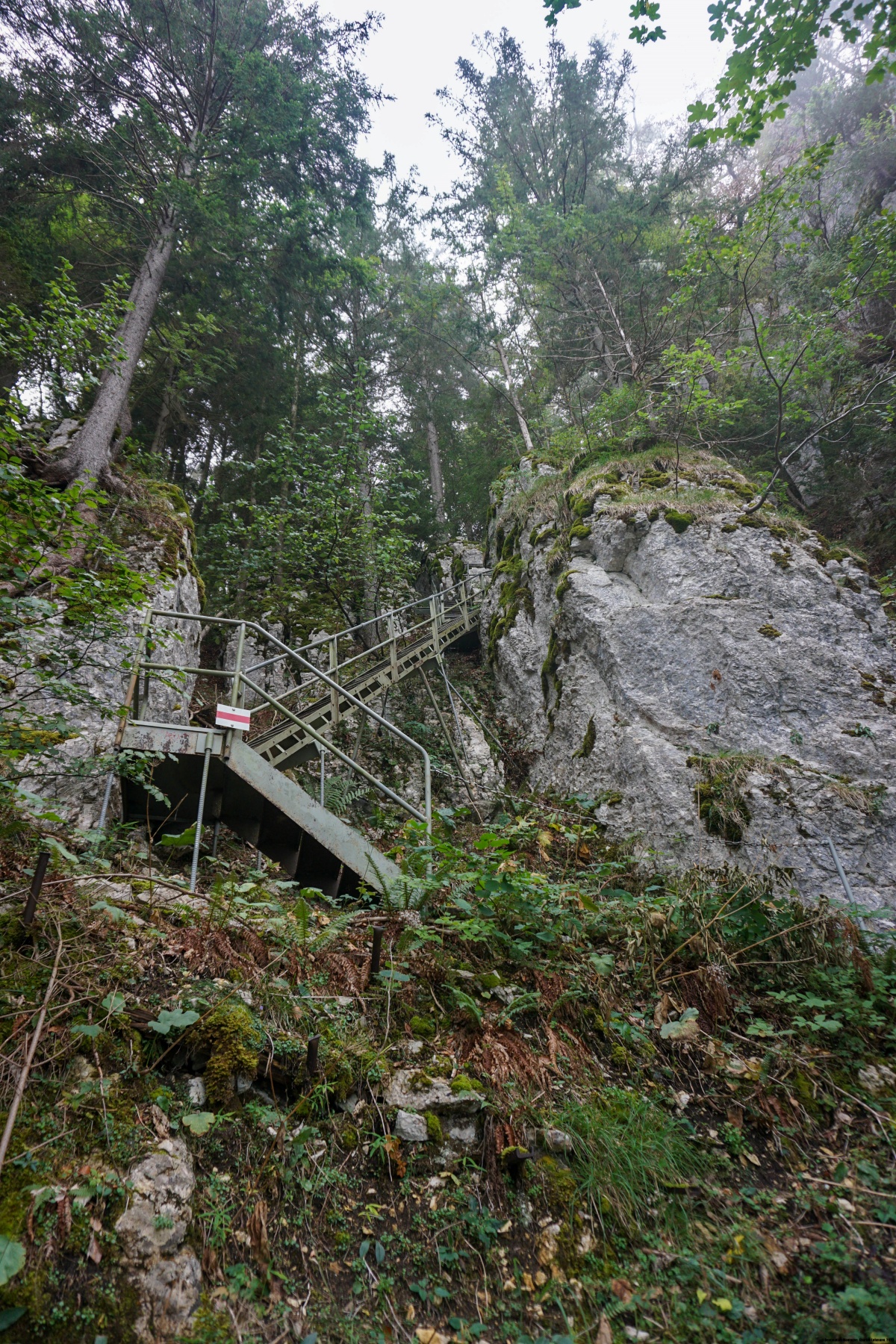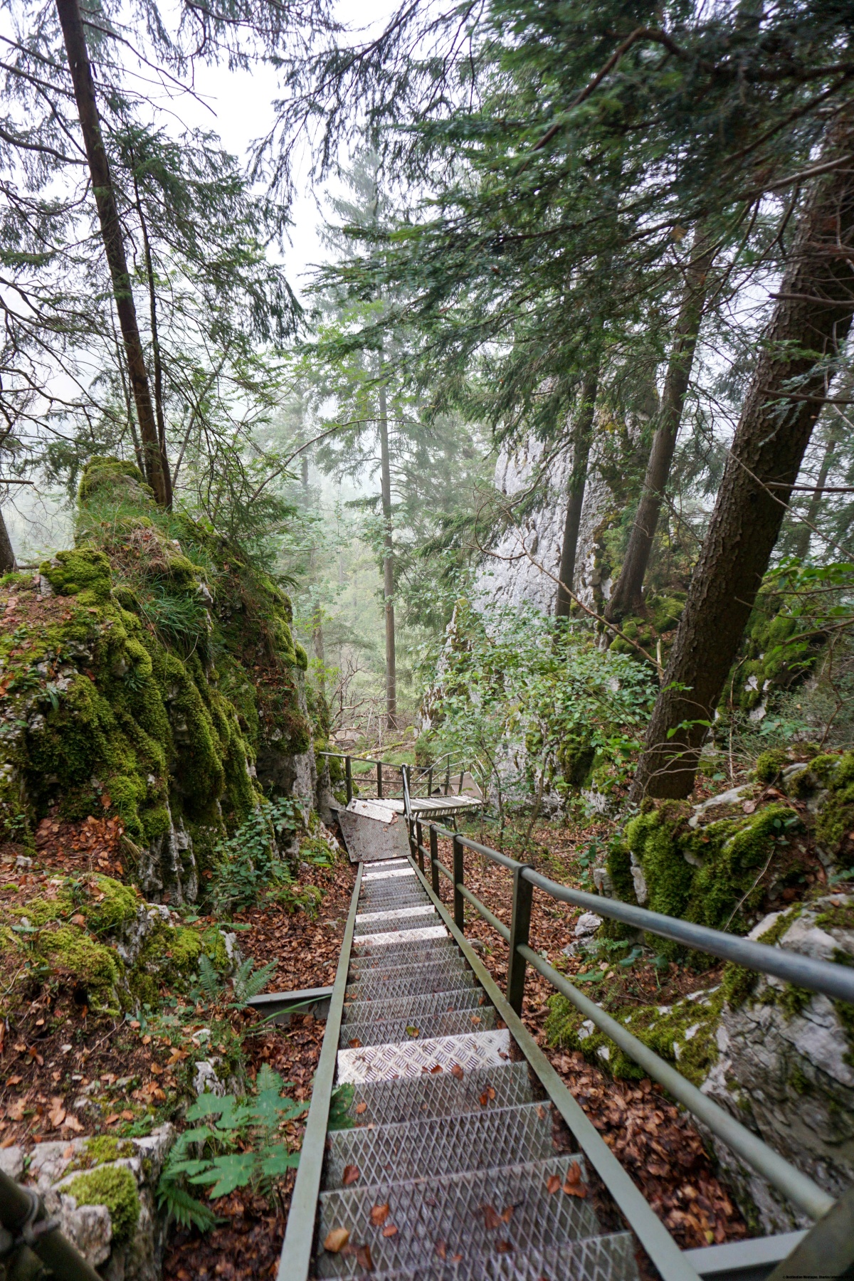 Von Moutier aus geht es bergauf zum Bauernhof Creux au Loup. Der Hang ist am Anfang steil, so dass der Anfang nicht einfach ist. Wenn man ansteigt, fragt man sich, wohin der Weg führen wird. Man hat tatsächlich einige deutliche Einschnitte, und man könnte damit rechnen, dass man in einer davon hinaufsteigen muss. Tatsächlich klettert man eine kurze Klappe am oberen Ende des Hangs hinauf. Wenn man durch den Forest Communale de l’Envers hinaufsteigt, wird der Hang steiler, je weiter man vorwärtskommt. Am Fuss der Wände angekommen, wird das Gelände ein wenig „alpin“ und man muss auf herabfallende Steine achten. Die Einschläge der Steine auf den Boden und die Bäume erinnern daran. Nicht weit vom Fuss der Wände erreicht man die Graitery Treppe, die insgesamt recht kurz ist. Nach der letzten Treppe ändert sich das Gelände und die Stimmung von Grund auf, da man sich dann in den Weiden des Graitery befindet.