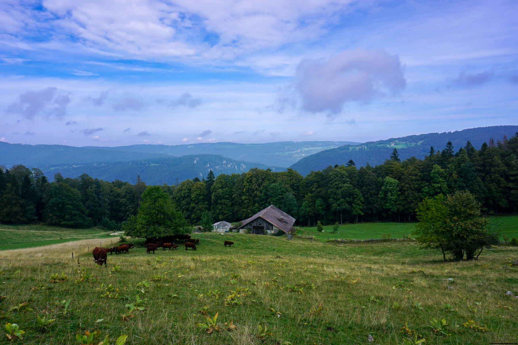 Nun geht es darum, Court zu durchqueren, wo man auf einem kurzen Abschnitt der Kantonsstrasse folgt. In der Nähe des Bahnhofs überquert man erneut die Birs, bevor man ziemlich steil nach Sous Pré Richard aufsteigt. Leider wurde der gesamte Anstieg trotz der Schikanen, die an jeder Kreuzung errichtet wurden, durch den Durchgang der Mountainbikes schwer beschädigt. Bei Sous Pré Richard muss man noch steil durch die Weide hinauf, bevor man die Auberge du Pré Richard erreicht. Danach folgte ich der asphaltierten Strasse von La Bluai nach Obergrenchenberg. Da es unter der Woche war, habe ich mich nicht allzu viele Fragen gestellt und wurde vom Verkehr nicht gestört. Bei schönem Wetter und am Wochenende wäre es besser, dem markierten Weg zu folgen.