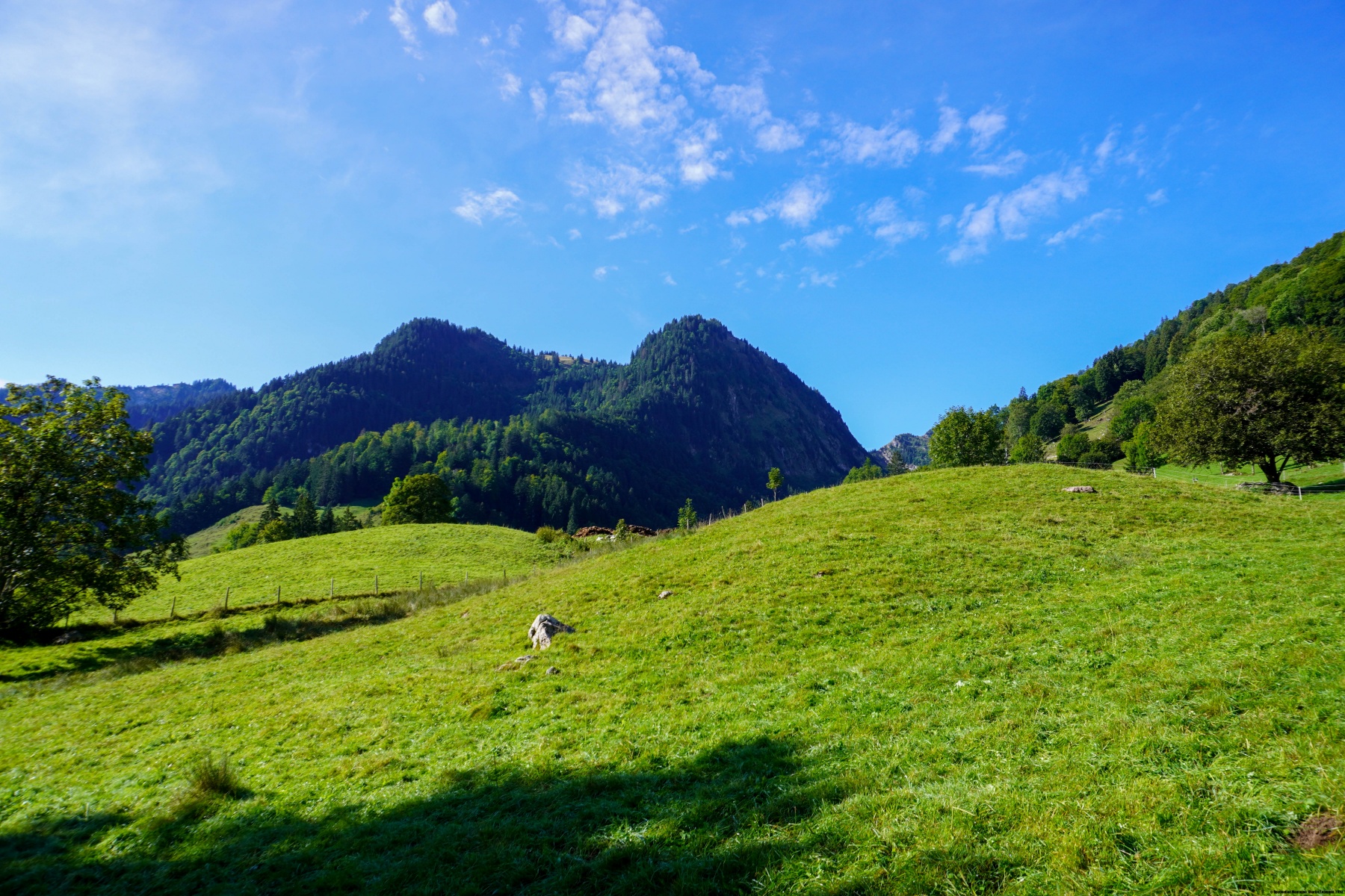 As you descend, you pass by the Joux and Cases chalets. As you continue, the valley opens a bit and when we reached the Croix de Fer, we followed the trail that leads to the other side of the valley and up to Pierra Devant and Les Mosses. It is interesting to note that a few years ago, the marked trail went this way. Now, the signs have been taken down and the markings have been removed. I do not know why, but when I spoke to the farmer, he confirmed that it had nothing to do with property or servitude issues. Apparently, they no longer wanted to maintain the markings.