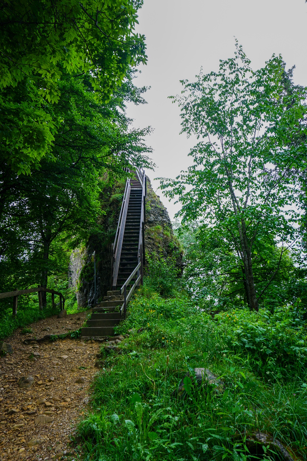From Guggisberg, a fully arranged path (cemented at the start, then with stairs and balustrade) leads to the foot of the rocky prominence. From there, a wooden staircase allows to climb the last few meters. It is interesting to mention that the first construction of such a staircase date back to 1828. Indeed, the owner of the hostel “Sternen” then sought to make out of the summit a tourist attraction.
