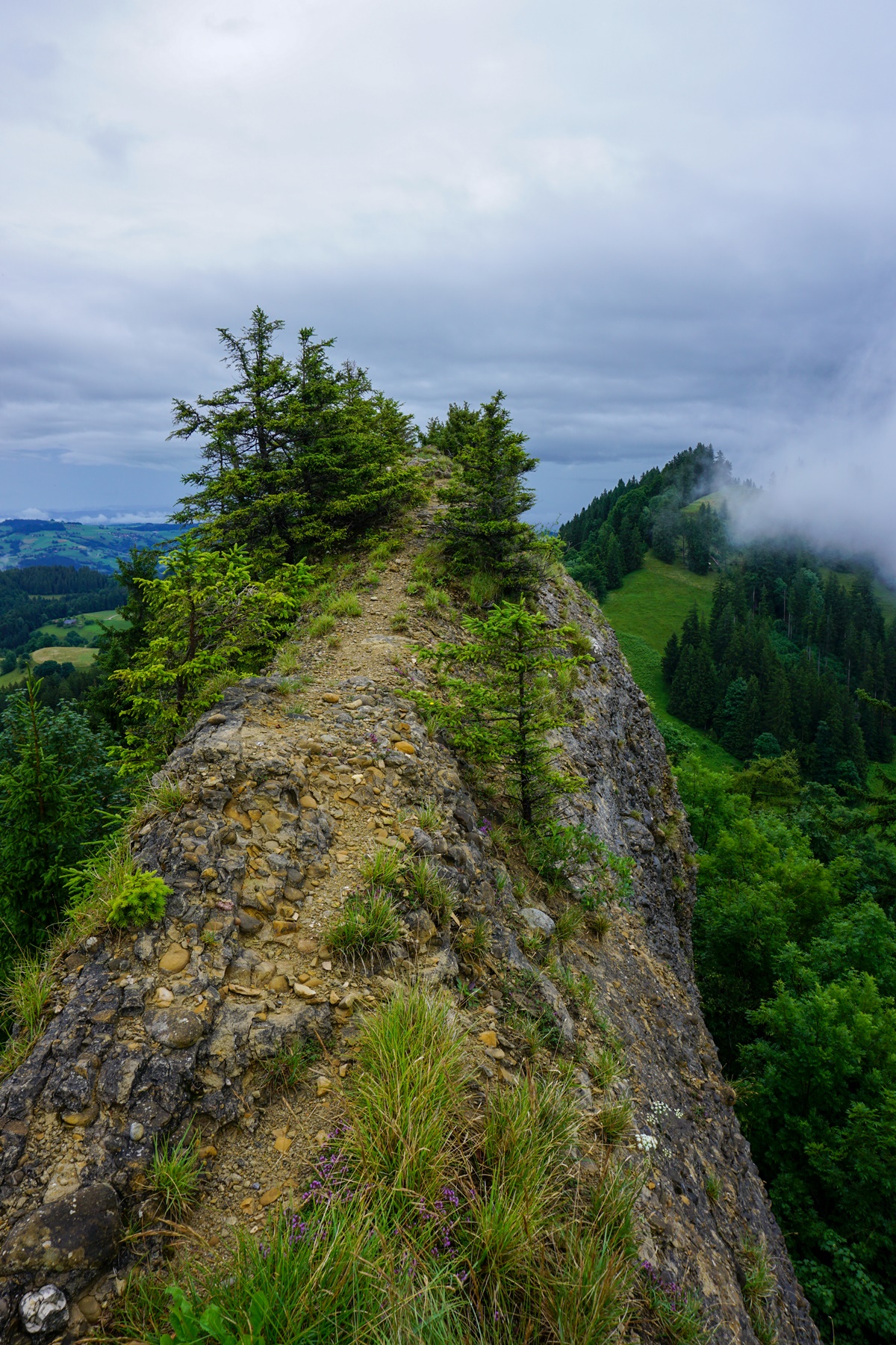 I only recently realized that this summit can be easily identified when looking at the Fribourg Prealps from the plain. Because, even if its altitude is nothing exceptional (1283m), it is well ahead and very isolated from the Gantrisch massif. It also has a camel hump shape which makes this peak easily identifiable. What is surprising is that unless you climb to the top, it feels like it is completely wooded. The top of the trees growing at the foot of the summit prominence is at the height of the summit. The other surprising aspect is that the summit prominence is a lump of conglomerate that looks like it sits there on top of the hill overlooking Guggisberg.