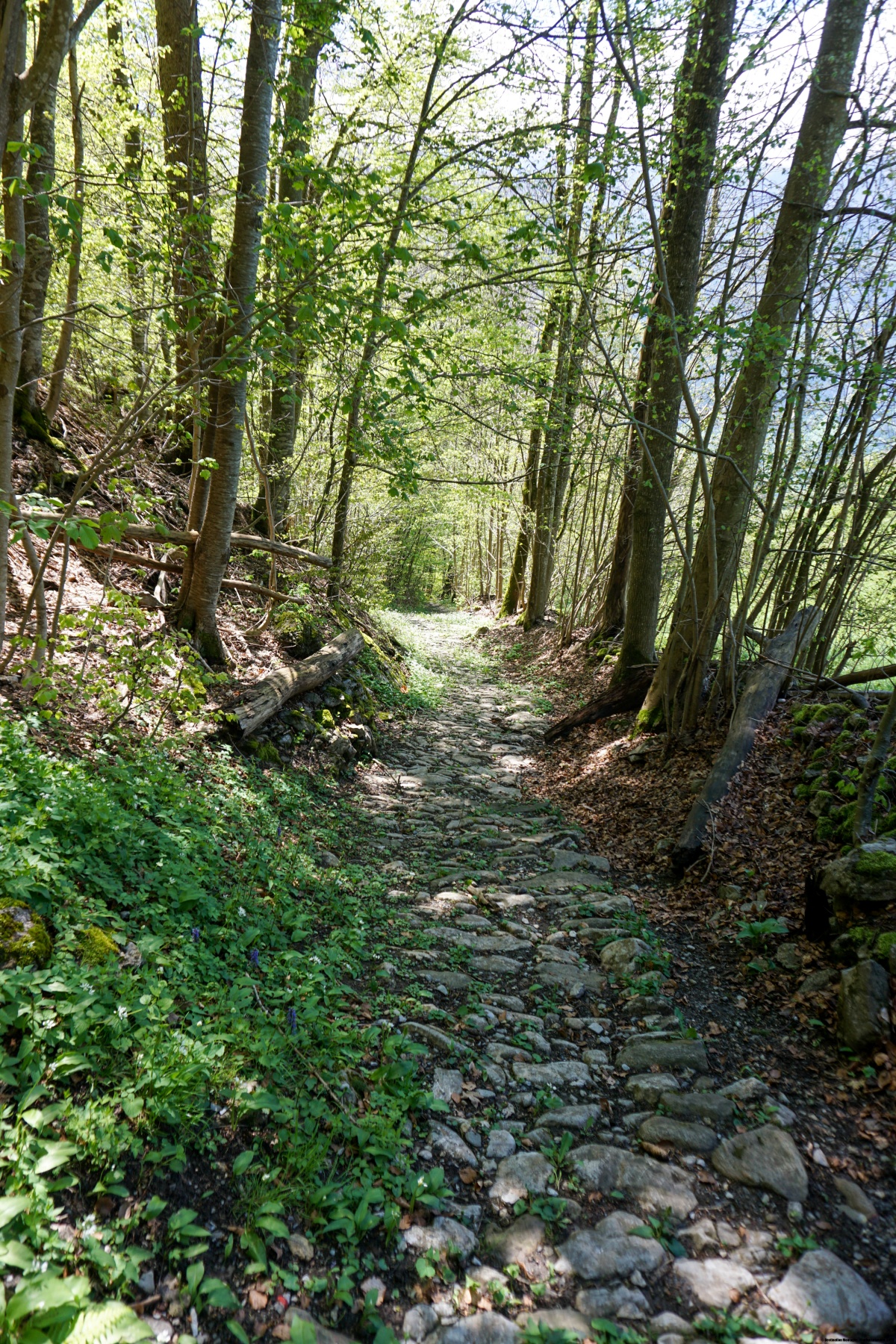 A little further up, you cross the road to the pass. It is not always easy to cross, as traffic can be quite heavy. On the other side of the road, the route follows a path that was used for the installation of rockfall protections. As a result, the path is quite rough and difficult. On the other hand, it becomes more pleasant a little higher, when you walk along the foot of the rock face.