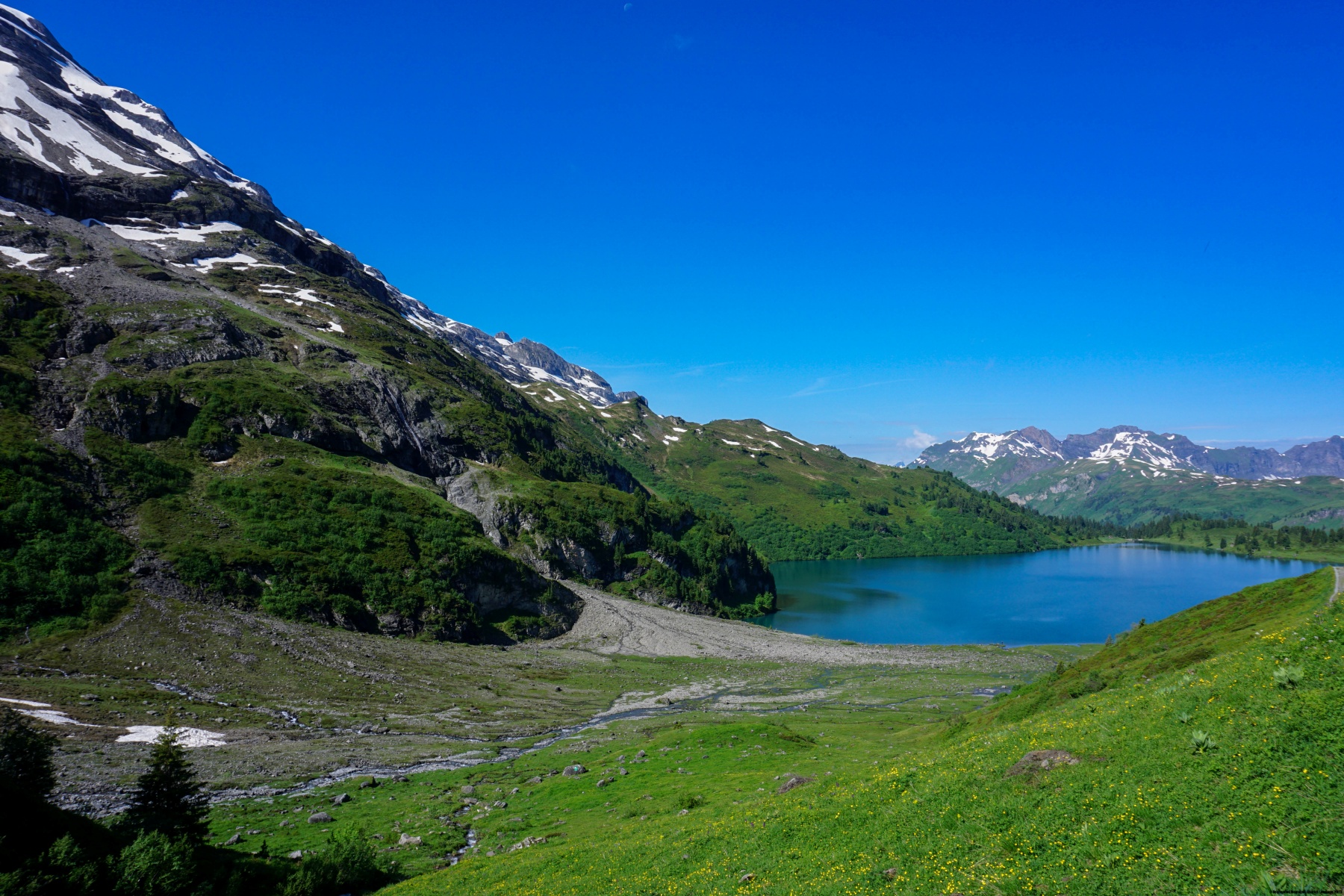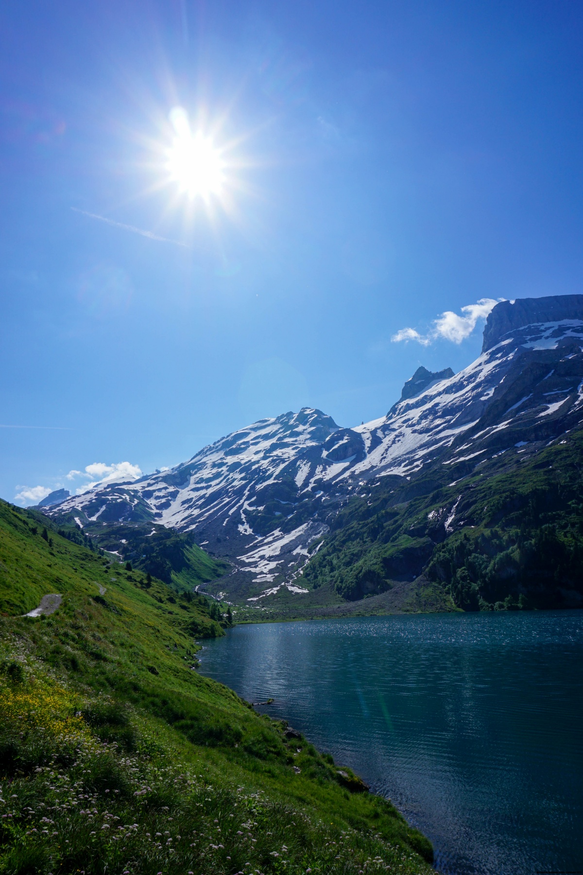 After reaching the chairlift station, you first hike down towards the Engstlensee. The Wendenstöcke seen from the lake shore look completely different than when seen from Engelberg. Looking back, you can see the Titlis, which shape has changed significantly over the last few years. Instead of having a beautiful, dome-shaped ice cap, the ice has receded, and the shape of the peak has completely changed. This change happened over the course of about 10 years, and yet some people still doubt climate change.