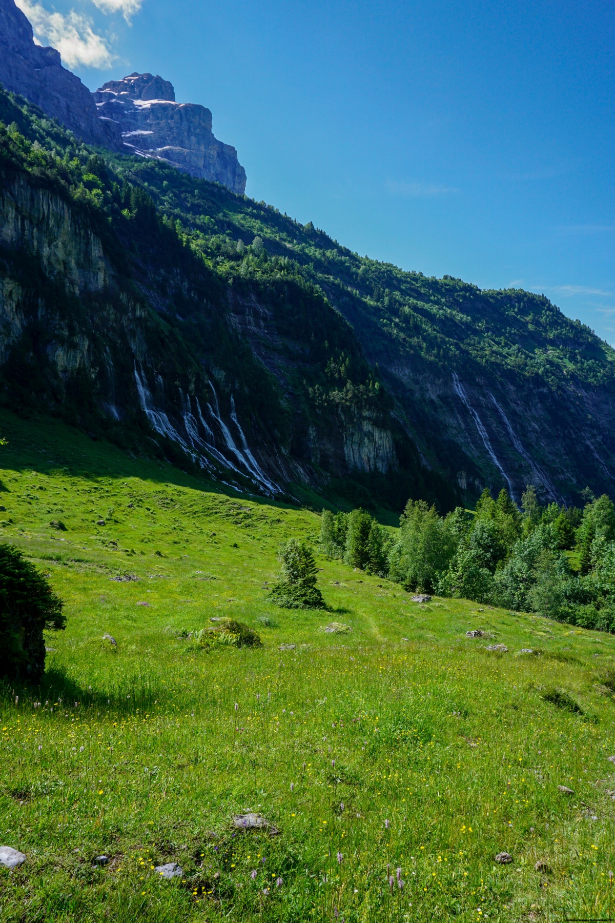 After a first descent, which is steep in places, one reaches a flatter part of the valley below Schwarzental. Before reaching this point, it is worth looking at a series of waterfalls that come out directly of the rock. They are called Jungibäch. I recommend doing this hike at a time when there is a lot of water, so either in spring or after a long period of rain.