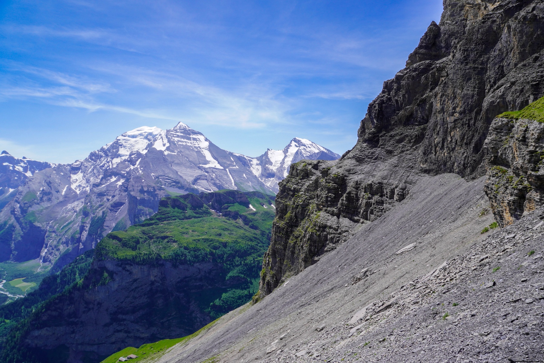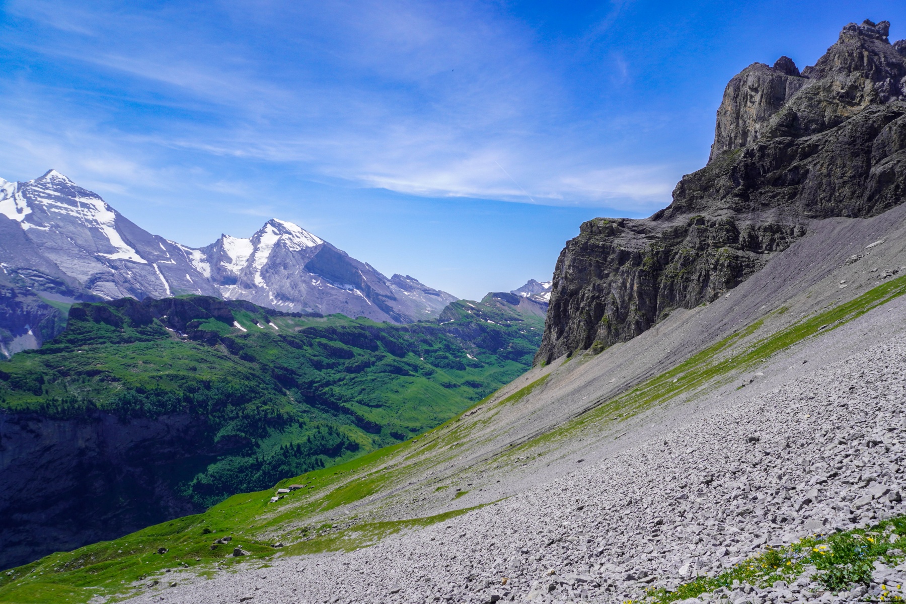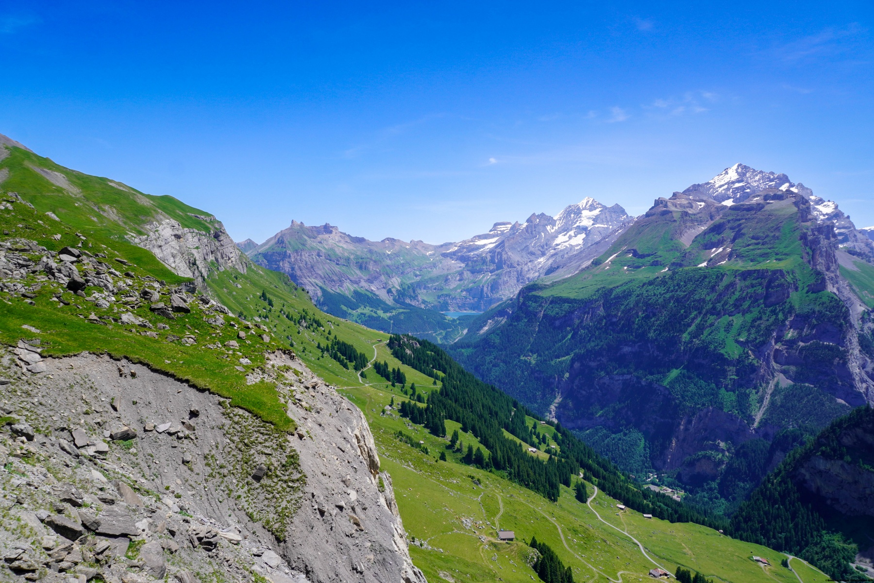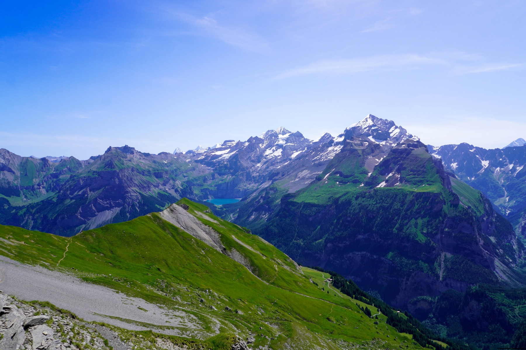 Malgré la chaleur et l’altitude du col, de franchir la Bunderchrinde a été une très belle expérience, à cause de la vue dont on y jouit. On se trouve alors en face de l’Oeschinensee et du Gasterntal.