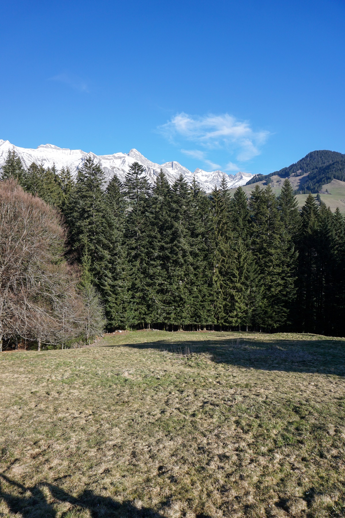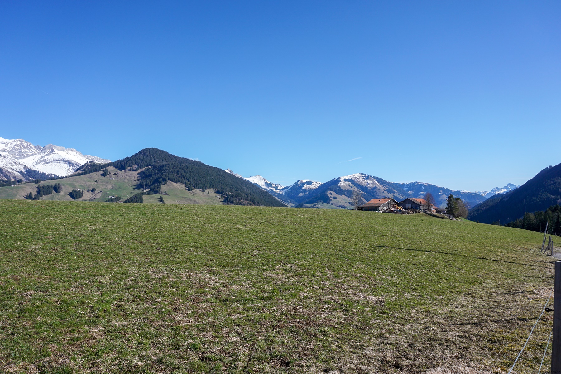 Admittedly, the cattle were not yet in the paddocks, it was tempting to cut across the meadow. However, in doing so, one muddies the shoes. This is why we finally opted for the paved road. It’s less fun, but it’s also less muddy. Following the road, one passes two camouflaged entrances. This is the artillery fort of La Braye, the purpose of which was to prevent the passage from the Swiss Plateau to enter the Sarine valley. The fort, completed in 1945, had two batteries of 4 guns each. The particularity was that one of the batteries was made up of guns on field carriages.