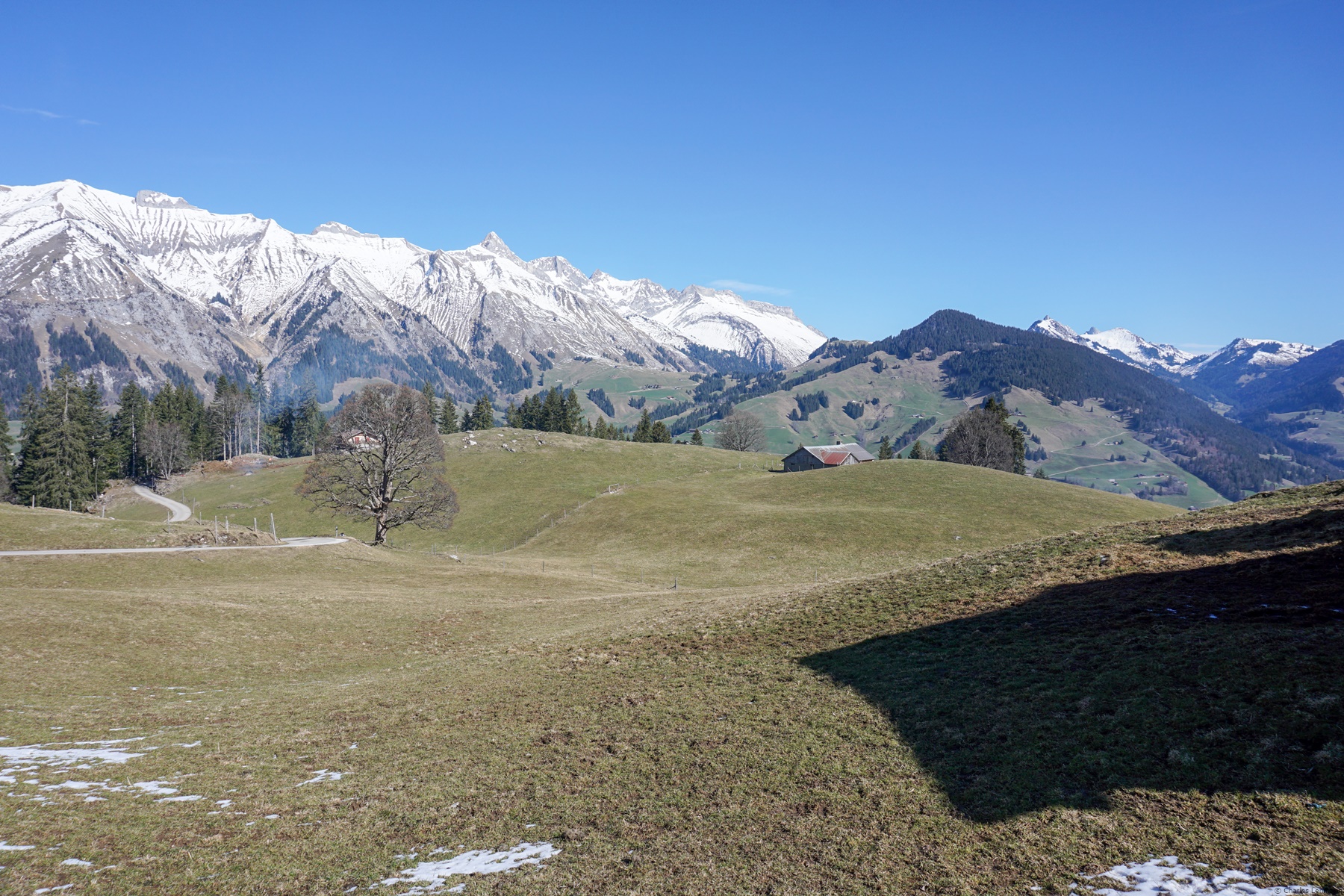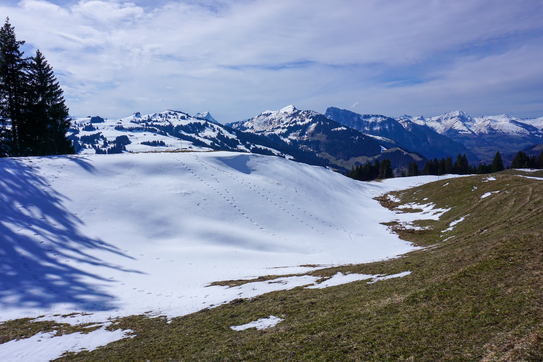 The entire high basin of La Braye, above Château d’Oex, was until recently used for ski slopes. The ski lifts were abruptly shut down during the 2017 winter season and the area has become a paradise for ski touring and snowshoeing (provided there is snow). The facilities are at a standstill, but the Cabane de la Sarouche has remained open, like the neighboring Cabane des Monts Chevreuils. The whole area is ideal for winter hiking, as there are very few slopes over 30°.