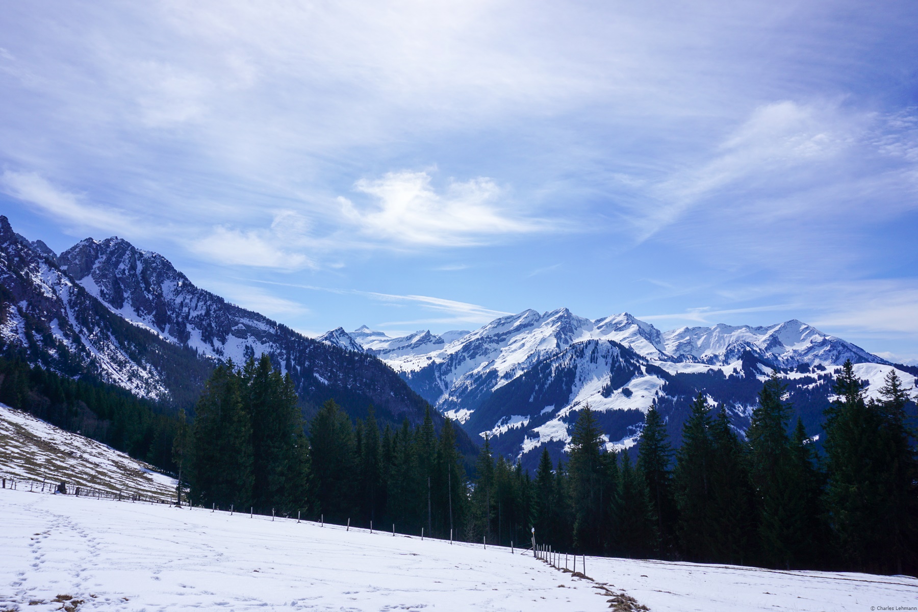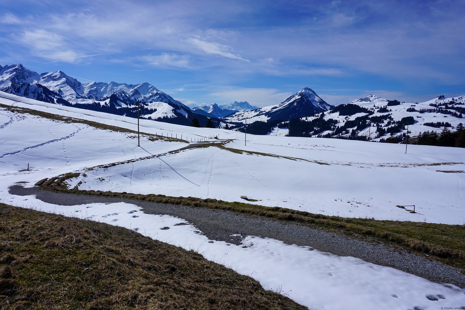 For this destination in the mountains of the Pays d’en Haut, it had been planned with the group to leave from Gérignoz to go up on snowshoes to the Cabane de la Sarouche. That was without considering the very weird winter we experienced. Normally, during this period, there should be enough snow, so that one can go up without having to carry the snowshoes by hand for a long distance (or even put them on from the bottom). This time it was nothing.