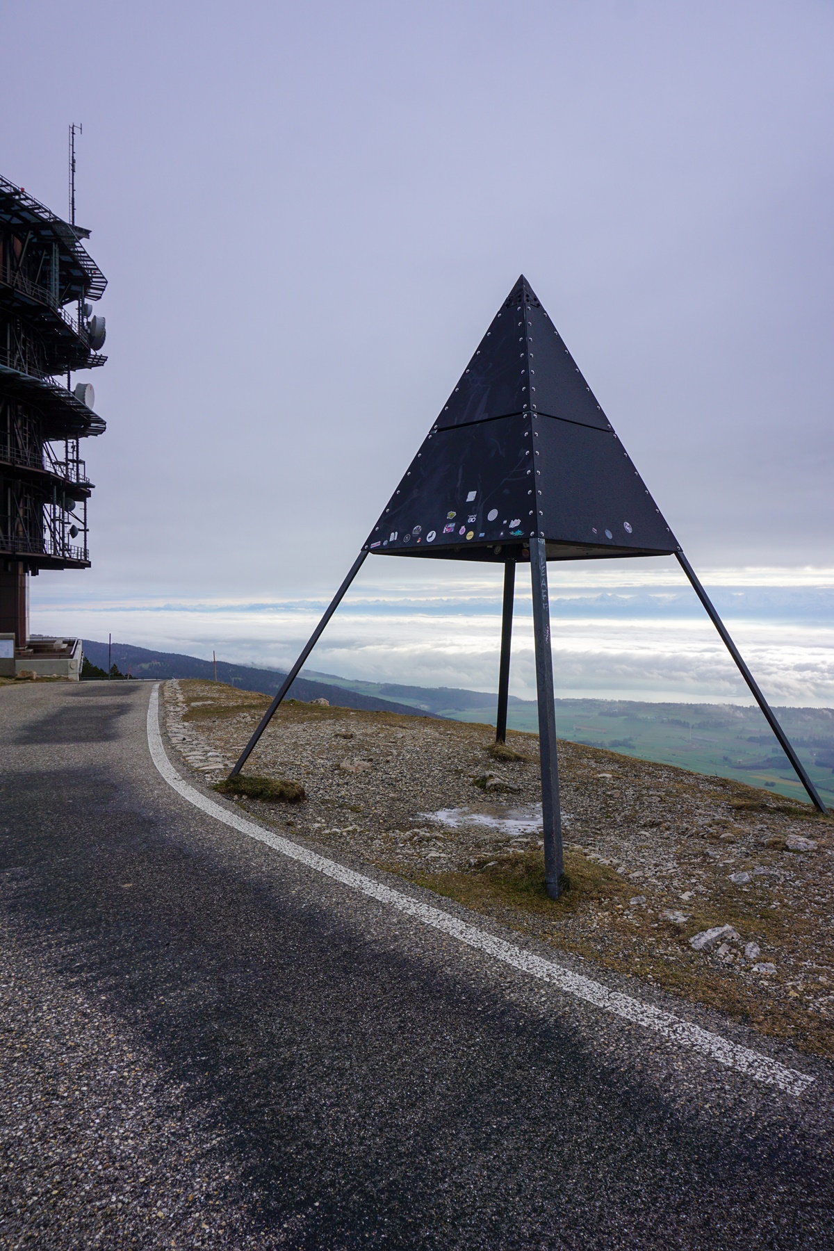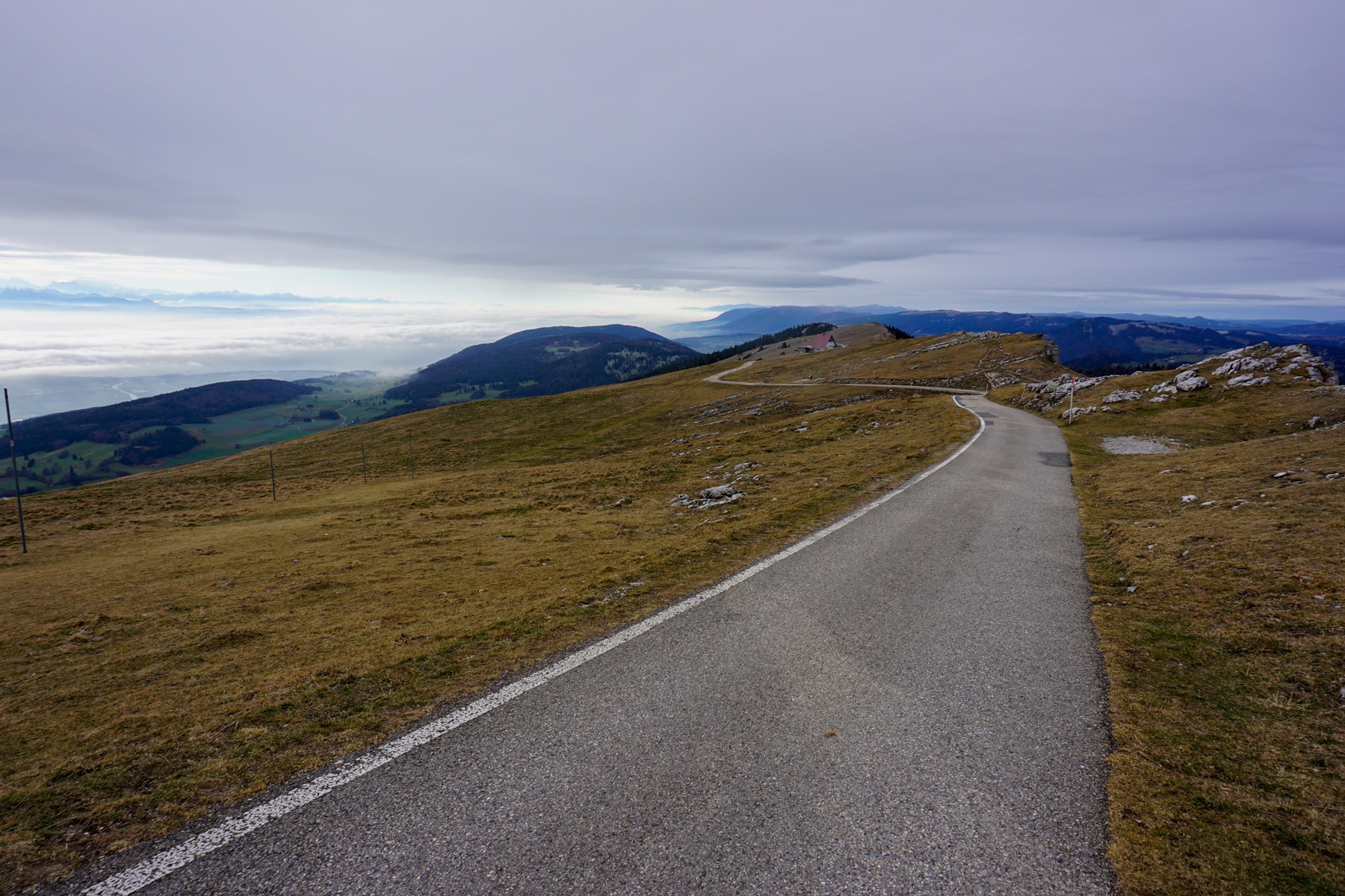 From this place, the continuation appears clearly: in path goes up in scarf the slope under the rocks. After crossing the rocks, one reaches the small, paved road not far from the Hôtel du Chasseral. Then just follow this road to reach the summit, marked by a geodesic signal located a stone’s throw from the tower.