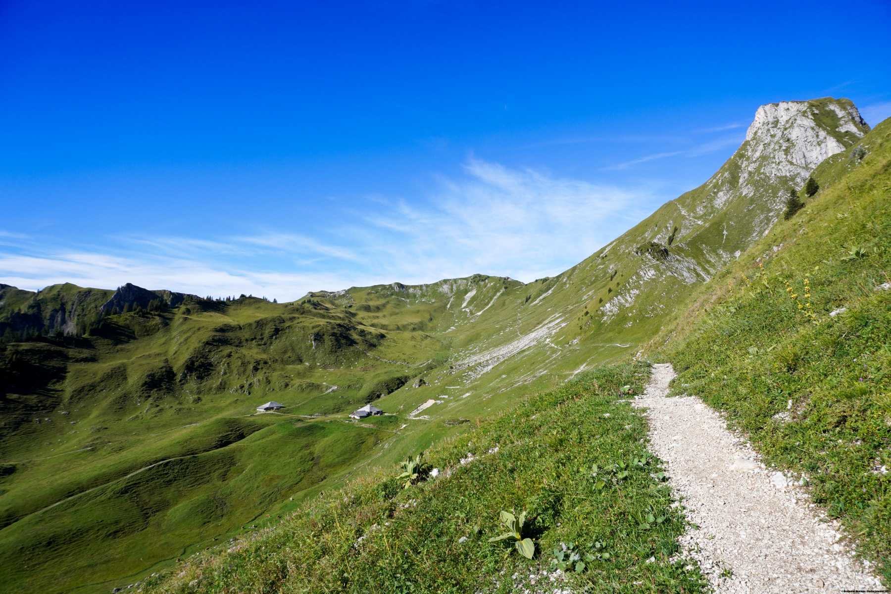 On the other side of the pass, you follow the trail that runs along the entire side of the mountain to the Oberi Walalp. The distance from the Leiterepass to the Walalp can seem intimidating, but if you take it slowly, it is not a problem. In addition, the views change as you hike along. You pass under the peaks of the Grossi Nüneneflue and the Homad, as well as the two small peaks of Chatz u Mus (the cat and the mouse).