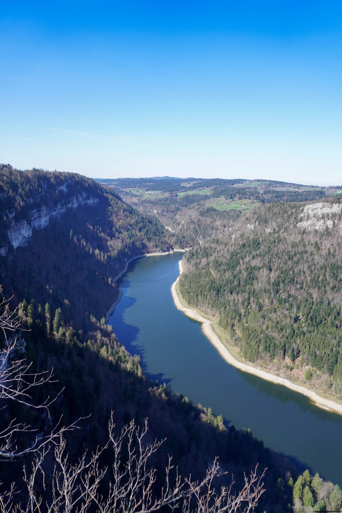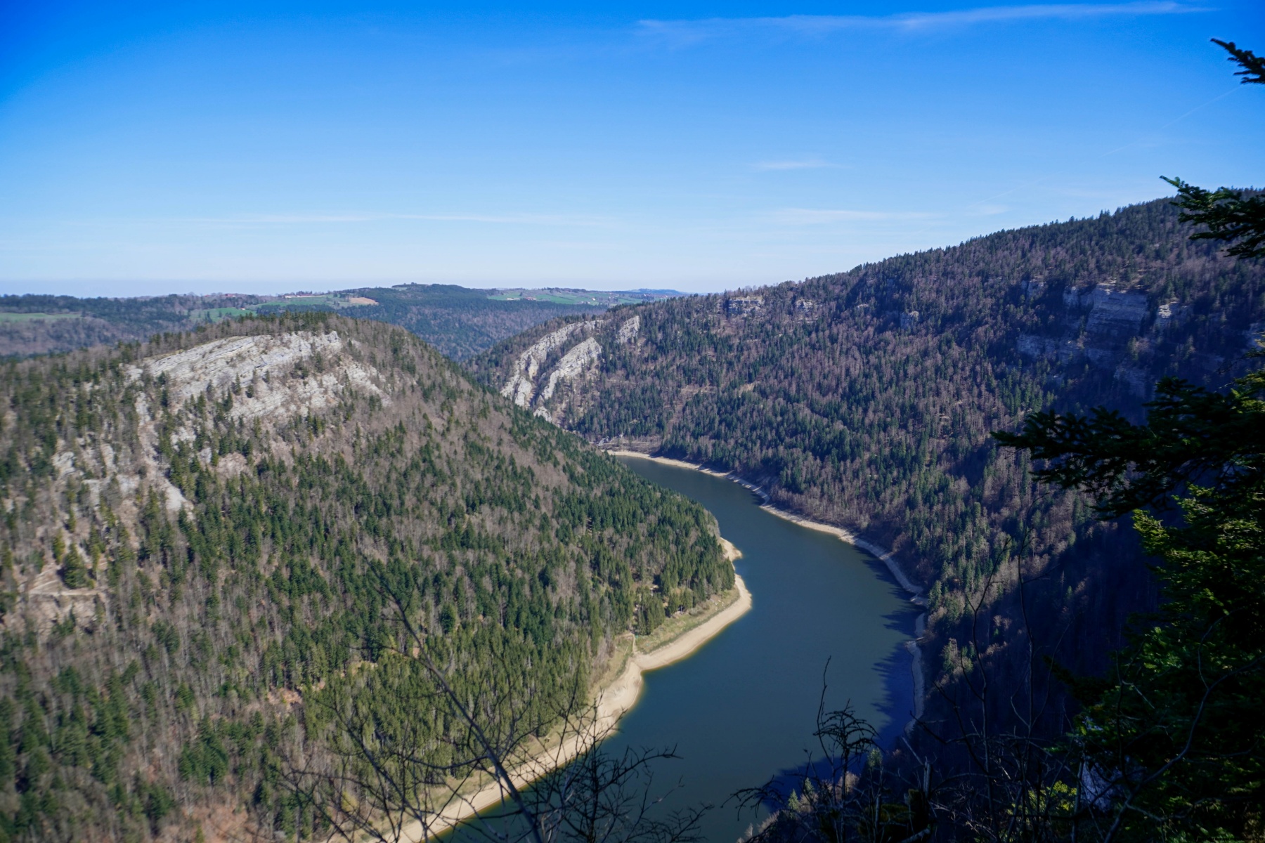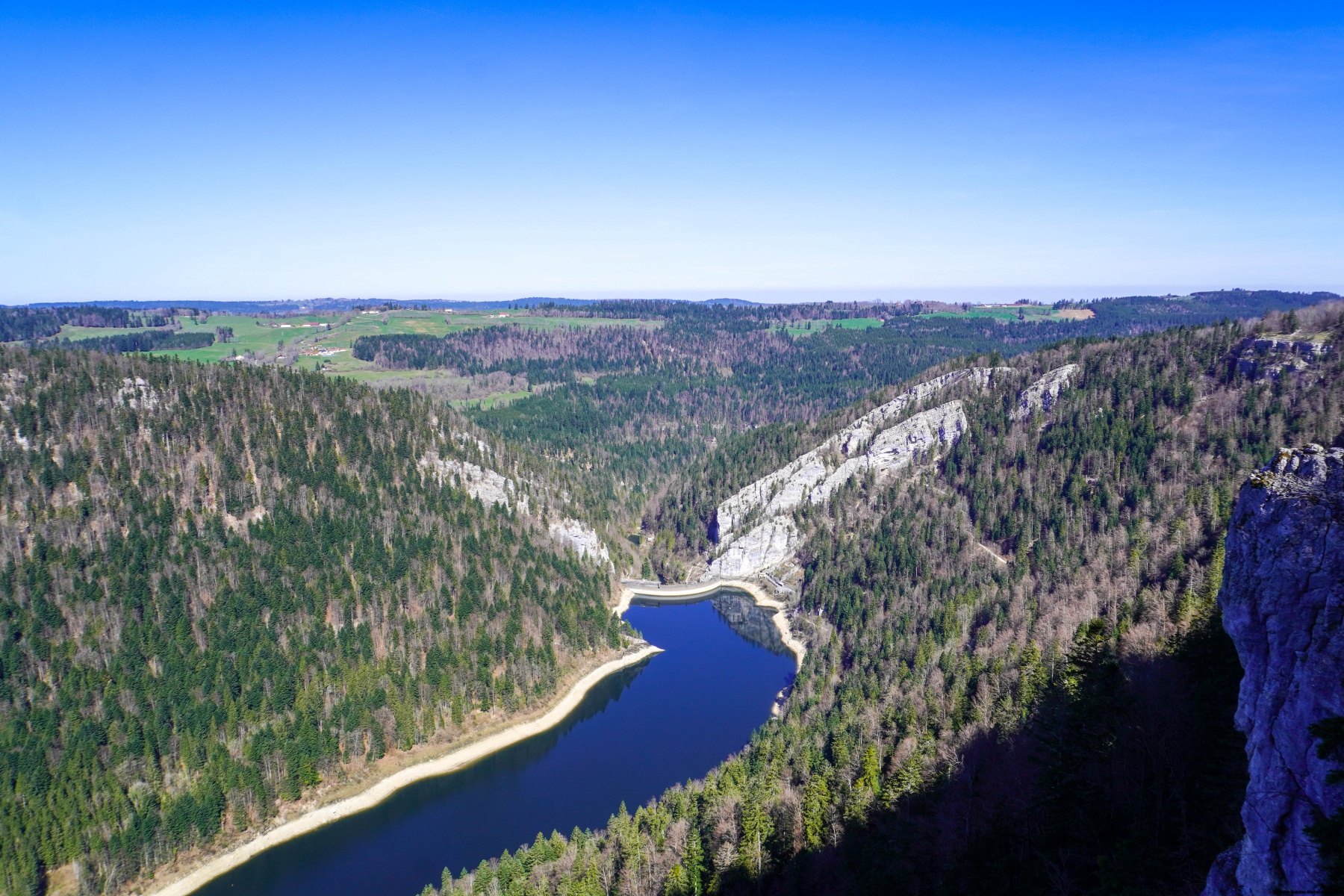 Nous étions donc partis de la Chaux-de-Fonds afin de grimper à Pouillerel et passer près de la ferme du Maillard. Après être descendus depuis les Saignolis, nous étions passés près de la ferme de La Galandrure afin de suivre le sentier descendant de manière assez raide en direction des Roches de Moron. Lorsque l’on arrive sur un terrain un peu plus plat, un large chemin forestier part à flanc de coteau pour se muer, plus loin, en un sentier assez étroit. Peu après le changement, il vaut la peine de descendre un peu pour rejoindre le Belvédère du CAS donnant directement sur le Lac de Moron. Peu après, on traverse un petit pont enjambant une ravine pour poursuivre de manière assez aérienne le long de la vire. Les points de vue très dégagés sont rares, car la végétation cache passablement le paysage. Ce n’est qu’en quittant les vires que l’on rejoint, après une courte montée, le Belvédère des Recrettes, autre point de vue bien dégagé sur le Doubs.