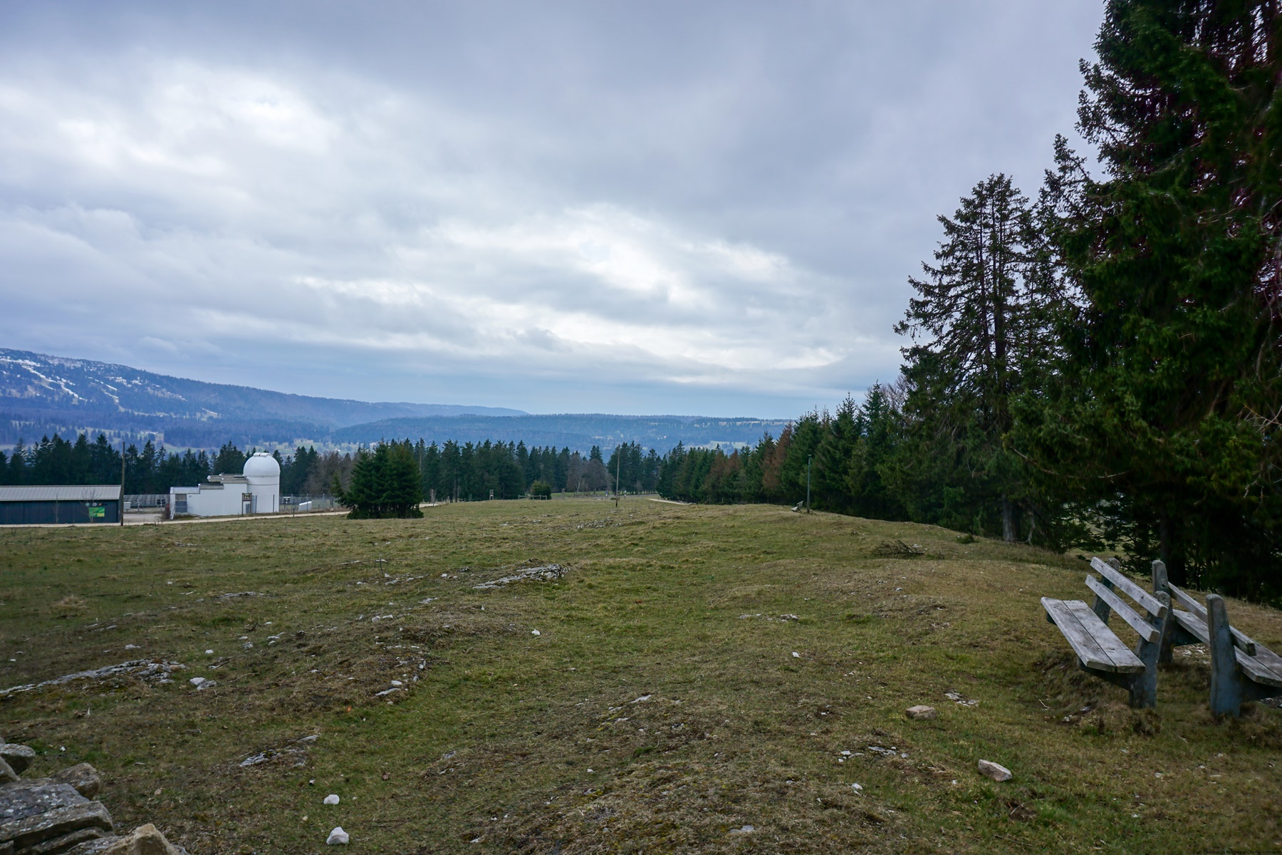 To get there, I drove up from Saint-Imier. It is not the shortest route, but it allowed me to see what the road was like going up from this village towards Mont Soleil. The road is narrow, and one must anticipate the possibility of having to cross on the climb: the possibilities of avoiding are not numerous. I parked not far from the astronomical observatory, at the foot of the first wind turbine.