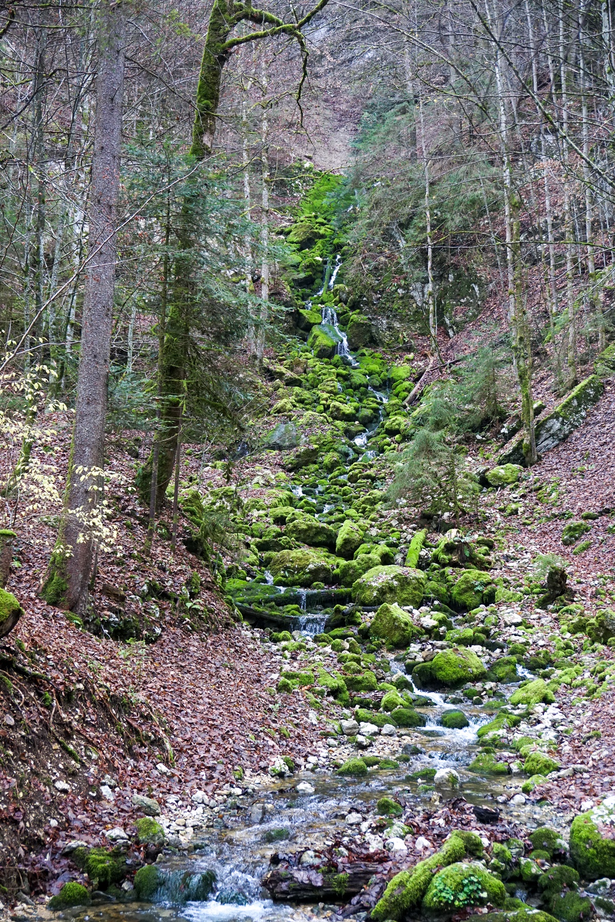 I would rather recommend following the Suze on the left bank for a while to cross it just below the castle. One then heads towards the bottom of a small steep-sided valley. This valley is closed by a rock wall from which exits the water of a small torrent flowing into the Suze. A small bridge allows one to cross the torrent and reach the foot of a steep slope in which the path rises by making a few switchbacks. After the last bends, it does not take long to find the first route which evolves on a comfortable forest path.