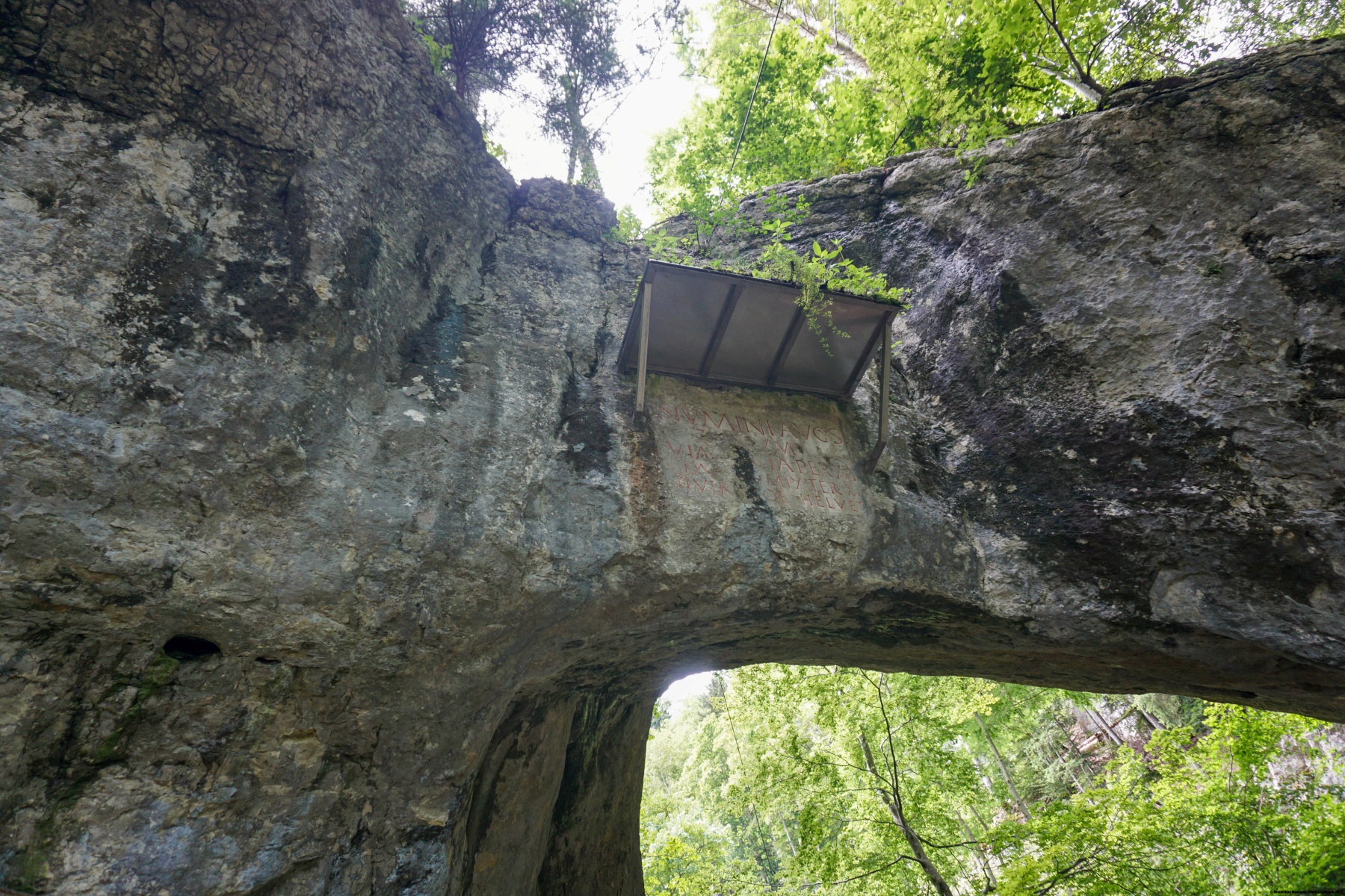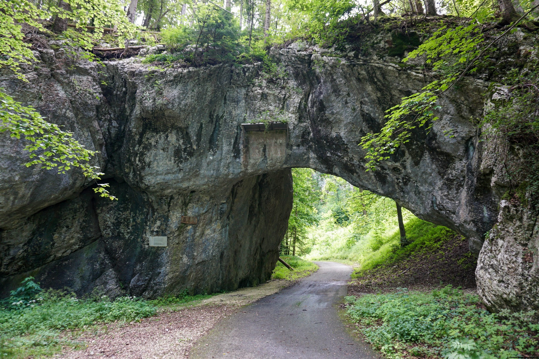 From the Werdtberg, we followed the marked trail down to Tavannes. When we arrived in Tavannes, we went to the Source de la Birse instead of getting back on the train. From the Source de la Birse, it is worth going a little way up the old road to the Pierre Pertuis pass. You then cross under the arch, which is partly natural, and give the pass its name. The front of the arch has a Roman inscription that attests to the importance of the mountain pass at that time.