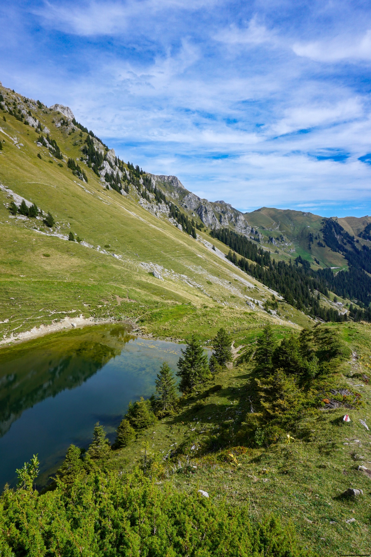 After descending from the top and reaching the small pass, I decided to descend towards Riprächtbochte. Even if the terrain is steep, there are good traces to follow. Sometimes it is difficult to distinguish it from the traces of gullies, but if you are not on the right route, you will soon notice. Once above the basin, it is possible to cross the slopes to reach a trail marked on the map and clearly marked on the ground. Following the trail, it is not long before you reach the small lake of Schattigseeli.