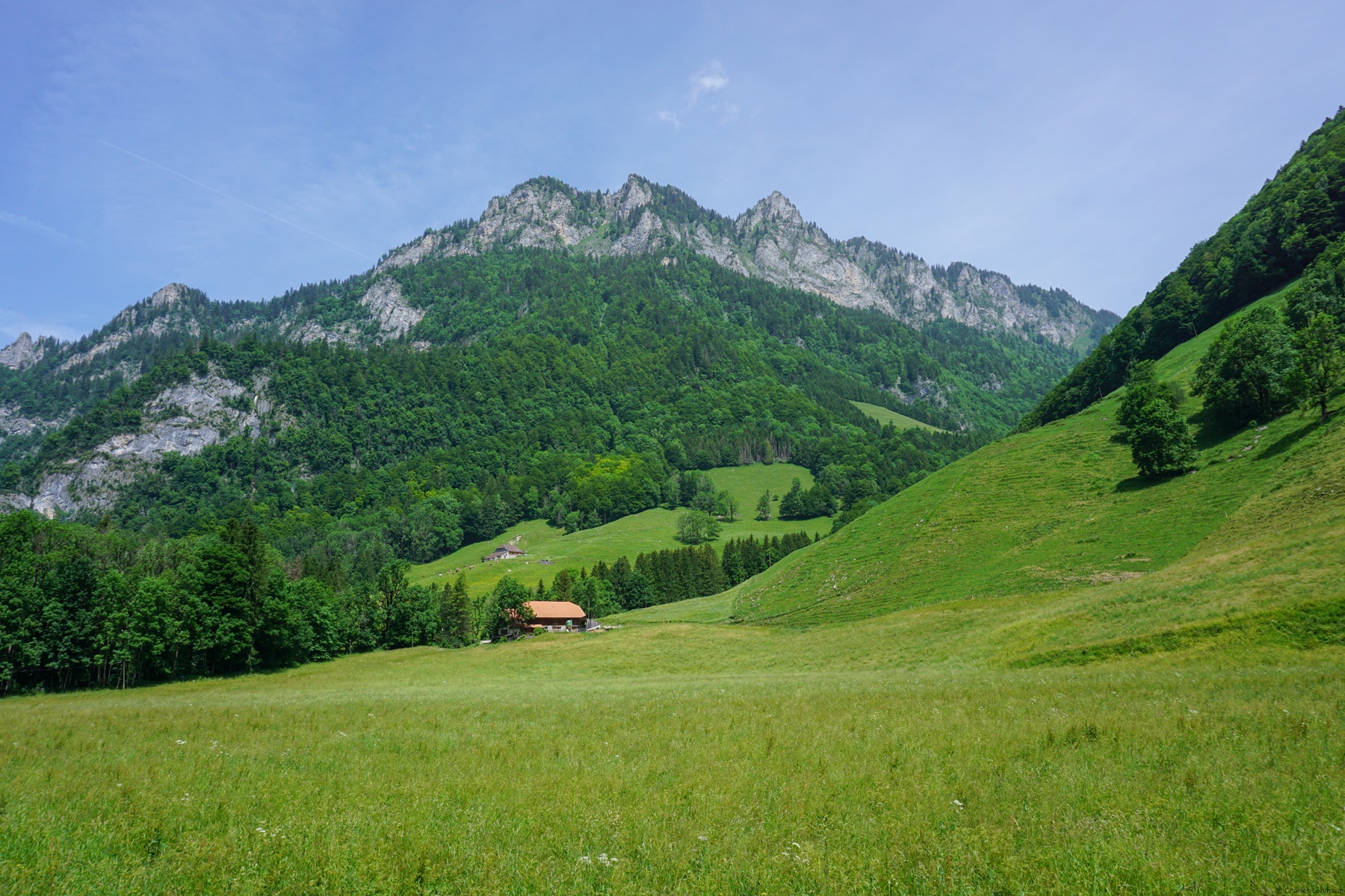The next stage along the Alpine Panorama Trail took us from Broc to Jaun. Finally, when I say took us, I should rather say, was supposed to take us to Jaun. Indeed, this sunny Sunday, traffic was heavy on the Col du Jaun road. Alas, the path, starting from Tzintre (Charmey), does not deviate very much from the road. The perceived nuisances are therefore particularly significant. In addition, the weather forecast predicted a risk of thunderstorms with severe potential that day. This is the reason why we cut short by stopping at Im Fang (it shortened the day by a little hour). We did well because, and we learned the same evening, a mudslide had later crossed the road at Charmey, the Gorges de la Jogne path must have been temporarily closed and the under-track passage of the station of Bulle had been under the water.