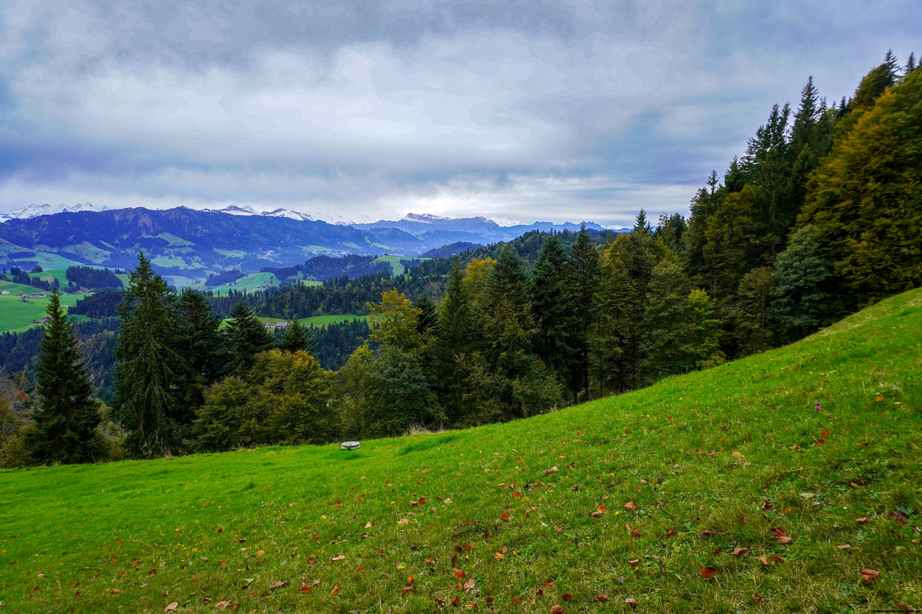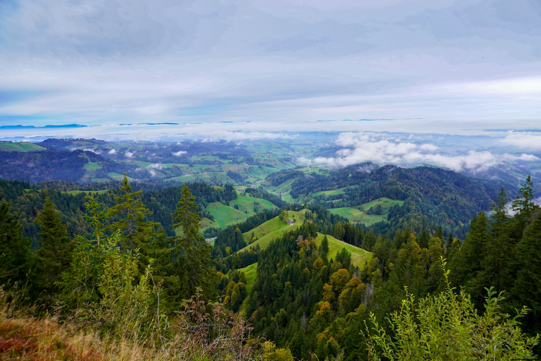 The trail from the bus stop leads up to Napf, following a small stream at first and then making many turns. After 300m of elevation gain, you reach a small meadow where the Napf restaurant is located. The view from the top is panoramic and you can see the Jura as well as the Alps. The Central Swiss Prealps are not far away either.